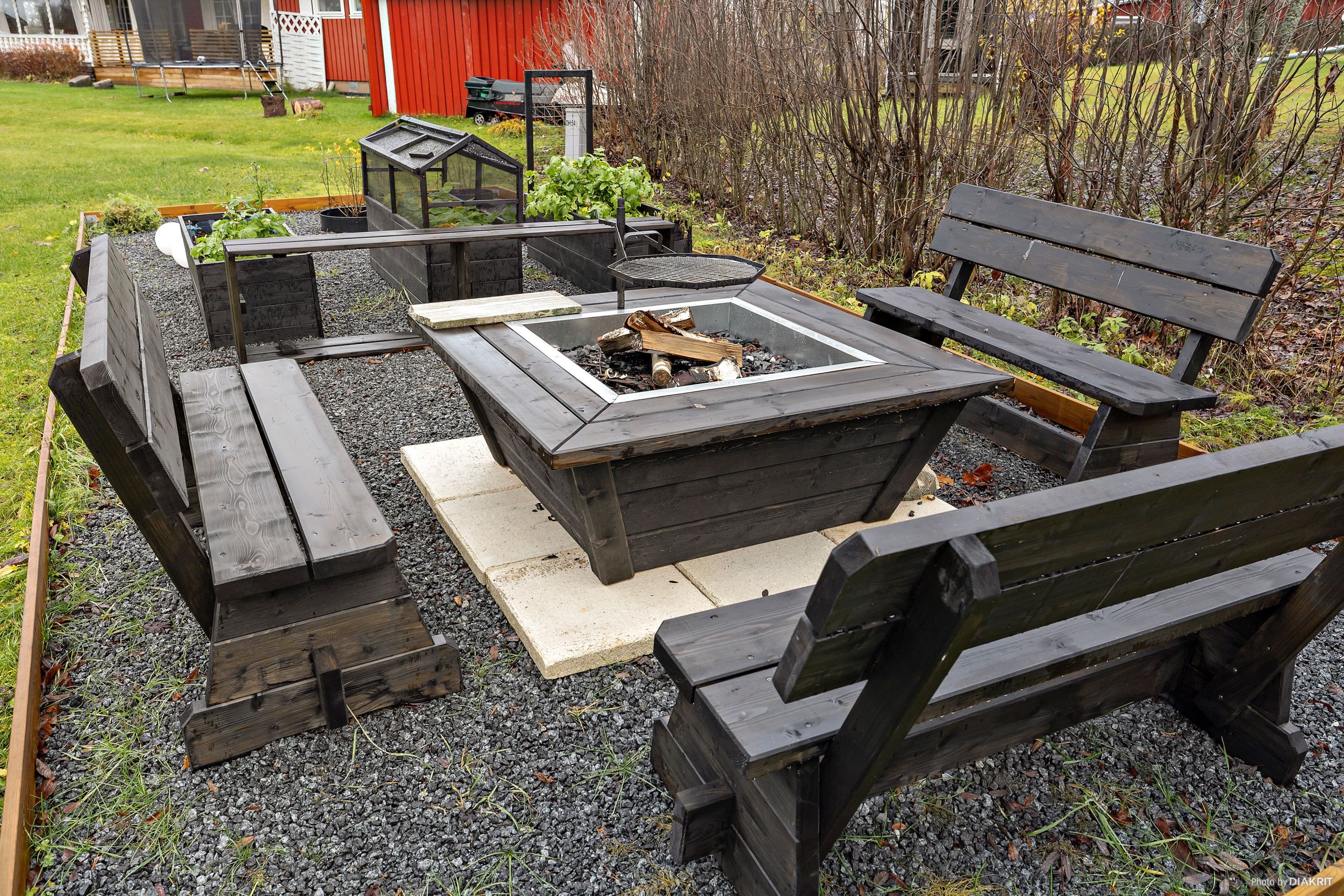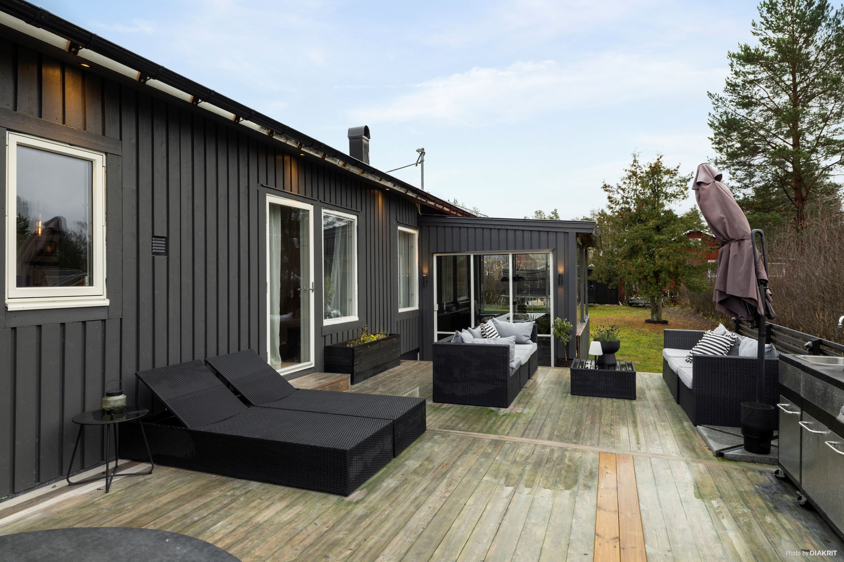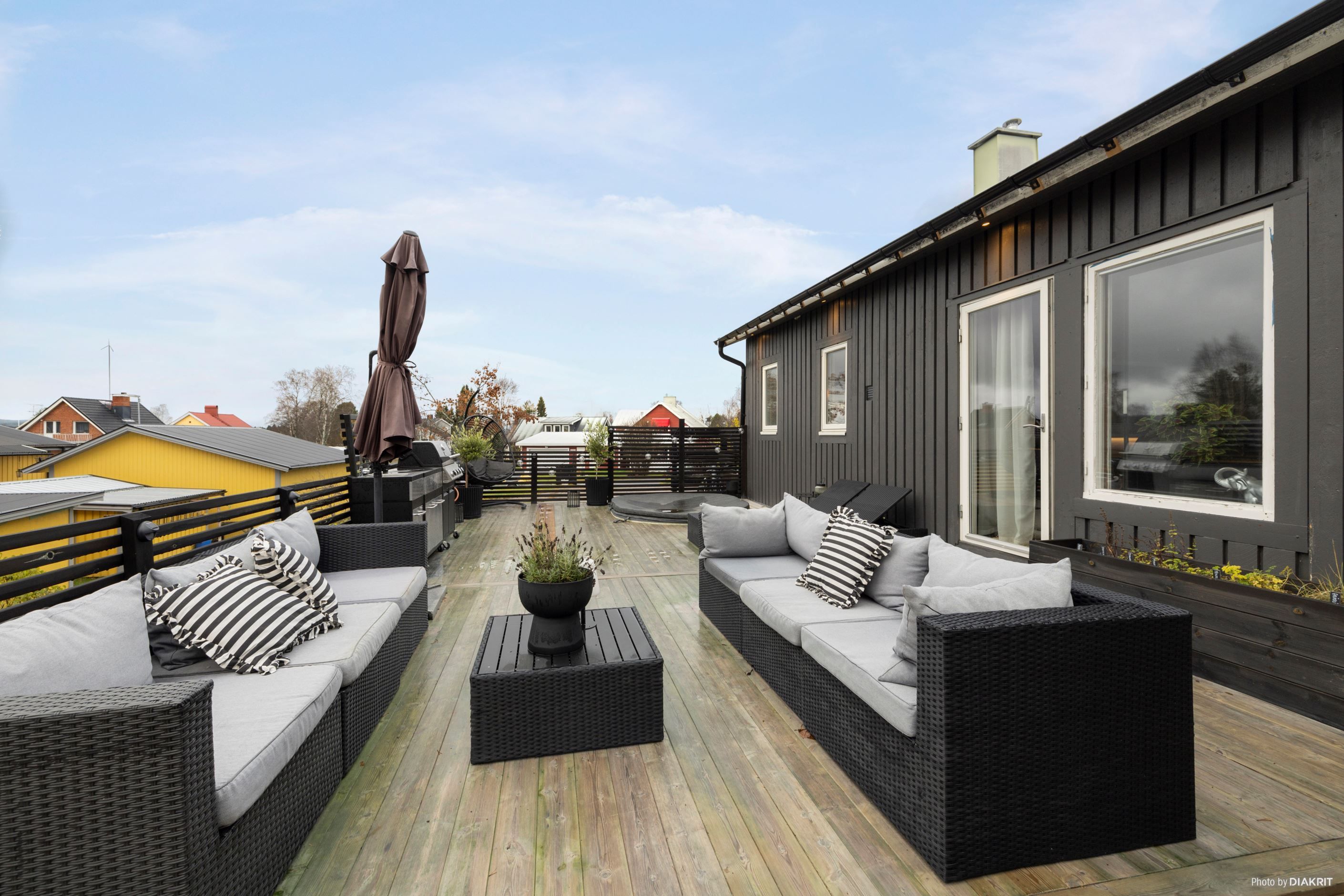 Tomten om 1 513 kvm erbjuder gott om plats för både lek, odling och avkoppling. Det inglasade uterummet förlänger säsongen och leder ut till en generös trädäckad altan med inbyggt spabad. Uppvärmningen sker via fjärrvärme och på tomten finns även ett garage.