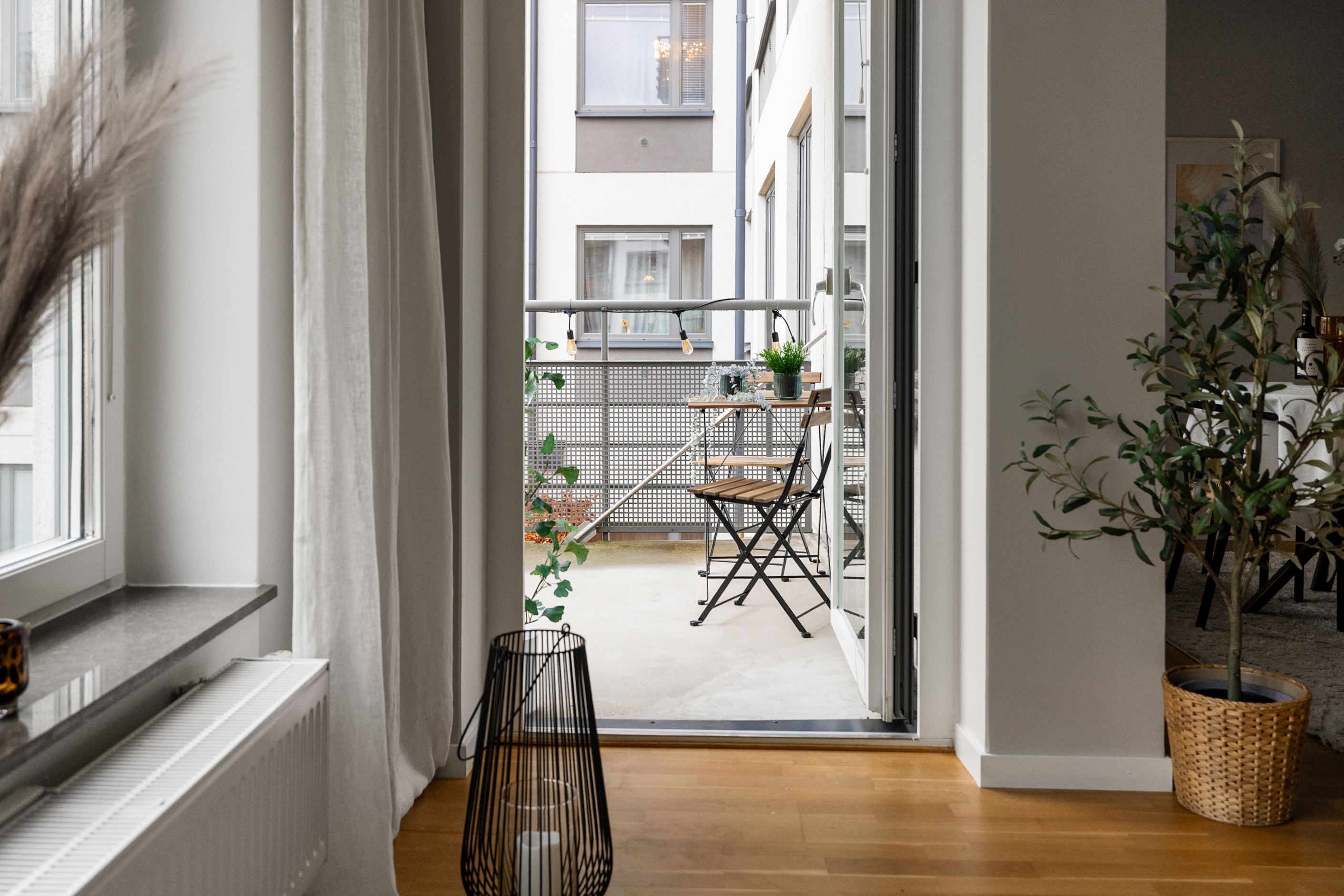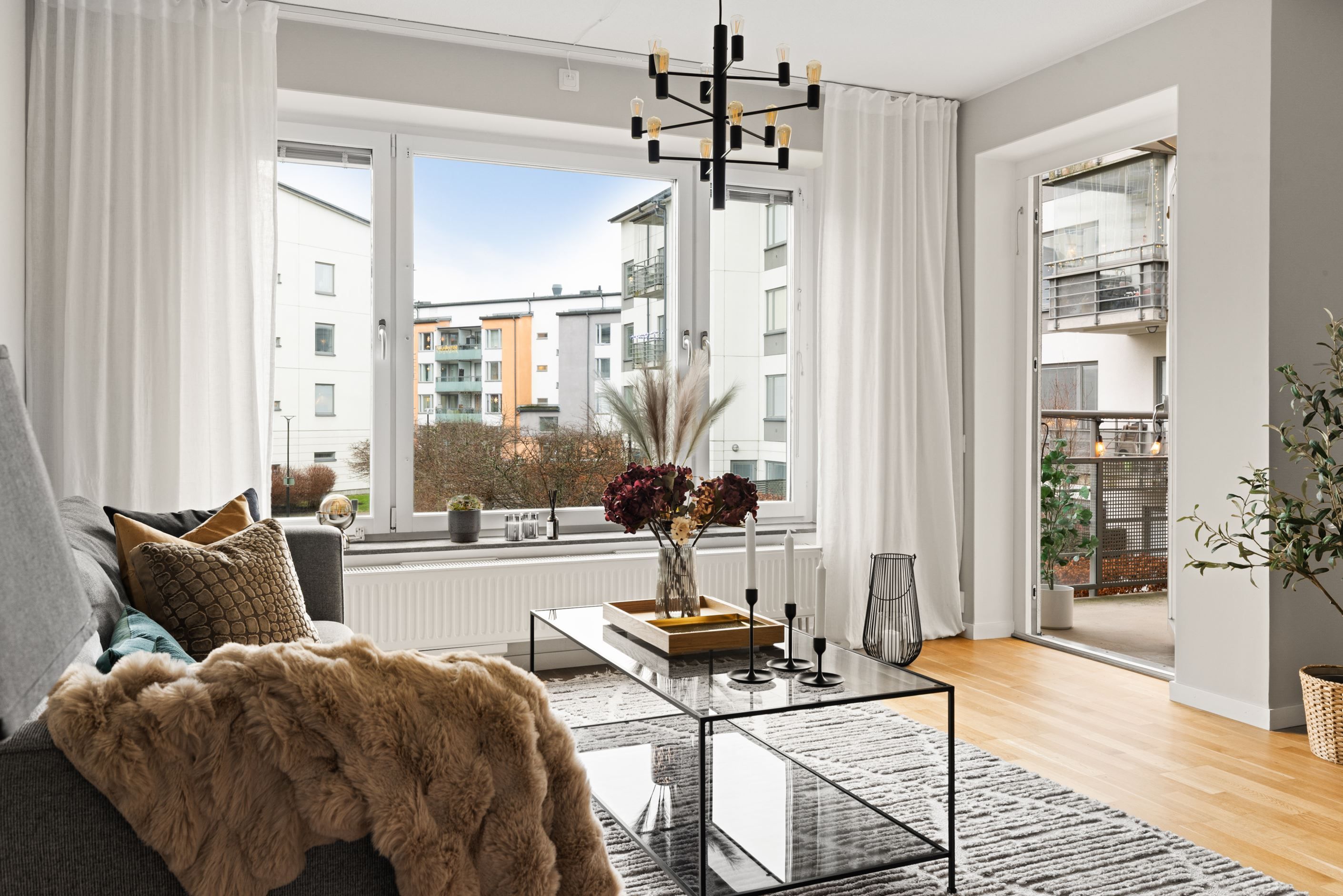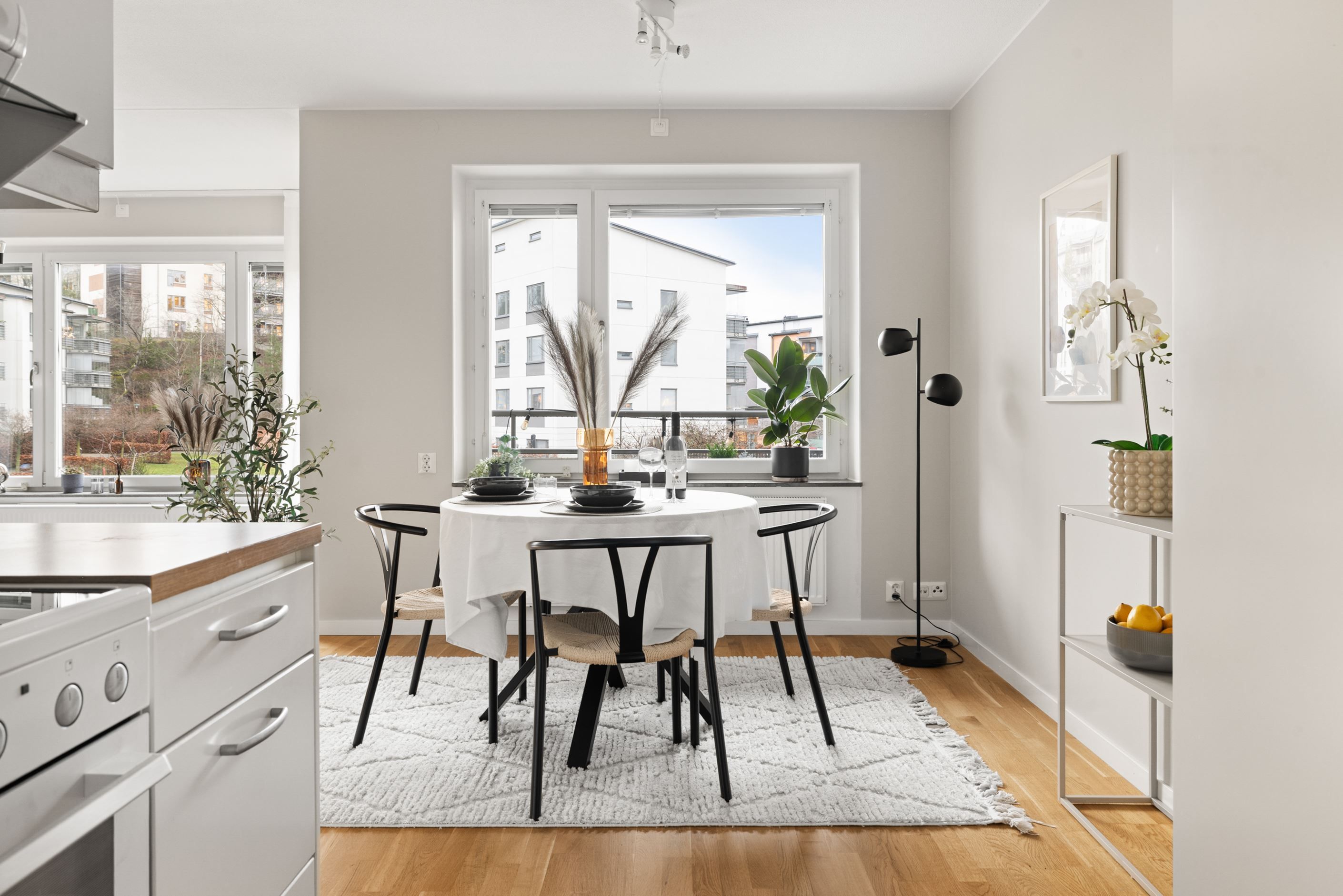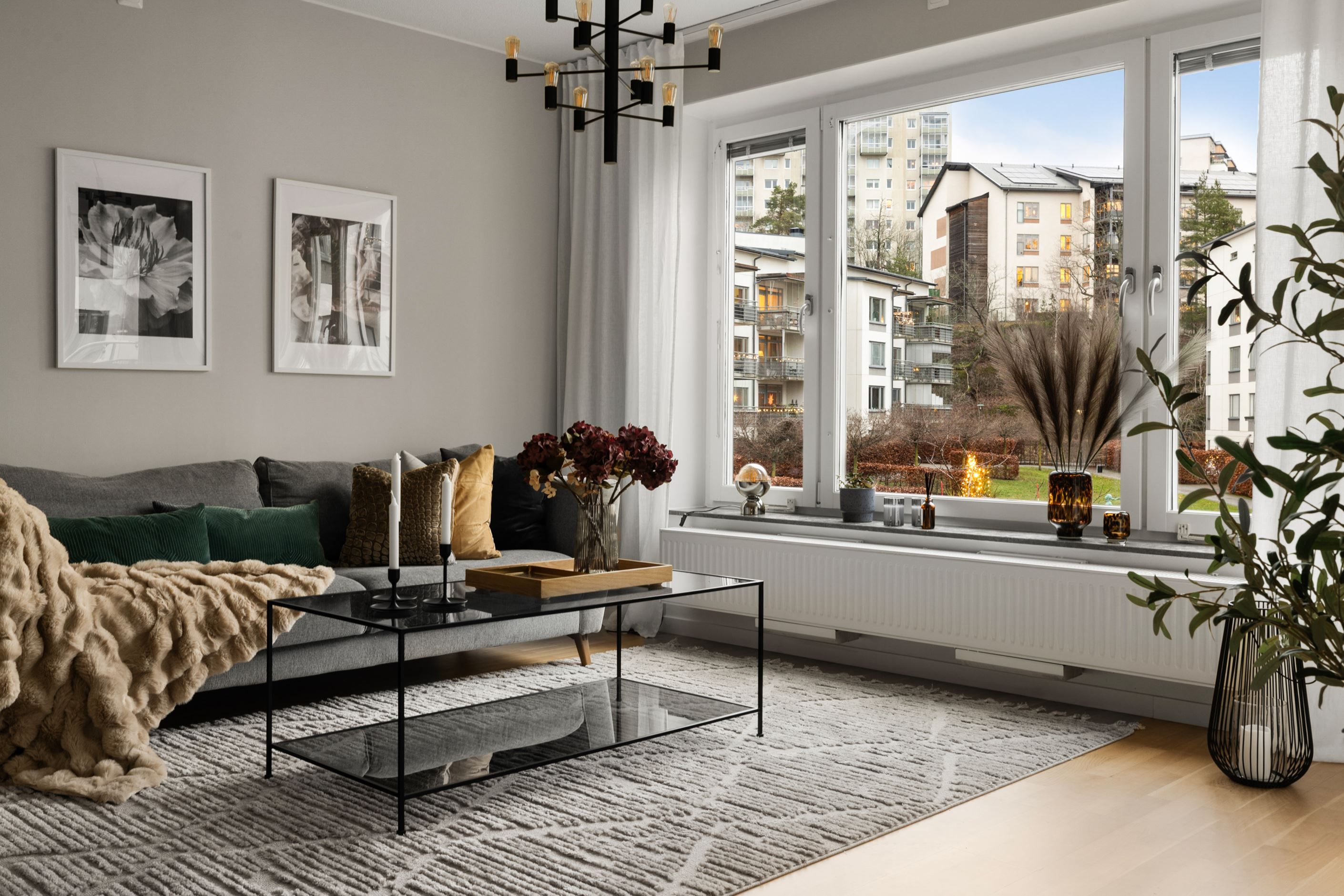 Lägenheten har öppen planlösning mellan kök och vardagsrum, vilket skapar en social planlösning perfekt för middagar och umgänge med vänner, här finns gott om plats för både matgrupp och rejäl soffgrupp. Genom vardagsrummet nås en härlig och solig balkong med utsikt över föreningens omtyckta och grönskande innergård. Lägenheten präglas av tidlösa materialval med ett helkaklat välutrustat badrum och genomgående parkettgolv som ger en enhetlig och exklusiv känsla i hela bostaden.