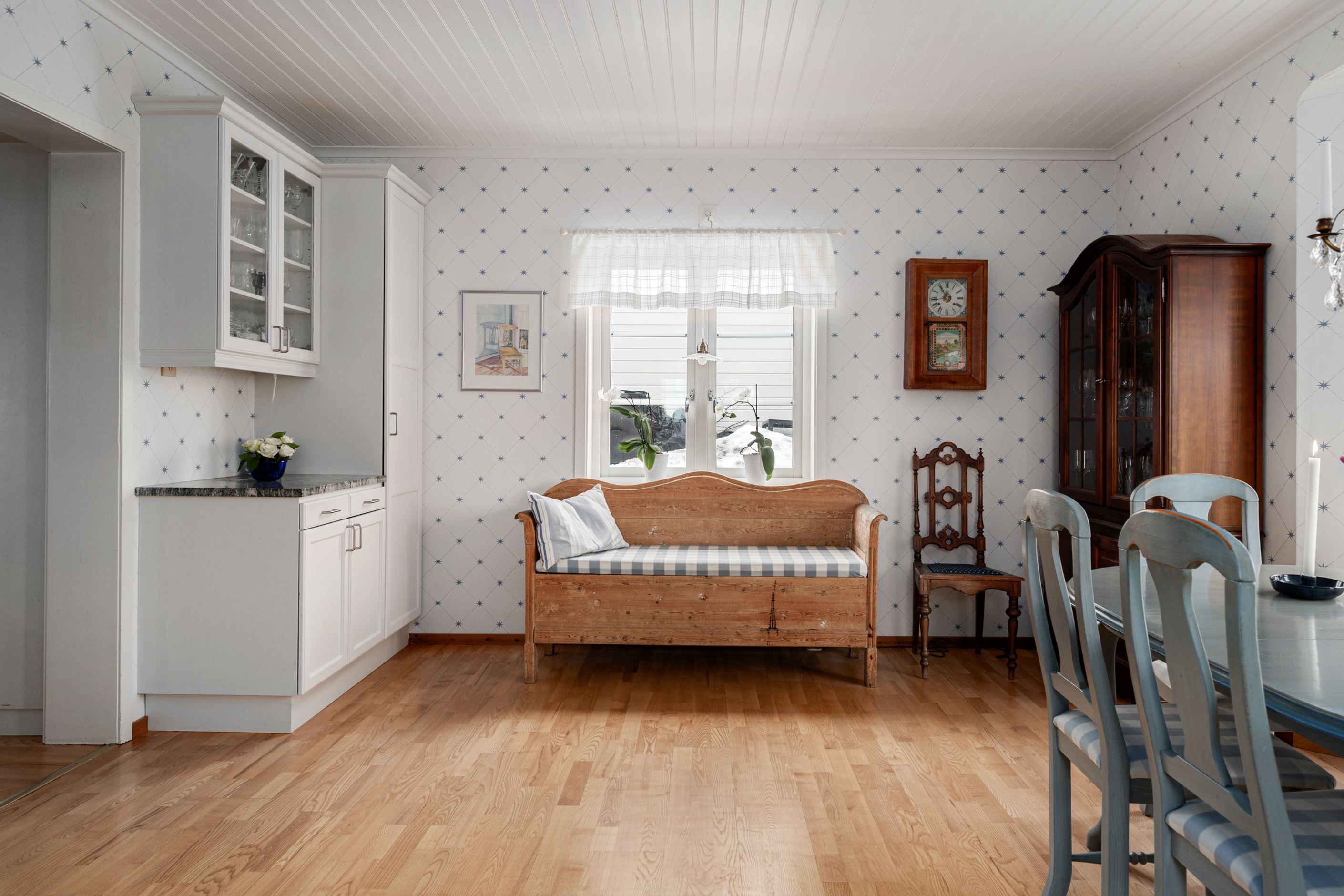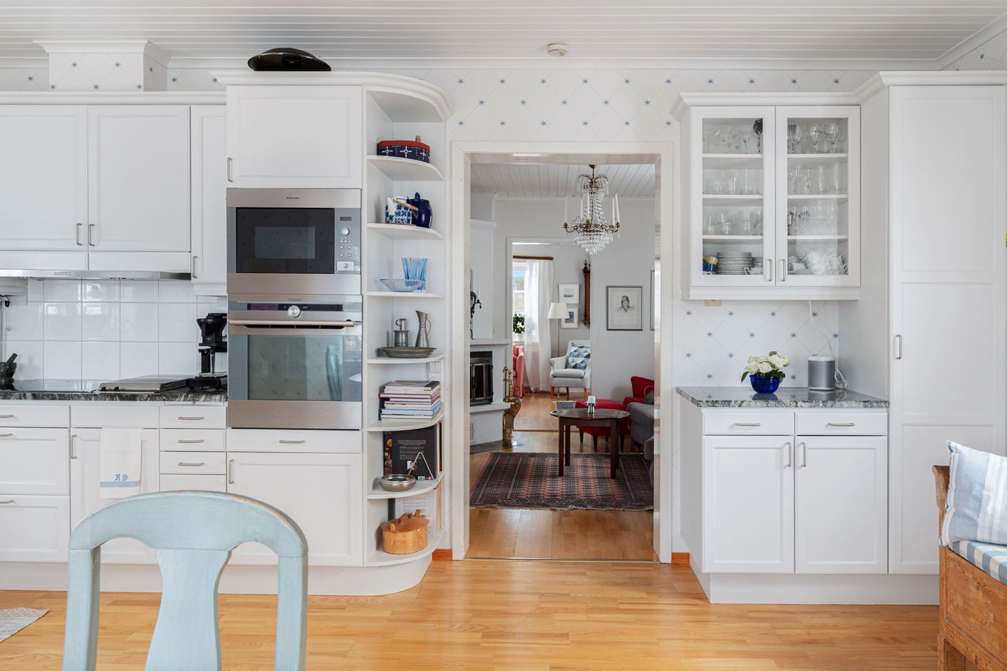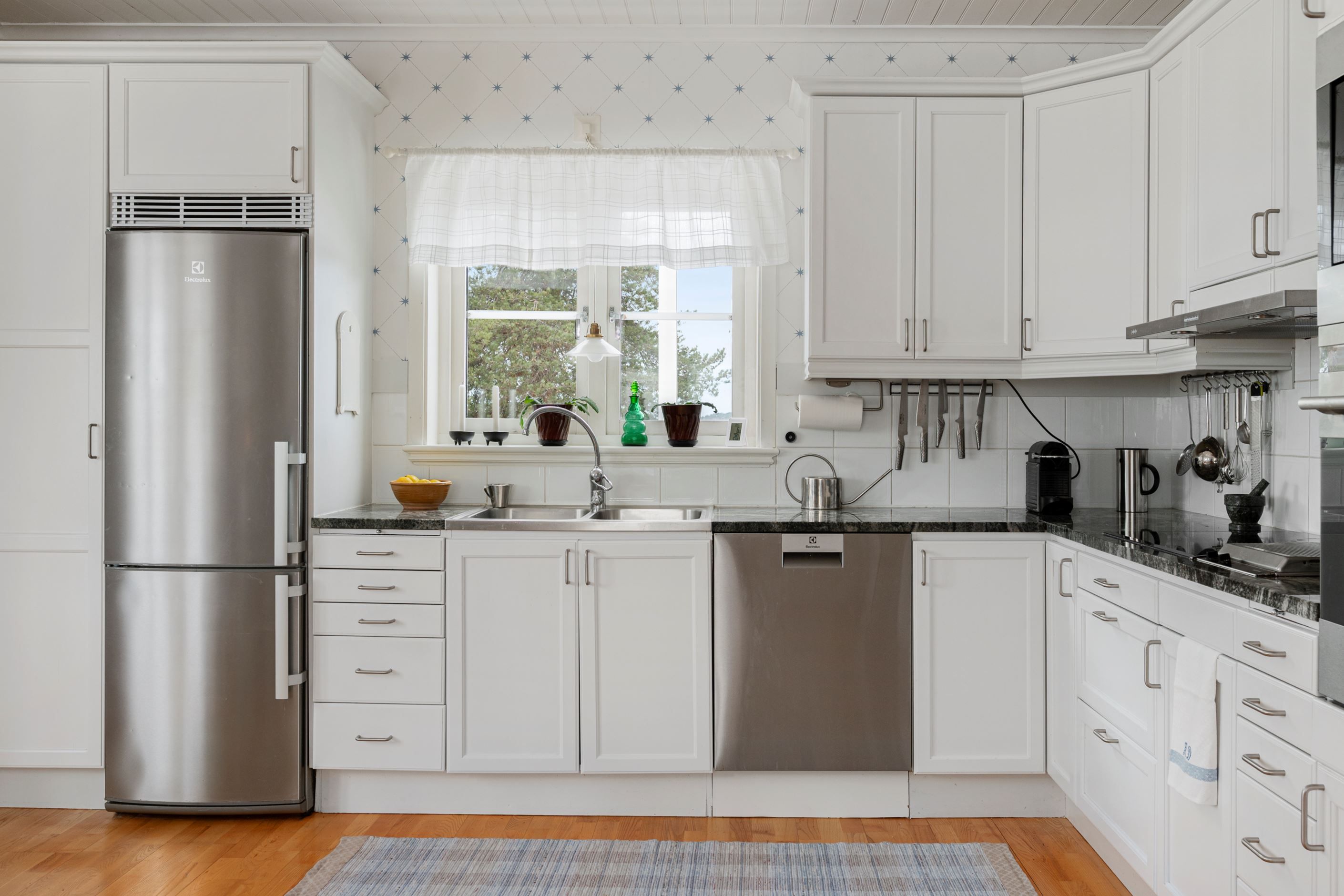 Invändigt öppnar bostaden upp sig med ett generöst kök som löper längs hela gavelsidan. Fönster i tre väderstreck släpper in rikligt med dagsljus och skapar en luftig och inbjudande känsla. Här finns gott om arbetsytor, modern utrustning och naturlig plats för matbord vid fönsterpartiet där utsikten över vattnet ger varje måltid en extra dimension.