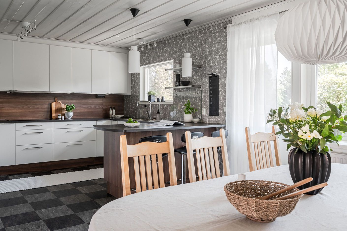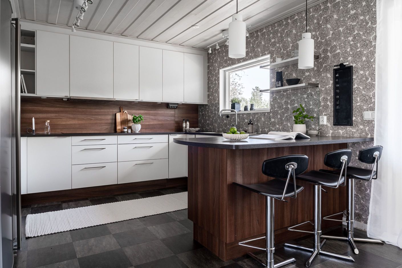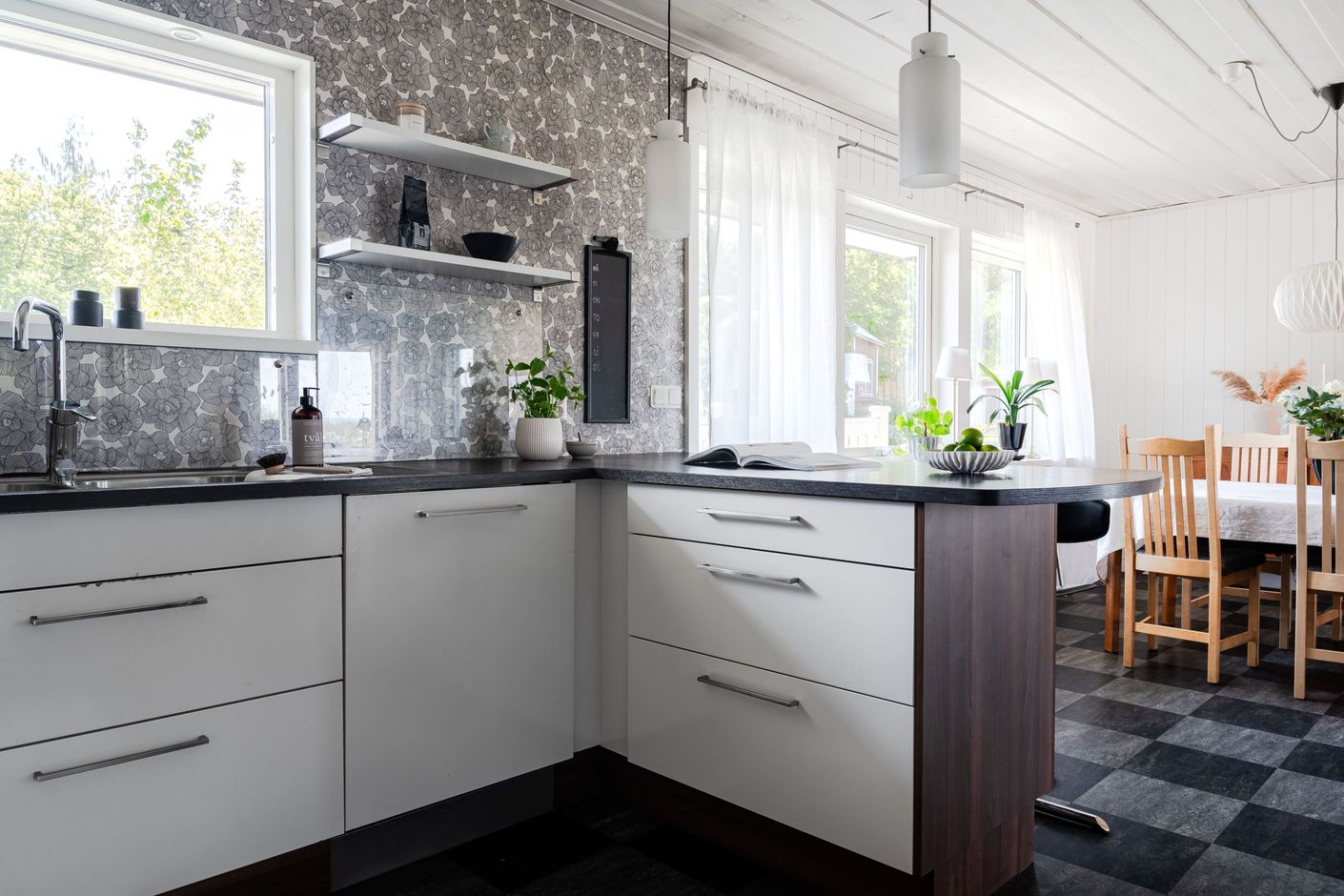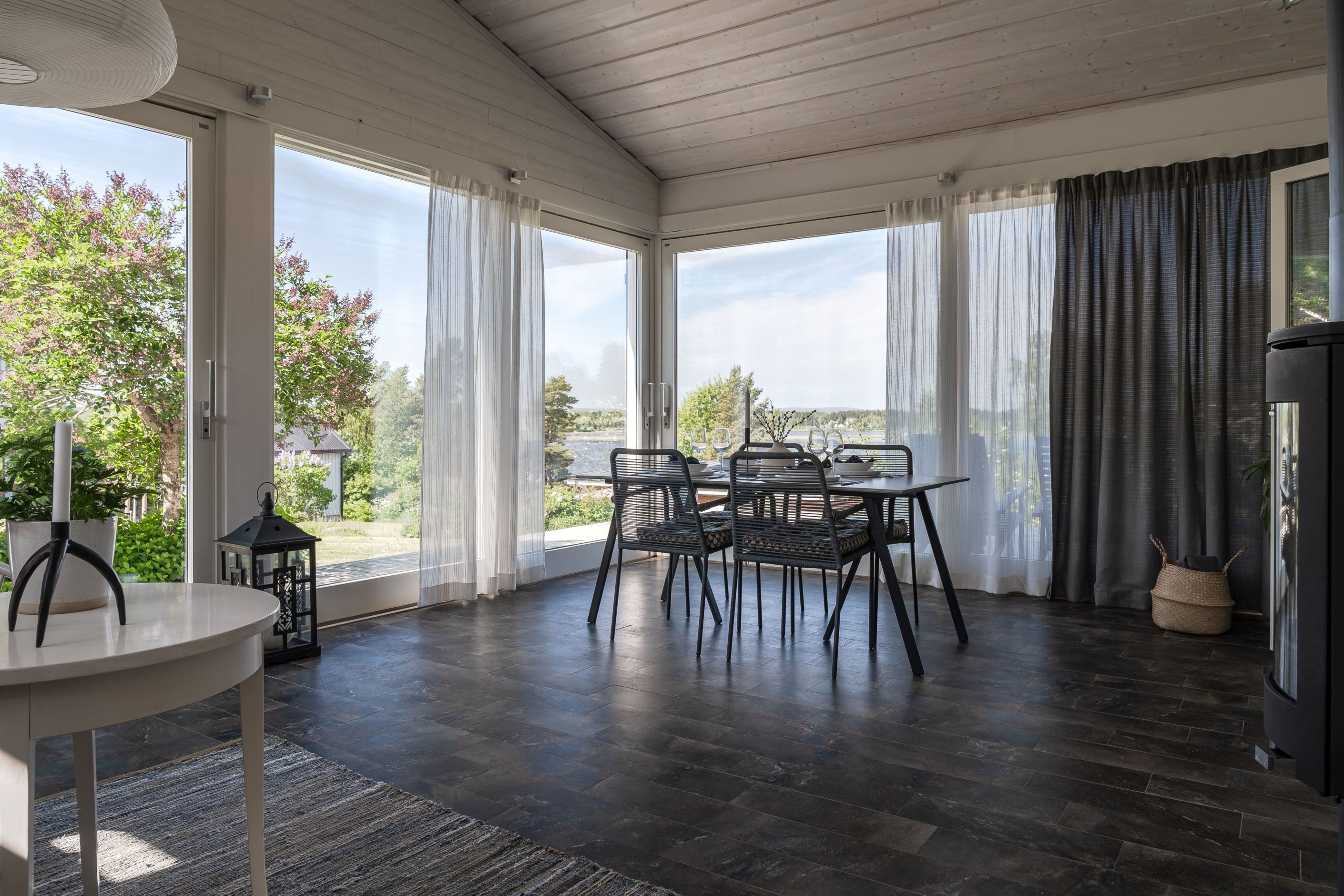 Övre plan består av stora sociala ytor, du hittar ett välplanerat kök som renoverades 2012. I köket finns bra förvaring och gott om avlastningsytor samt en köksö. Köket har vita skåpluckor, grå bänkskiva, detaljer och en maskinpark i rostfritt stål. Intill köket finns det plats för ett stort matbord och i andra delen av rummet ligger vardagsrummet, allt i en öppen planlösning. Från vardagsrummet når man det ljusa inglasade uterummet som går att nyttja året runt, det inrymmer både matsalsdel och loungegrupp. I inglasningen finns även en kaminen som bidrar till en extra mysfaktor och här inne kan man gärna slå sig ner med en bok och koppla av efter en stressig dag. I dagsläget finns det möjlighet till fem stycken sovrum, varav tre av dessa ligger på övre plan, samtliga av dessa sovrum har gott om förvaring. På övreplan finner man även en stor toalett med en vägg klädd i vit träpanel som skapar en härligt kontrast till det i övrigt helkaklade badrummet.