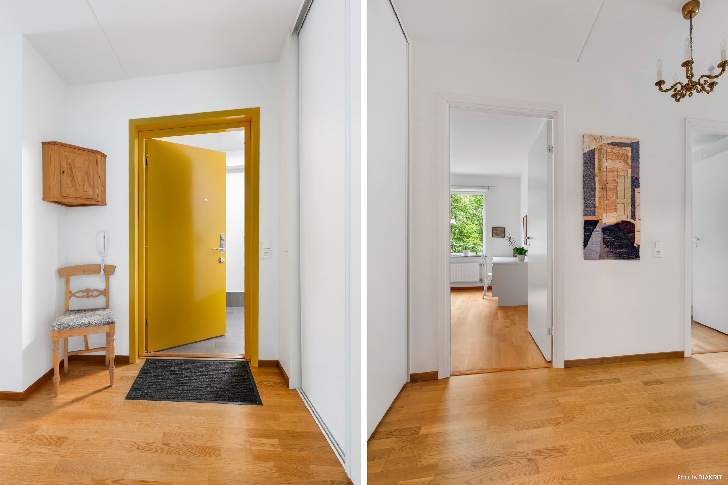 Bostaden rymmer två bra sovrum, en praktisk klädkammare och ett stilrent, helkaklat duschrum med tvättmaskin för extra bekvämlighet.