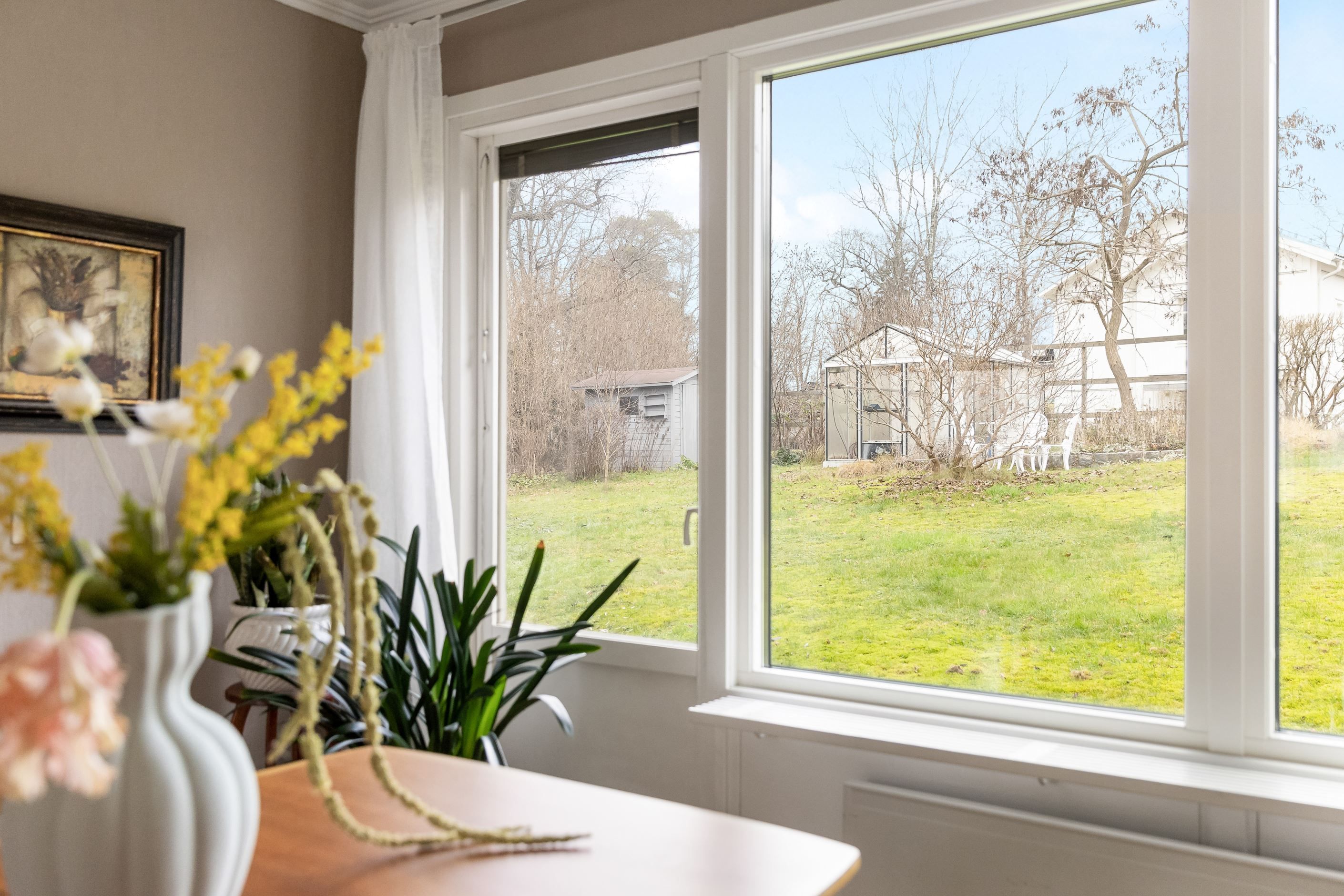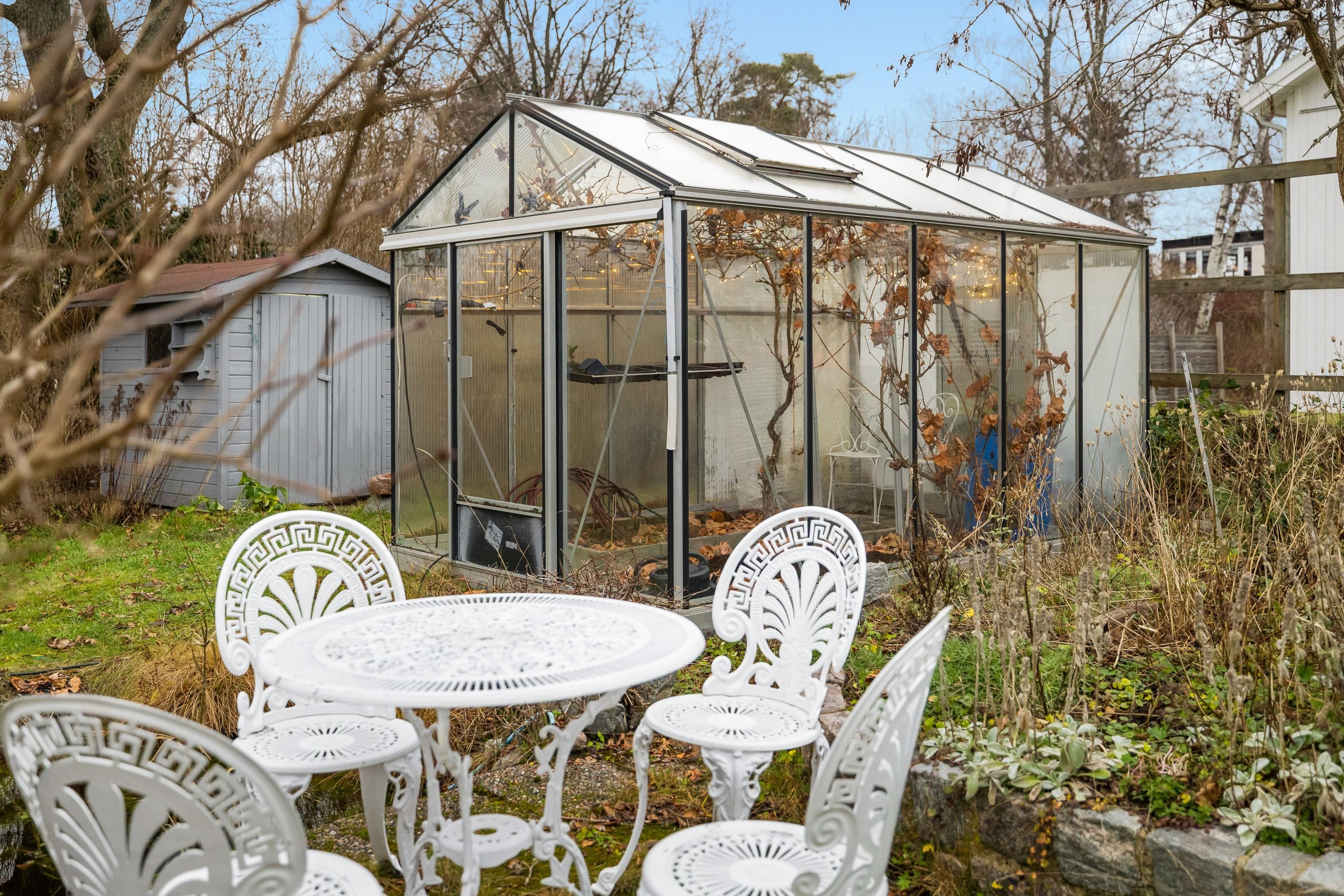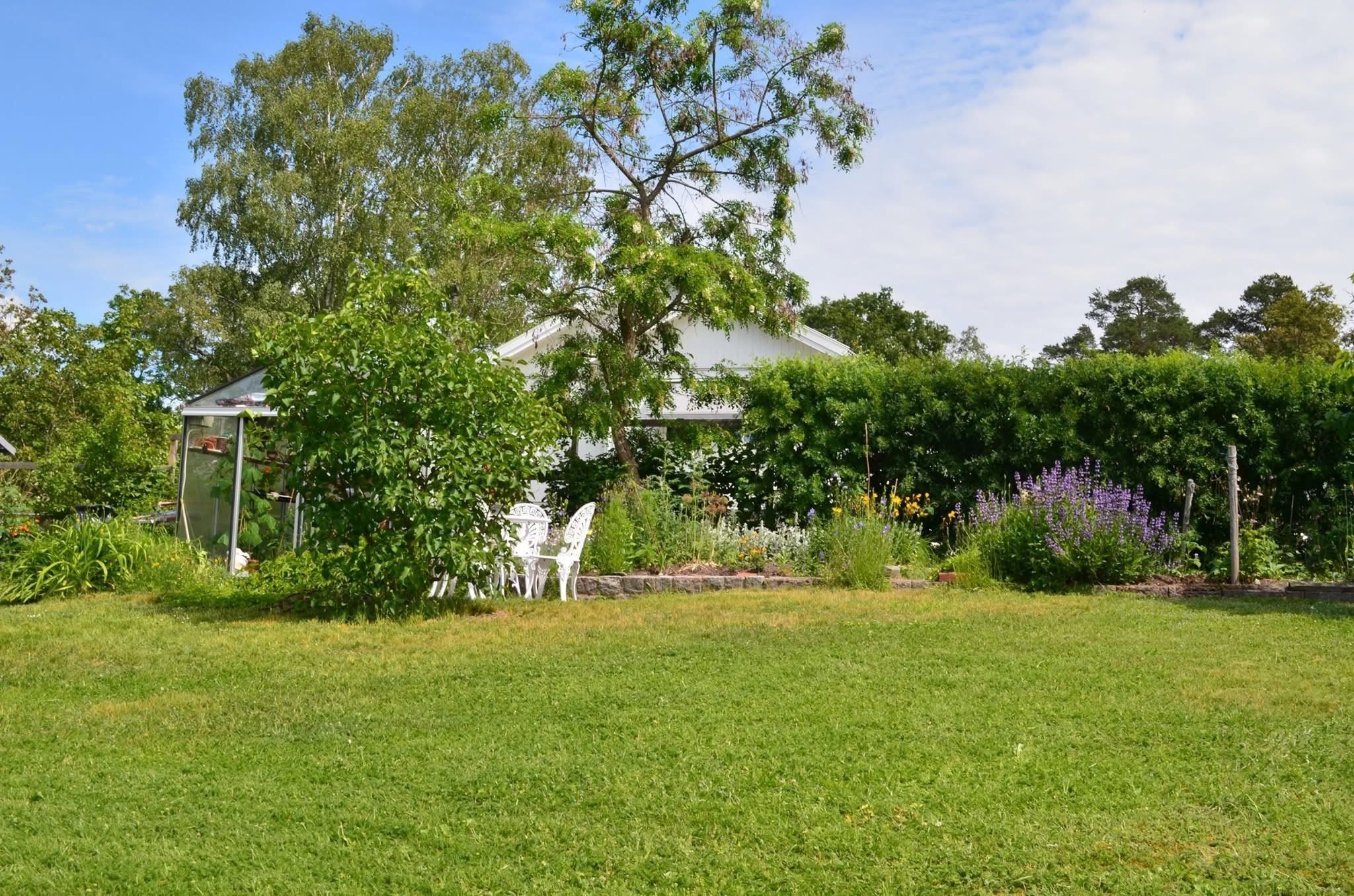 Från vardagsrummet nås altanen som tillsammans med växthus och bastu erbjuder fina möjligheter till avkoppling och umgänge under stora delar av året. Garage med elport och direkt access till huset underlättar vardagen ytterligare och kompletteras av en praktisk matkällare som ger extra förvaringsutrymme.