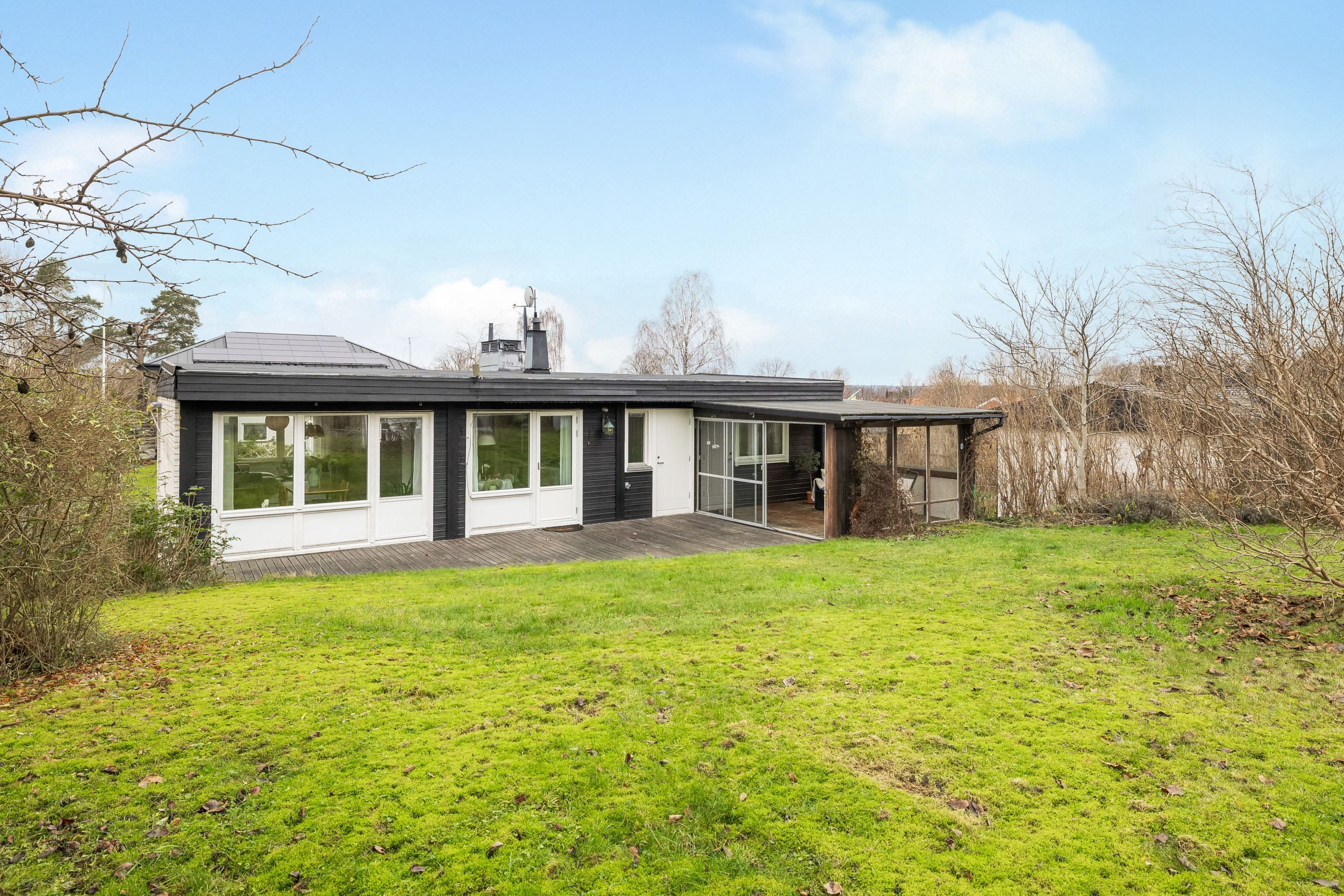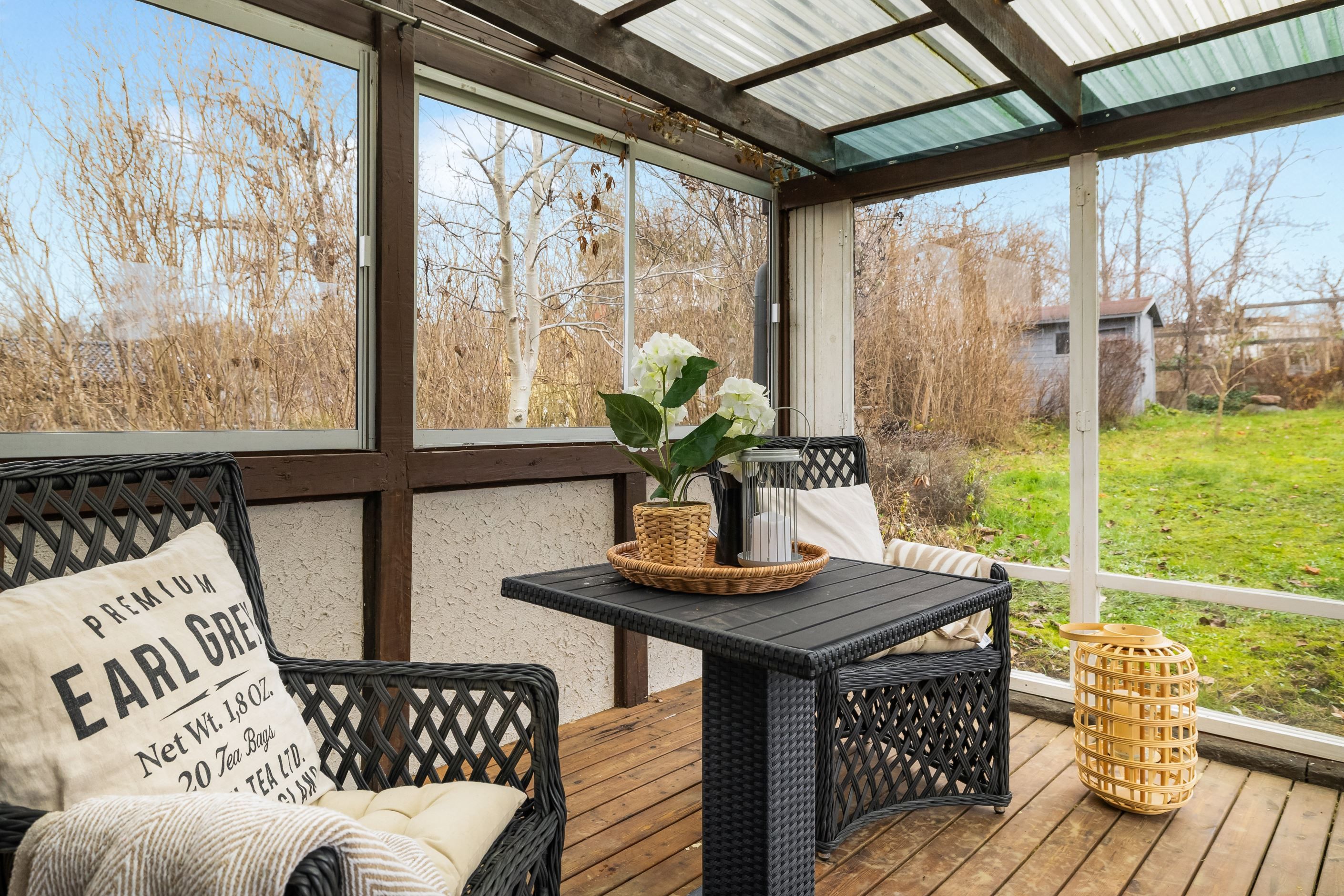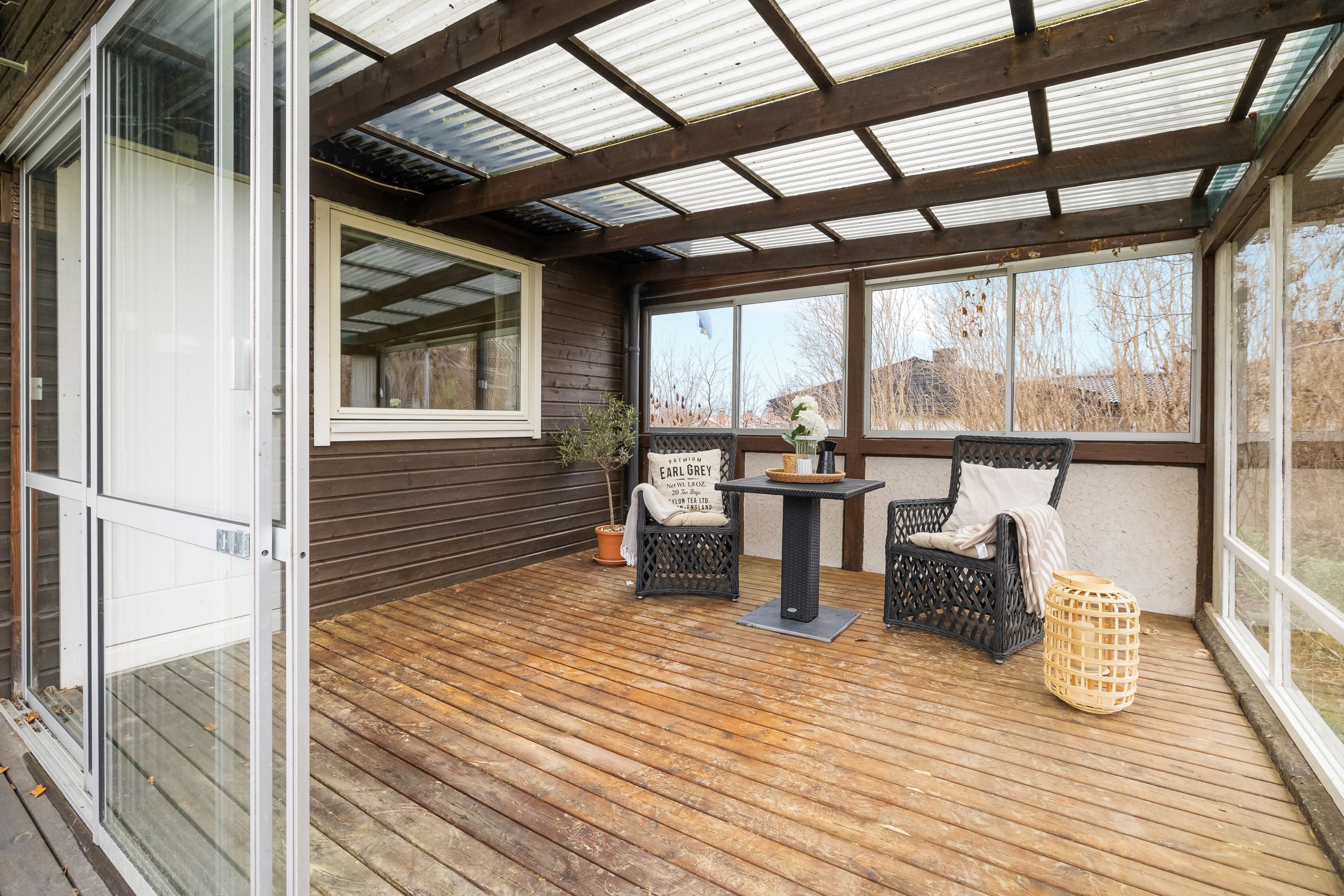 Från vardagsrummet nås altanen som tillsammans med växthus och bastu erbjuder fina möjligheter till avkoppling och umgänge under stora delar av året. Garage med elport och direkt access till huset underlättar vardagen ytterligare och kompletteras av en praktisk matkällare som ger extra förvaringsutrymme.