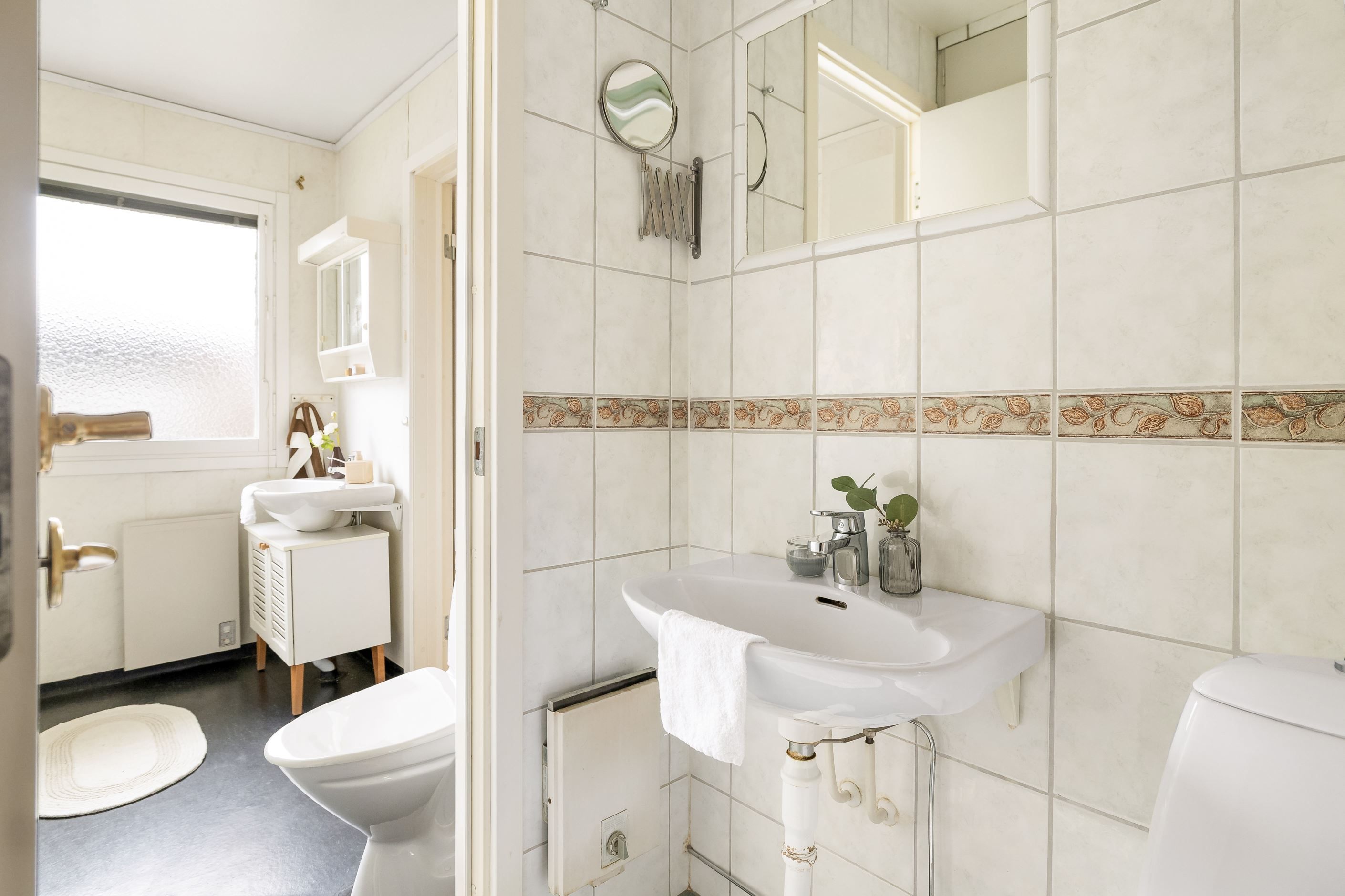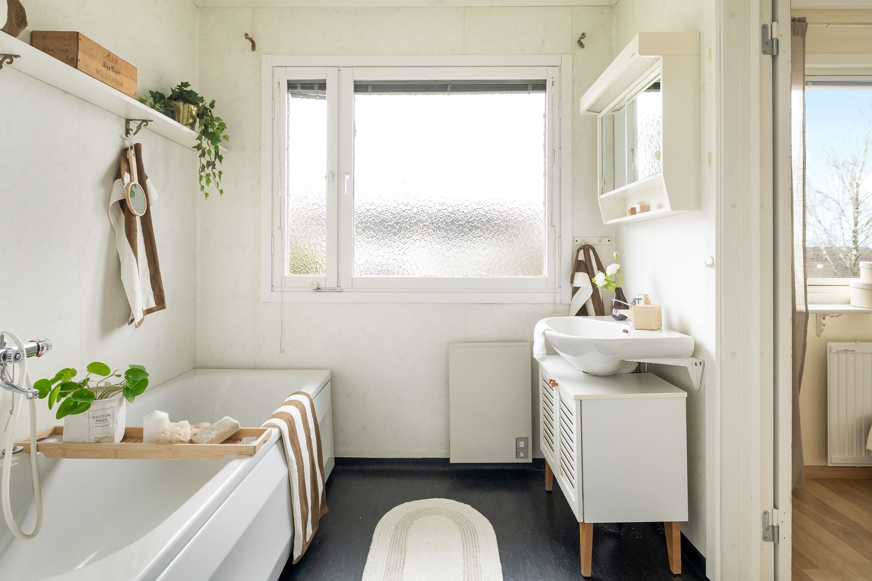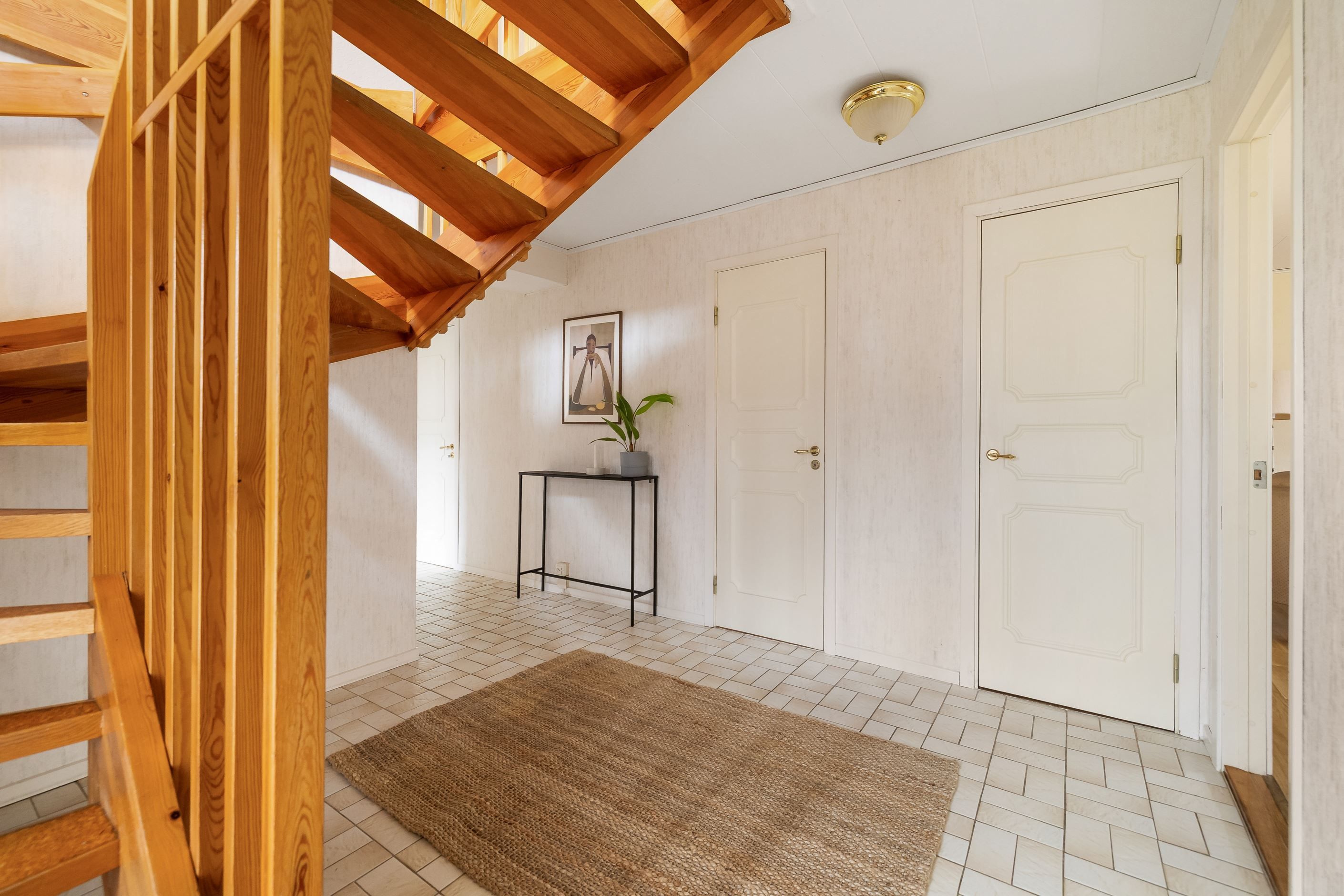 Den ovanligt stora hallen erbjuder gott om förvaring och är praktiskt utformad med plats även för en tvillingvagn utan att det påverkar funktion eller rörelseutrymme. Ett stort mervärde är bostadens tre badrum, vilket är mycket sällsynt och bidrar till en smidig och bekväm vardag för hela familjen.