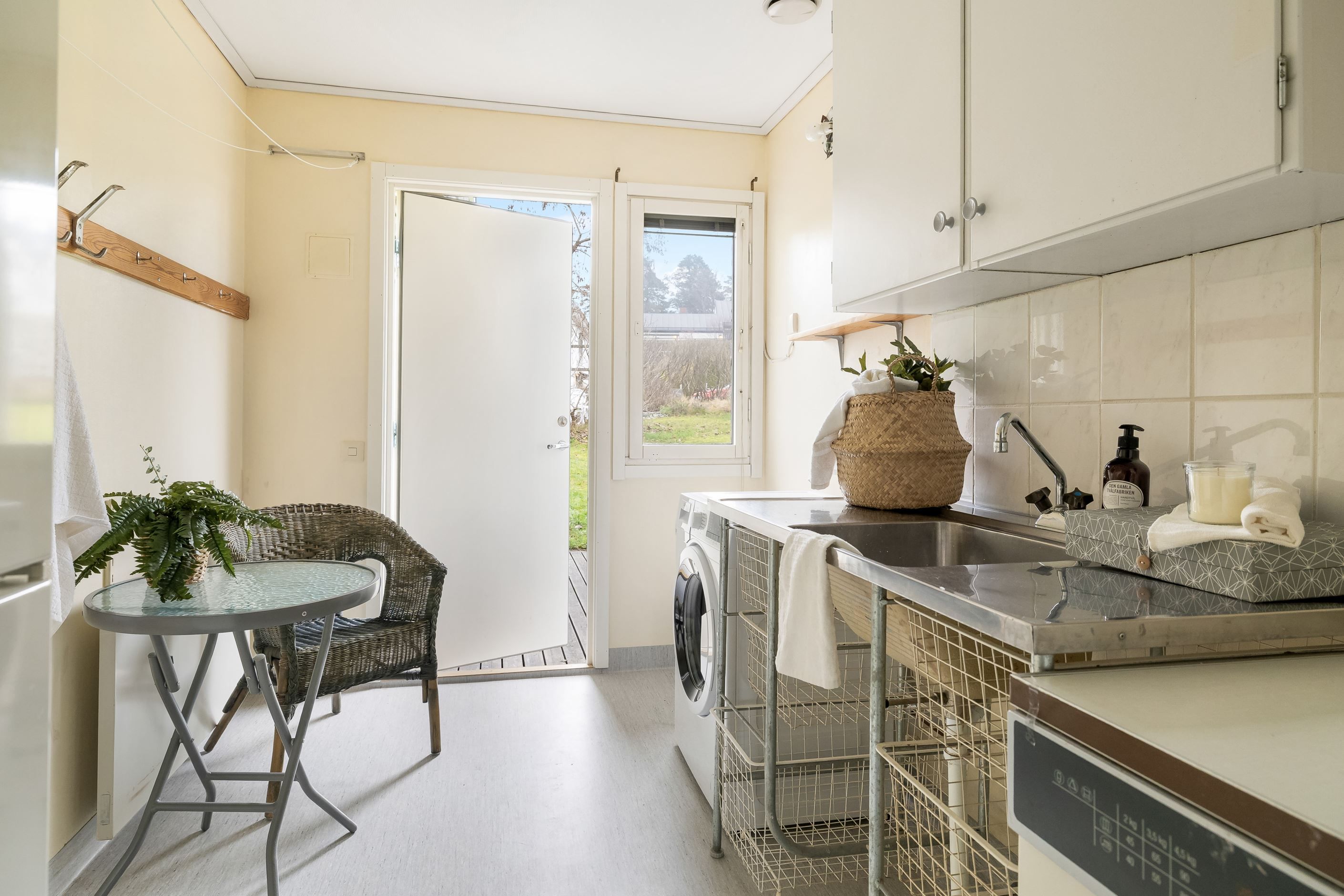 Tvättstuga med utgång till trädgården för att hänga tvätten