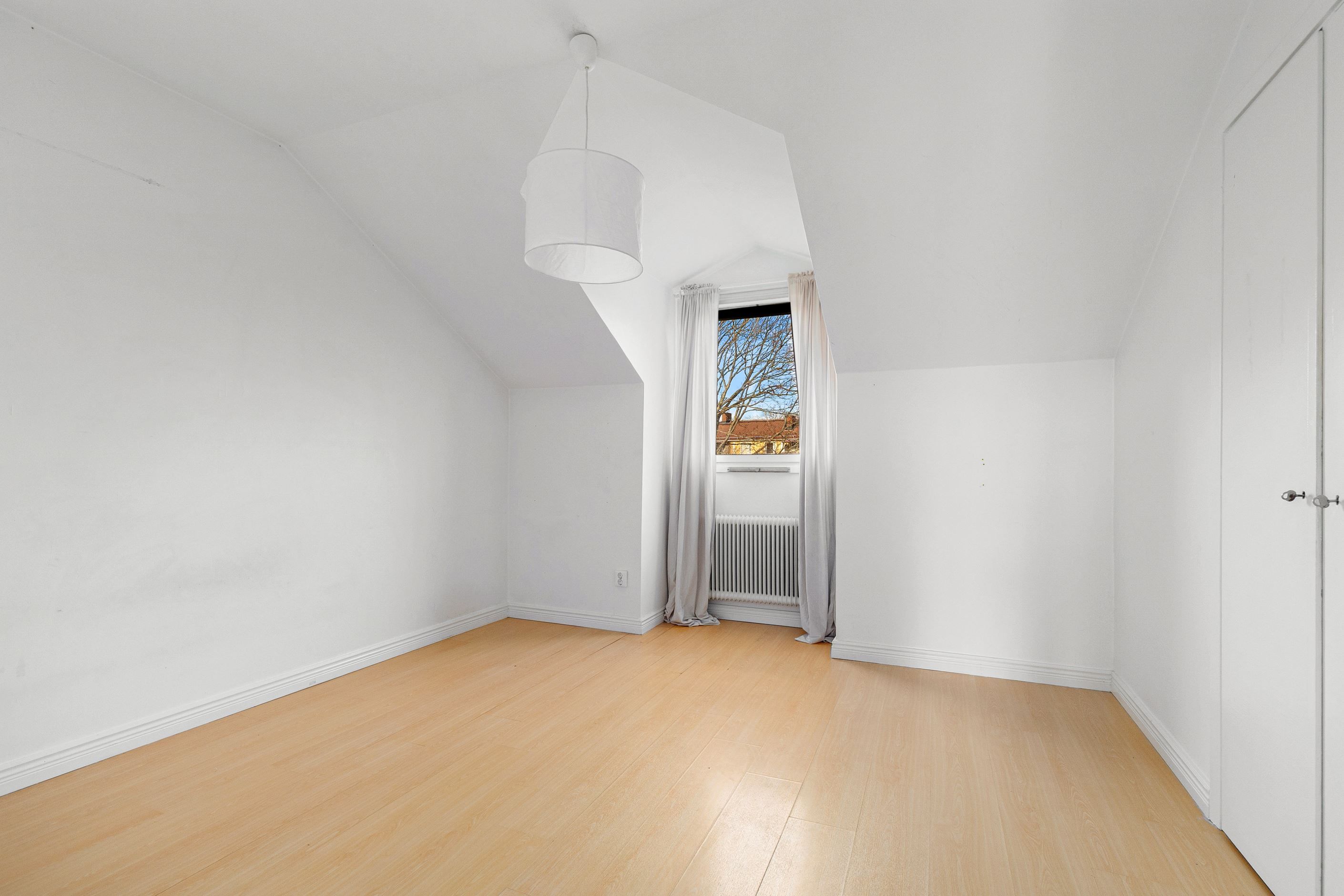 Stort sovrum med bra ljusinsläpp ifrån fönster, gott om förvaring i garderober. Stort badrum med dusch tvättmaskin, tvättställ, wc och golvvärme