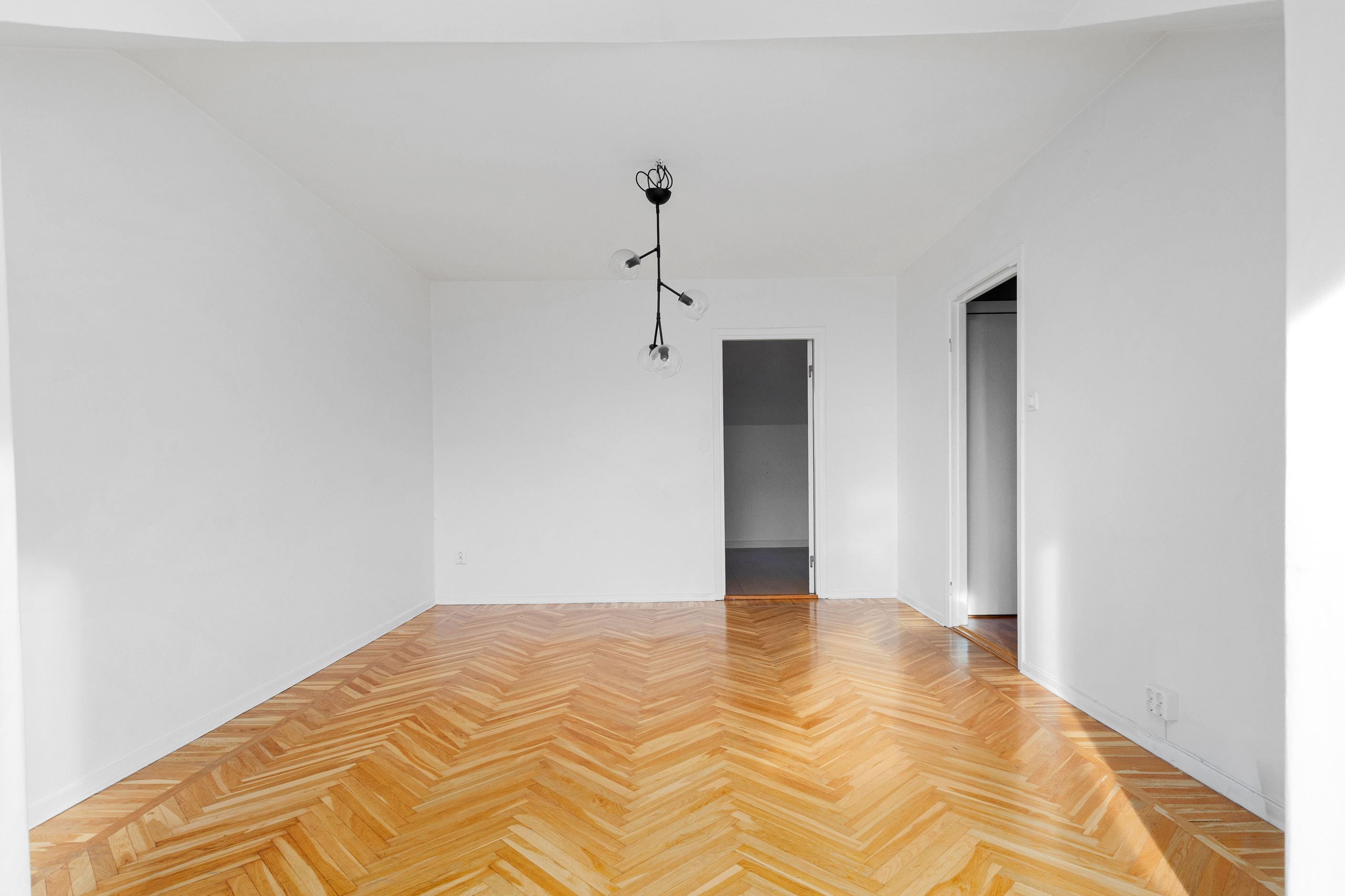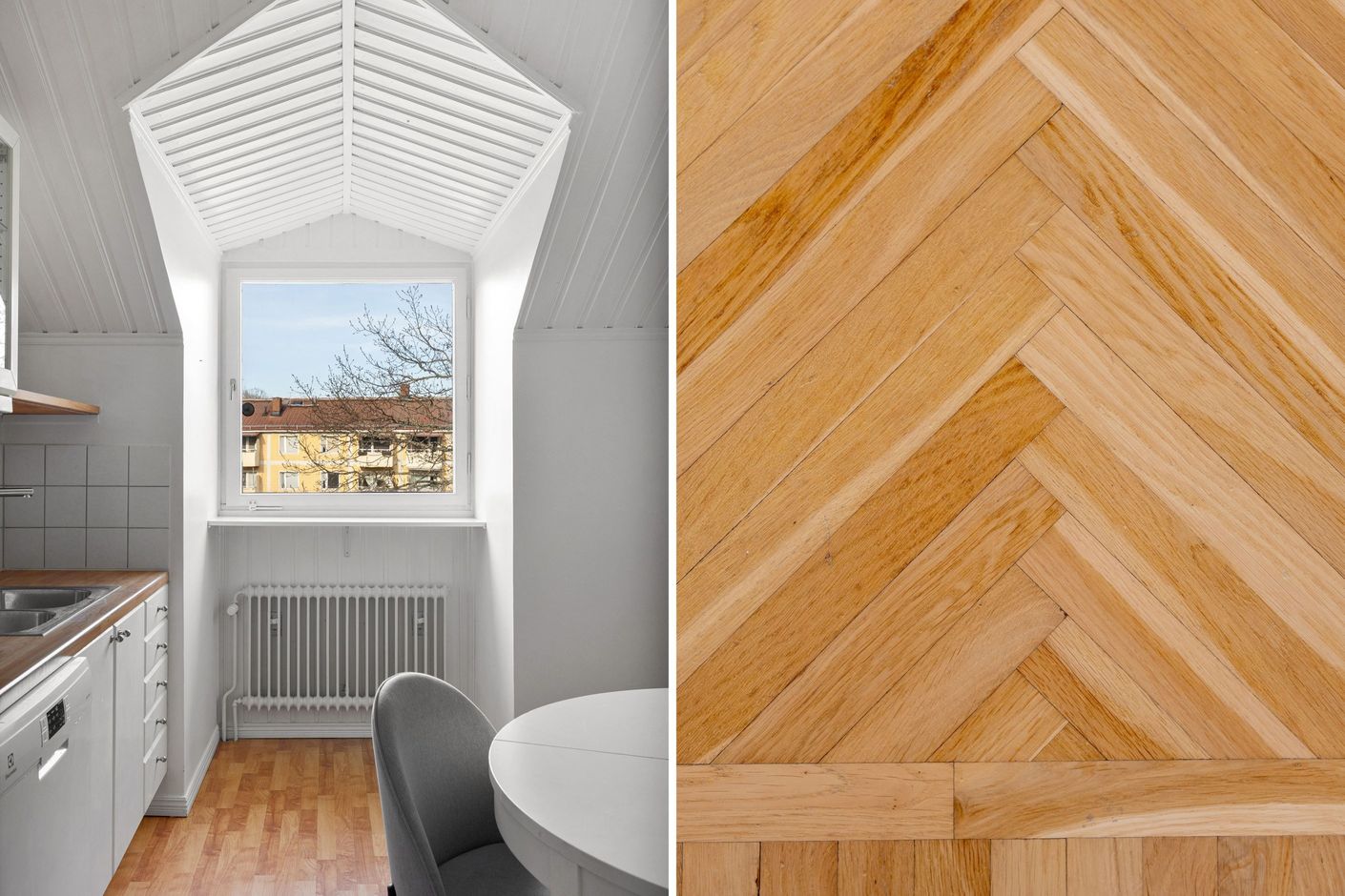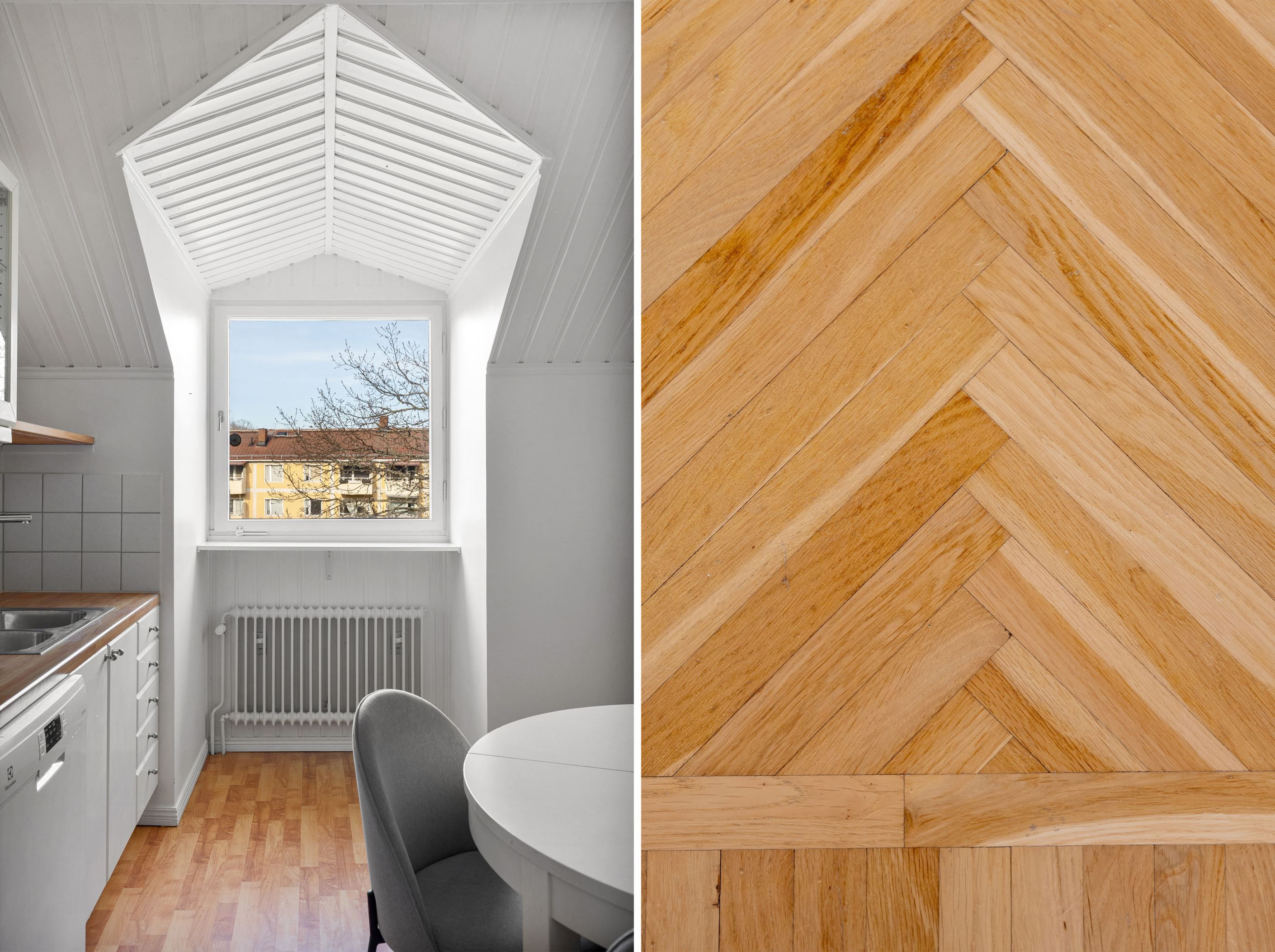 Genomgående i bostaden ligger en vacker fiskbensparkett som ger en klassisk och ombonad känsla. Köket erbjuder gott om förvaring och arbetsyta, vilket gör det både praktiskt och trevligt att använda.