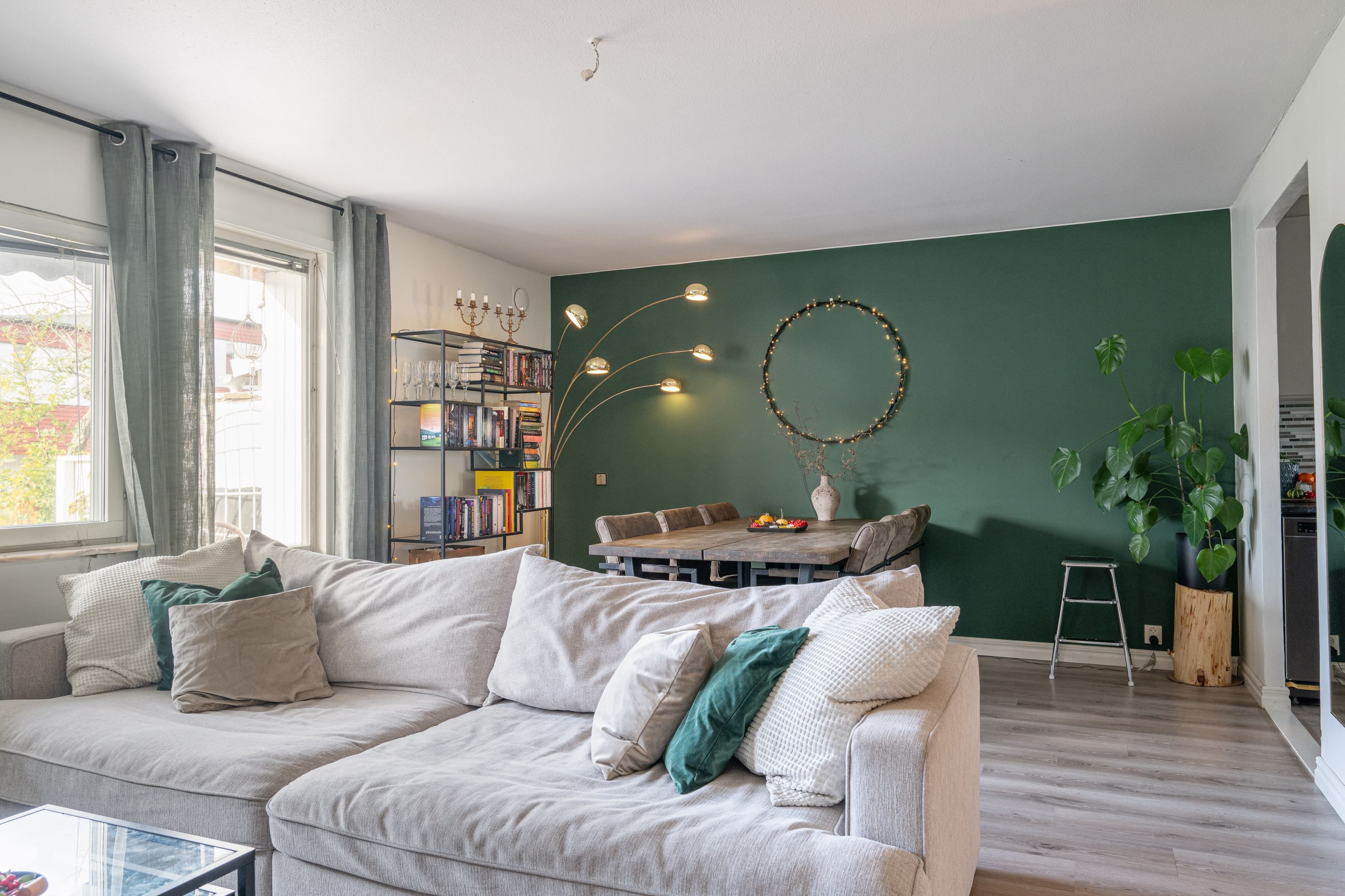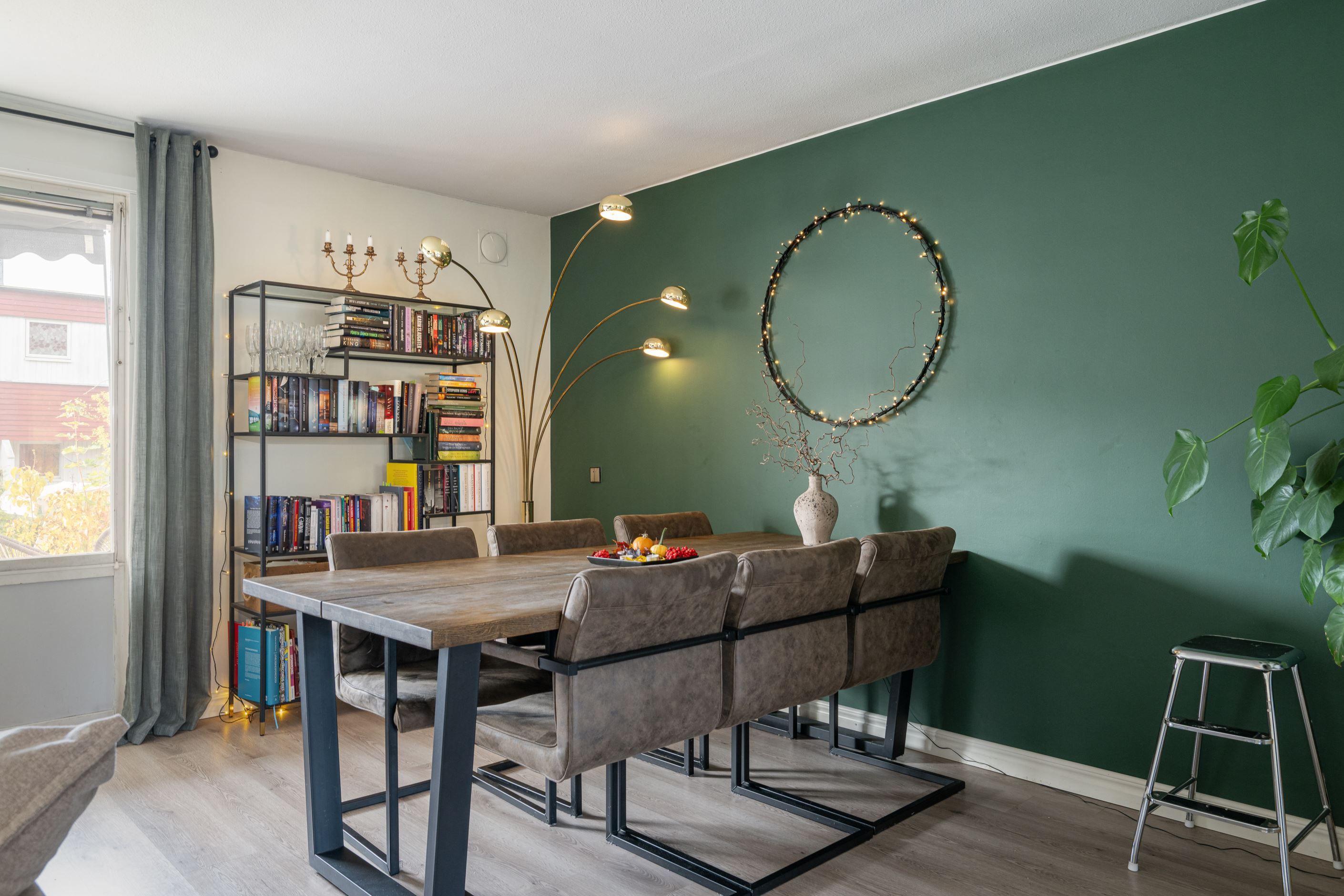 Vardagsrum med plats för både soffgrupp och matplats. Härifrån nås radhusets trädgård med både altan och gräsyta.