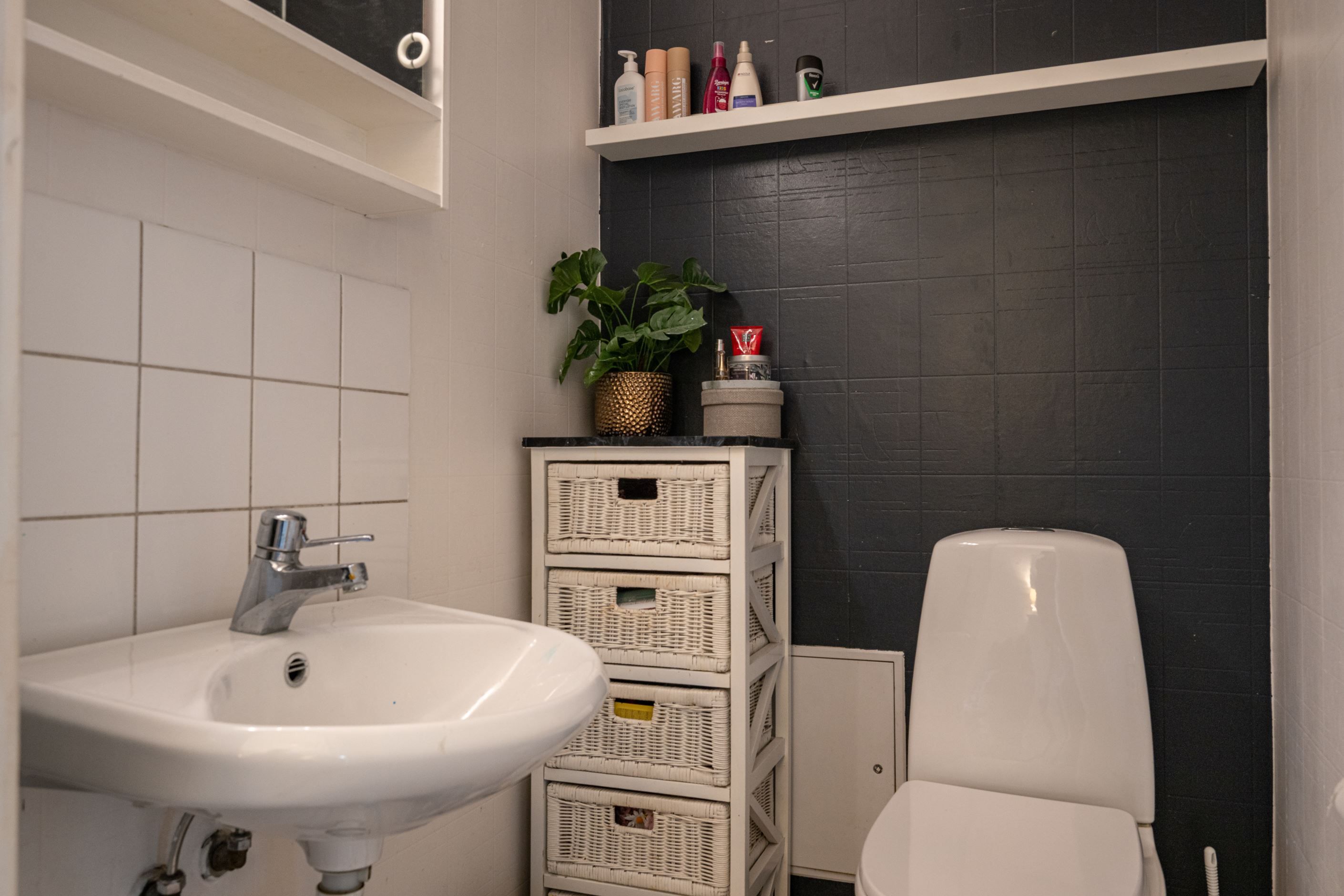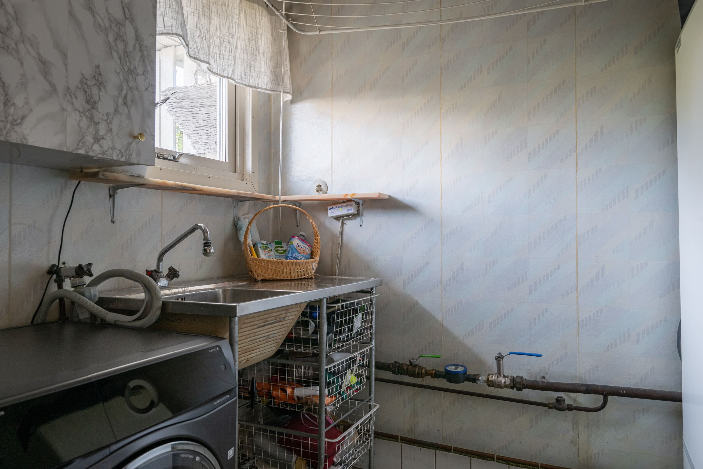 Tvättstuga med kombimaskin (-25), tvättho och varmvattenberedare.