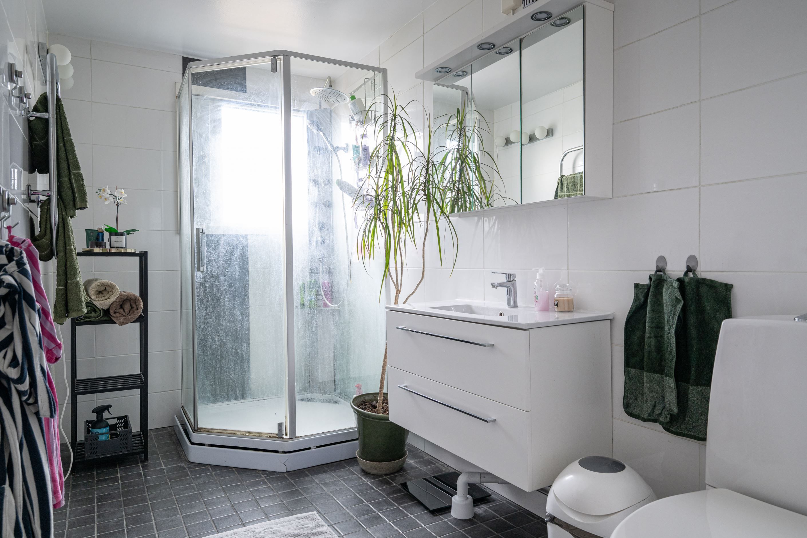 Helkaklat badrum med duschkabin, handfat med kommod och wc.
