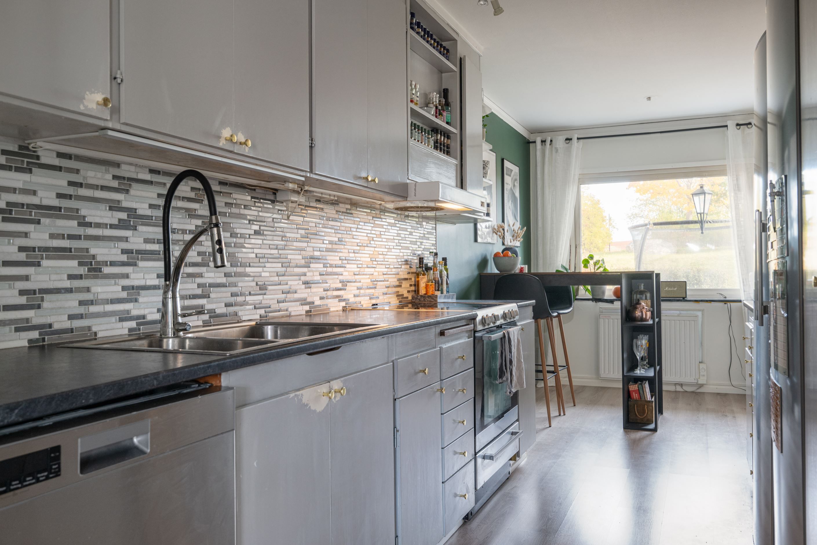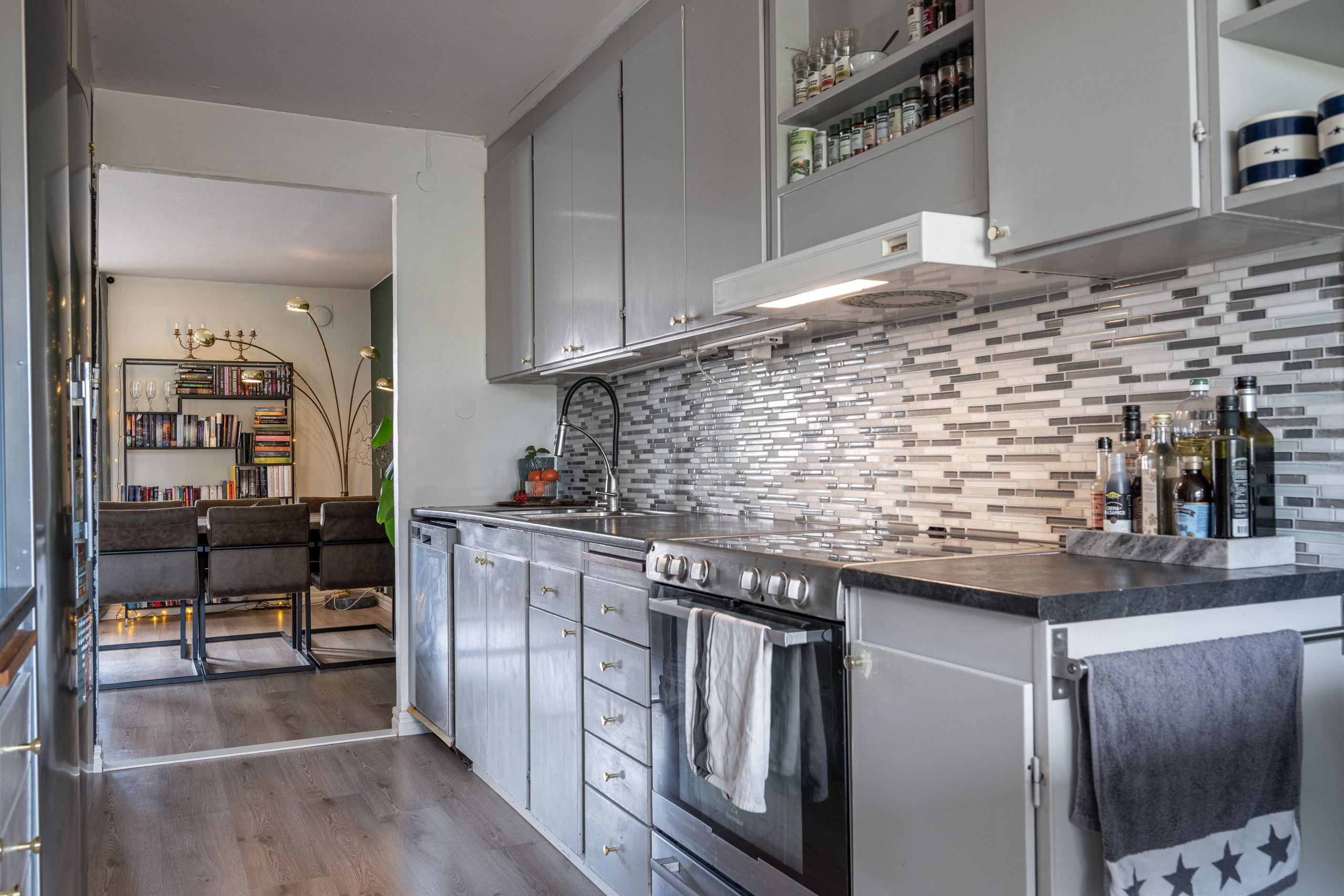 Kök med plats för matplats. Köket har gråa köksluckor, spis, ugn, fläkt, kyl och frys.