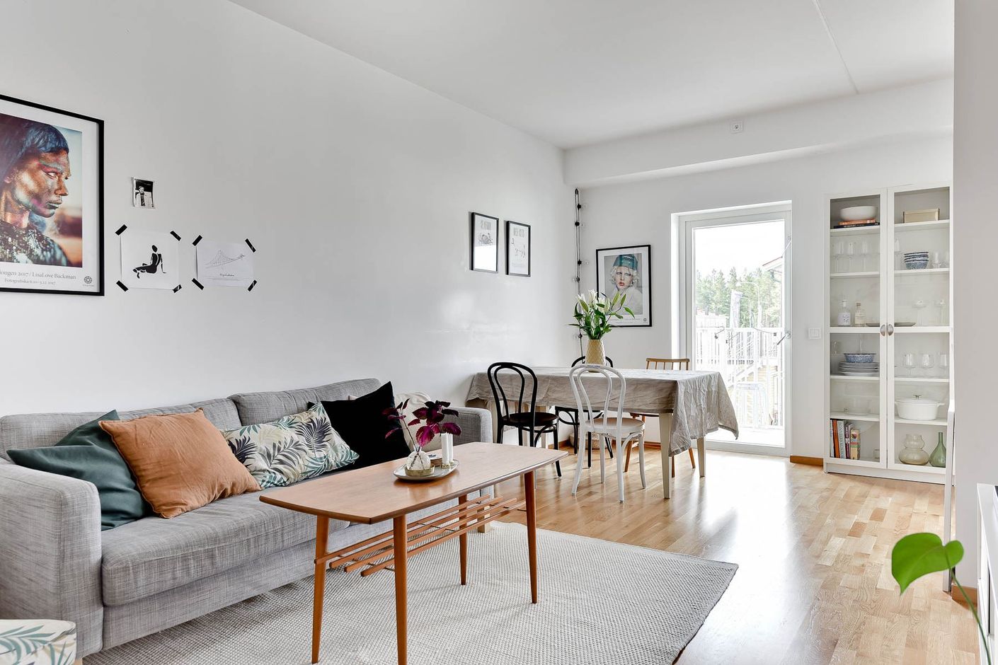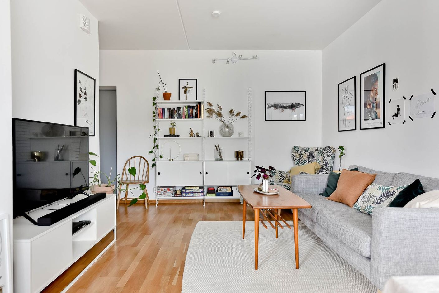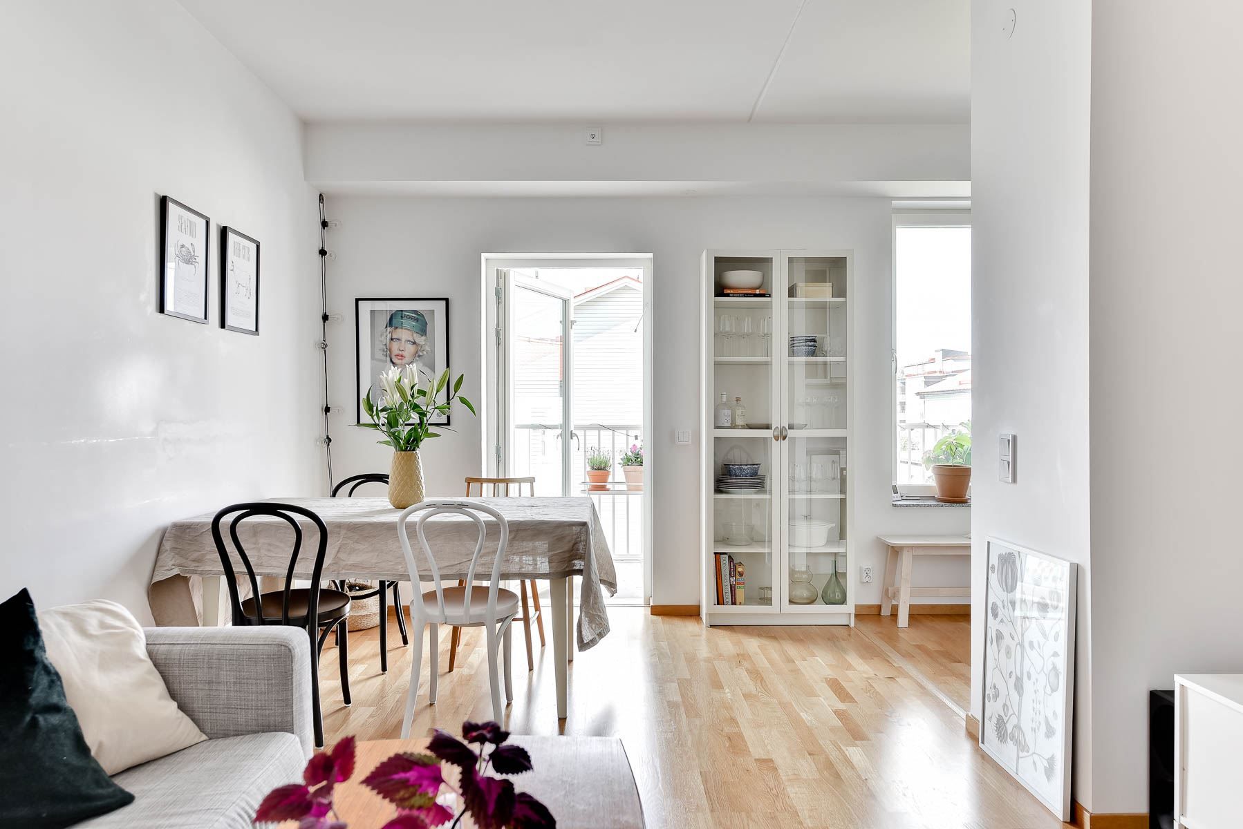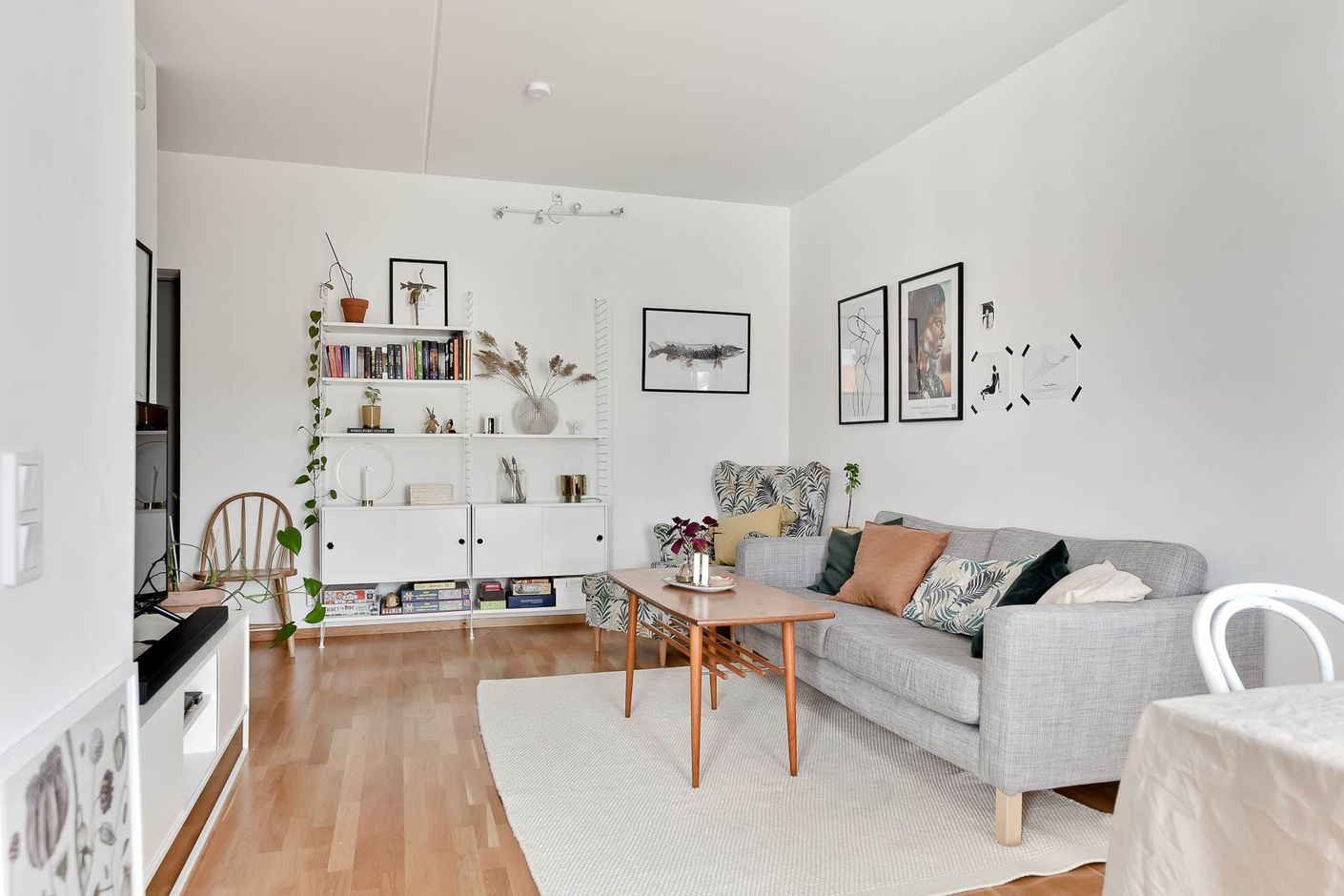 Genomgående enhetliga ekparkettgolv och ljusa materialval ger bostaden modern och tidlös karaktär.