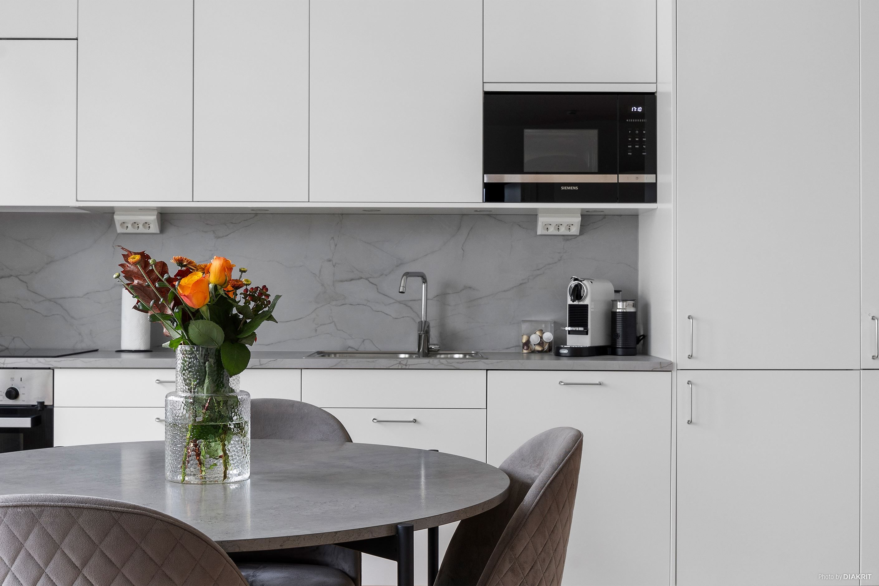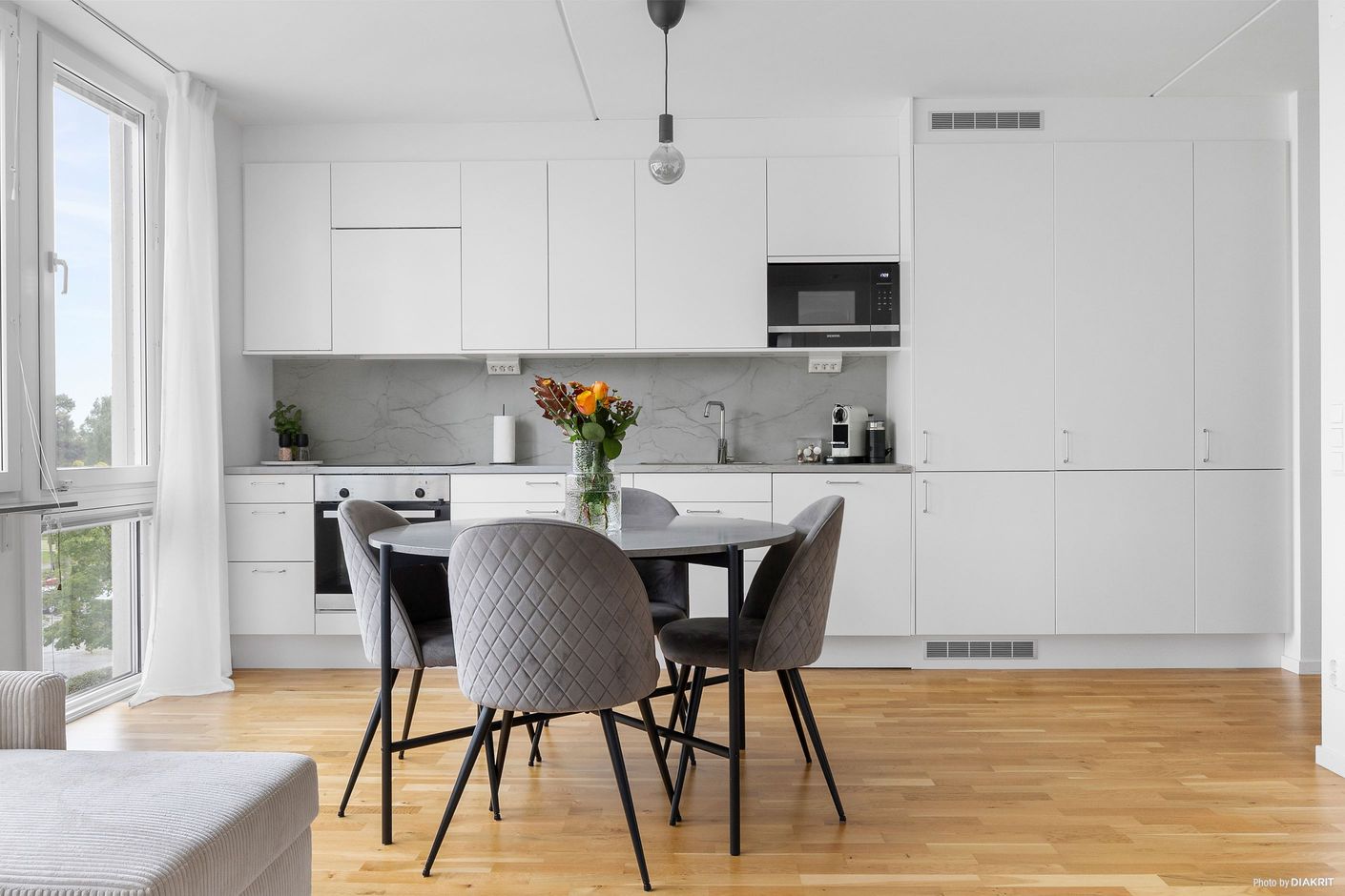 Den öppna planlösningen mellan kök och vardagsrum gör hemmet både socialt och praktiskt. Vardagsrummet har utrymme för större soffgrupp, soffbord och tv-möbel, medan det stilrena Marbodalköket erbjuder både design och funktion. Här finns full maskinpark med inbyggd mikrovågsugn, integrerad diskmaskin, induktionshäll, varmluftsugn, integrerad fläkt samt kombinerad kyl och frys – allt smakfullt integrerat för en enhetlig helhet.