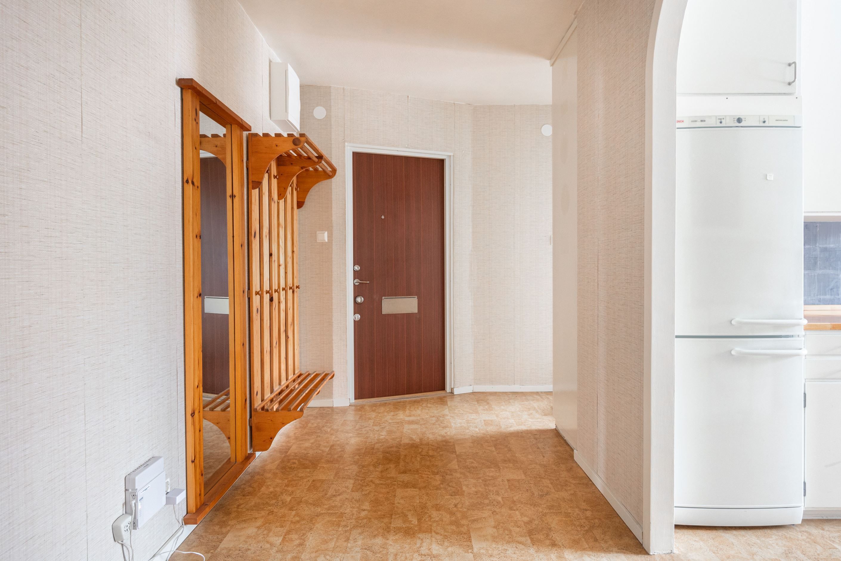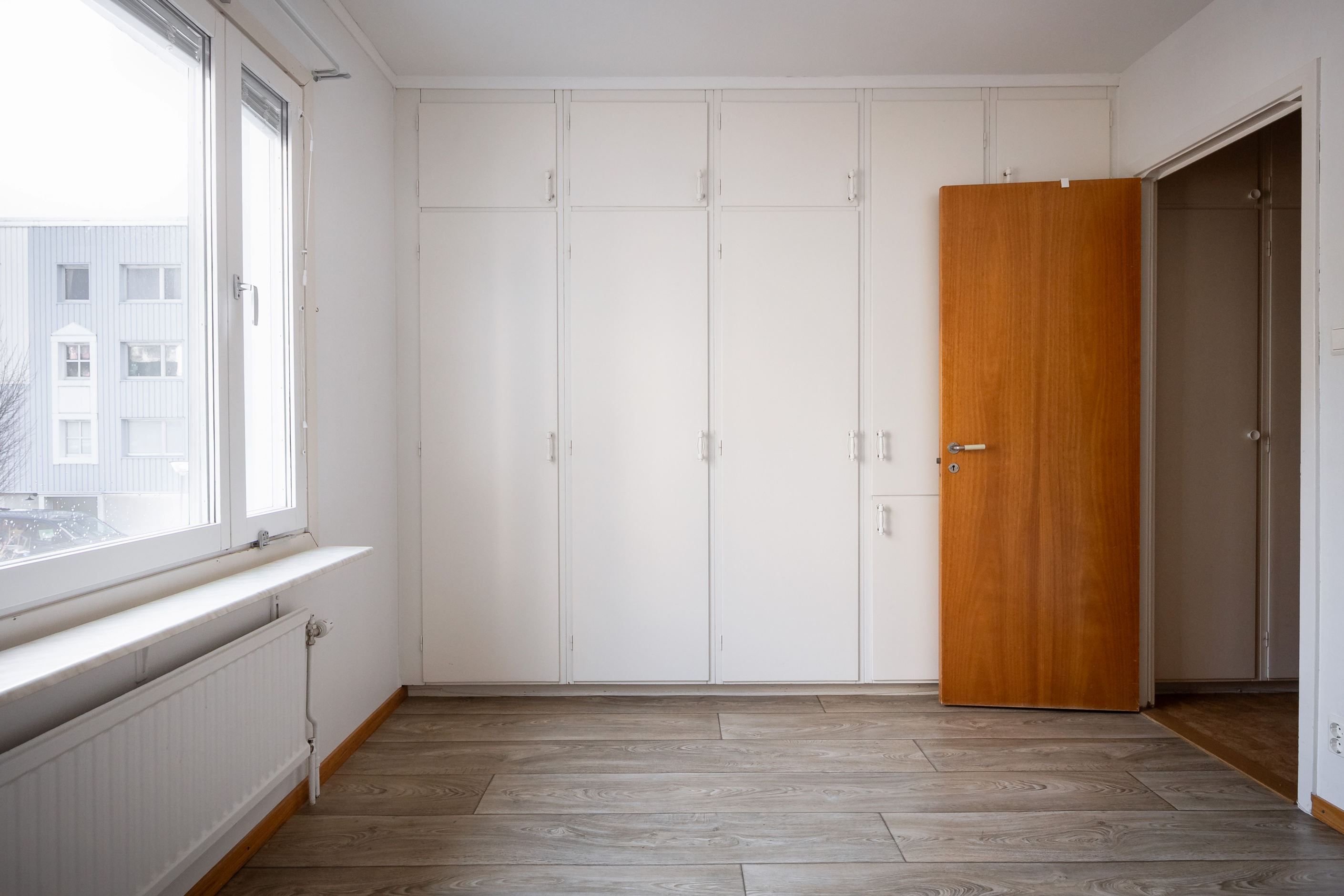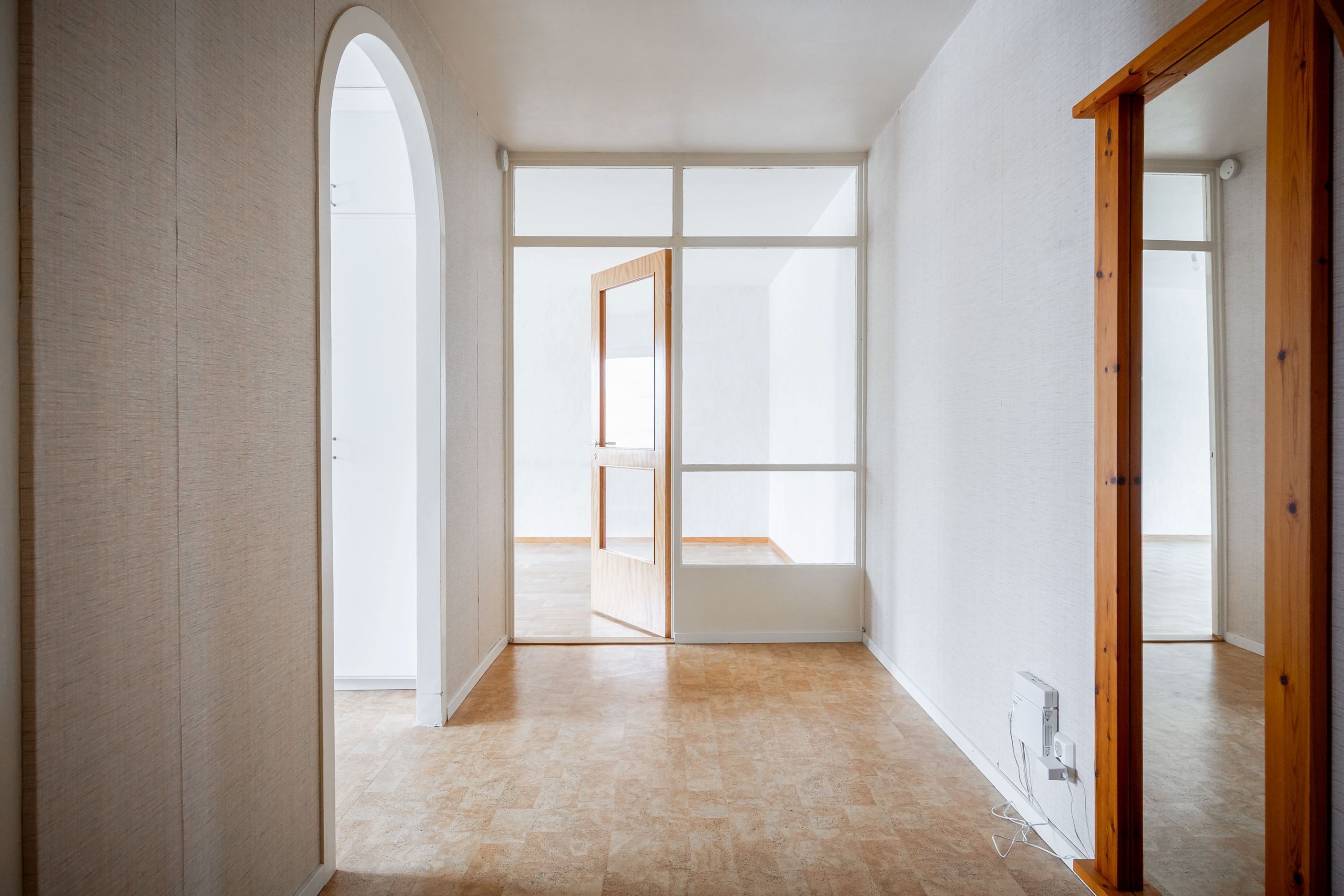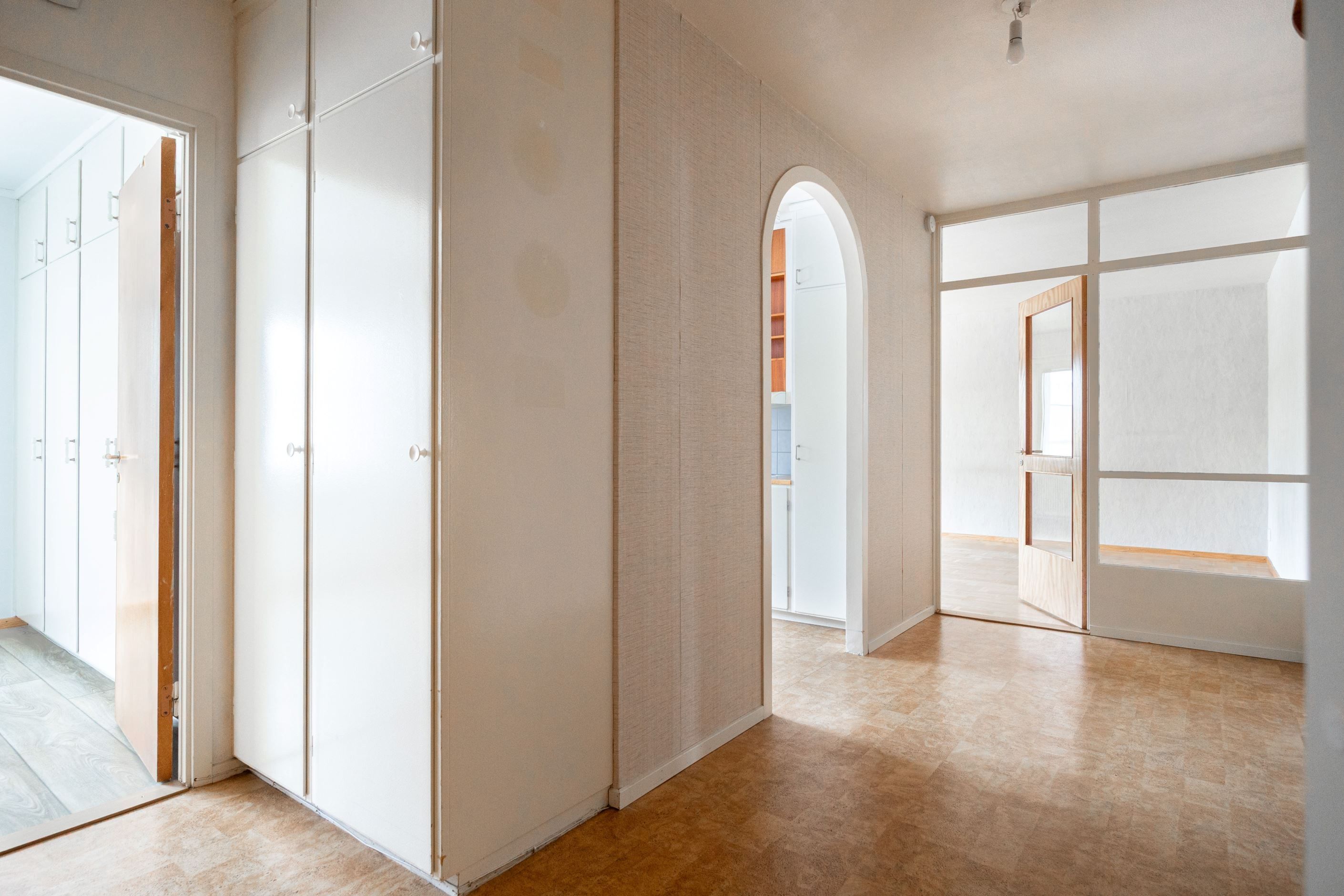 Lägenheten fördelas på en stor hall, kaklat badrum, rymligt kök med plats för matbord. Vardagsrum med parkettgolv och utgång till den stora balkongen med markis och ingen byggnad direkt framför. Det ger en känsla av frihet och rymd. Sovrummet är luftig och har 5 garderober.