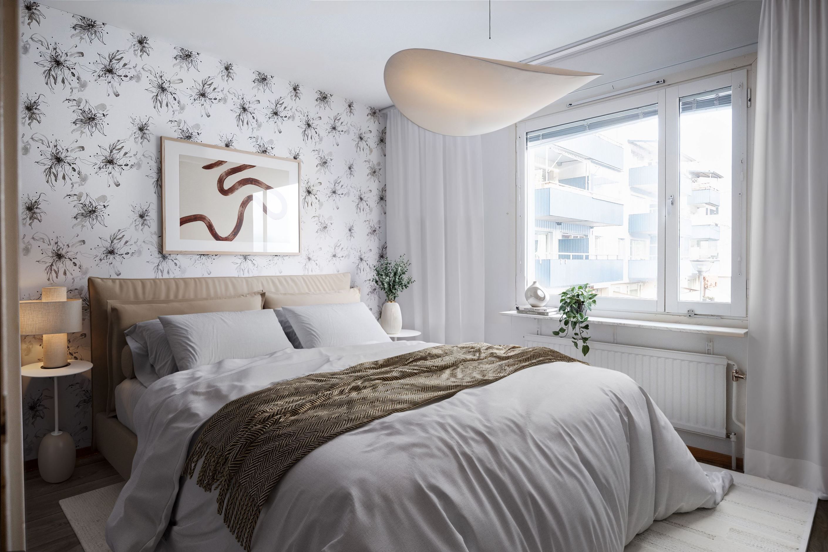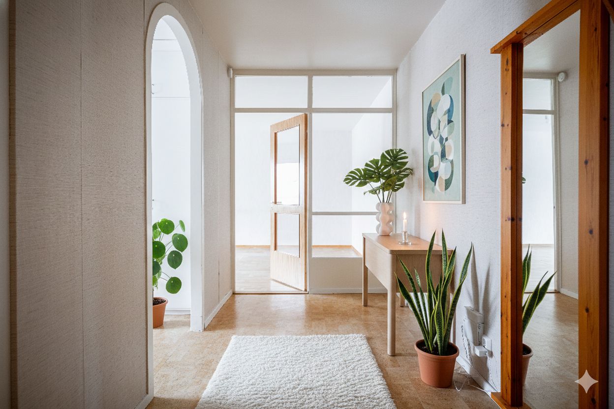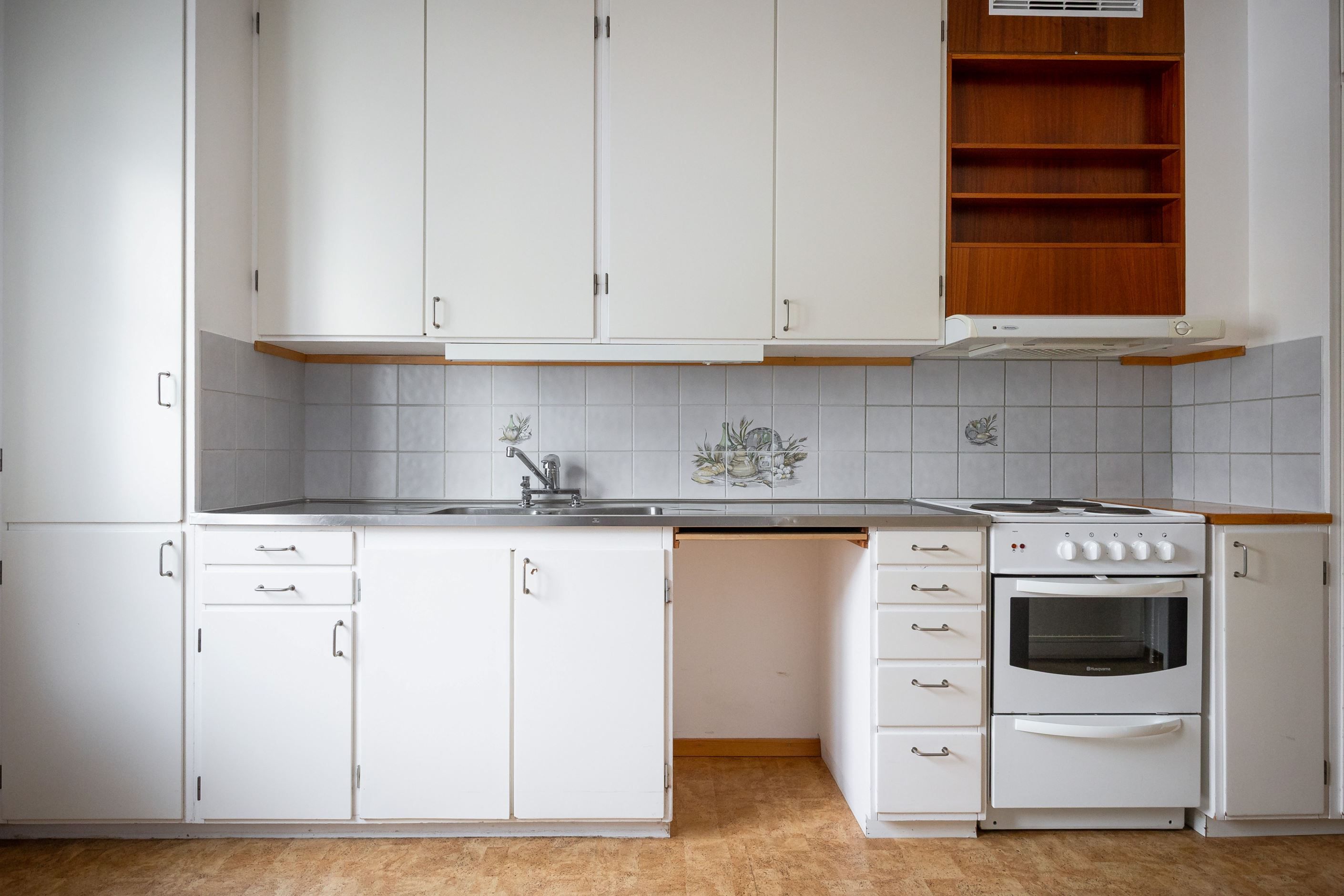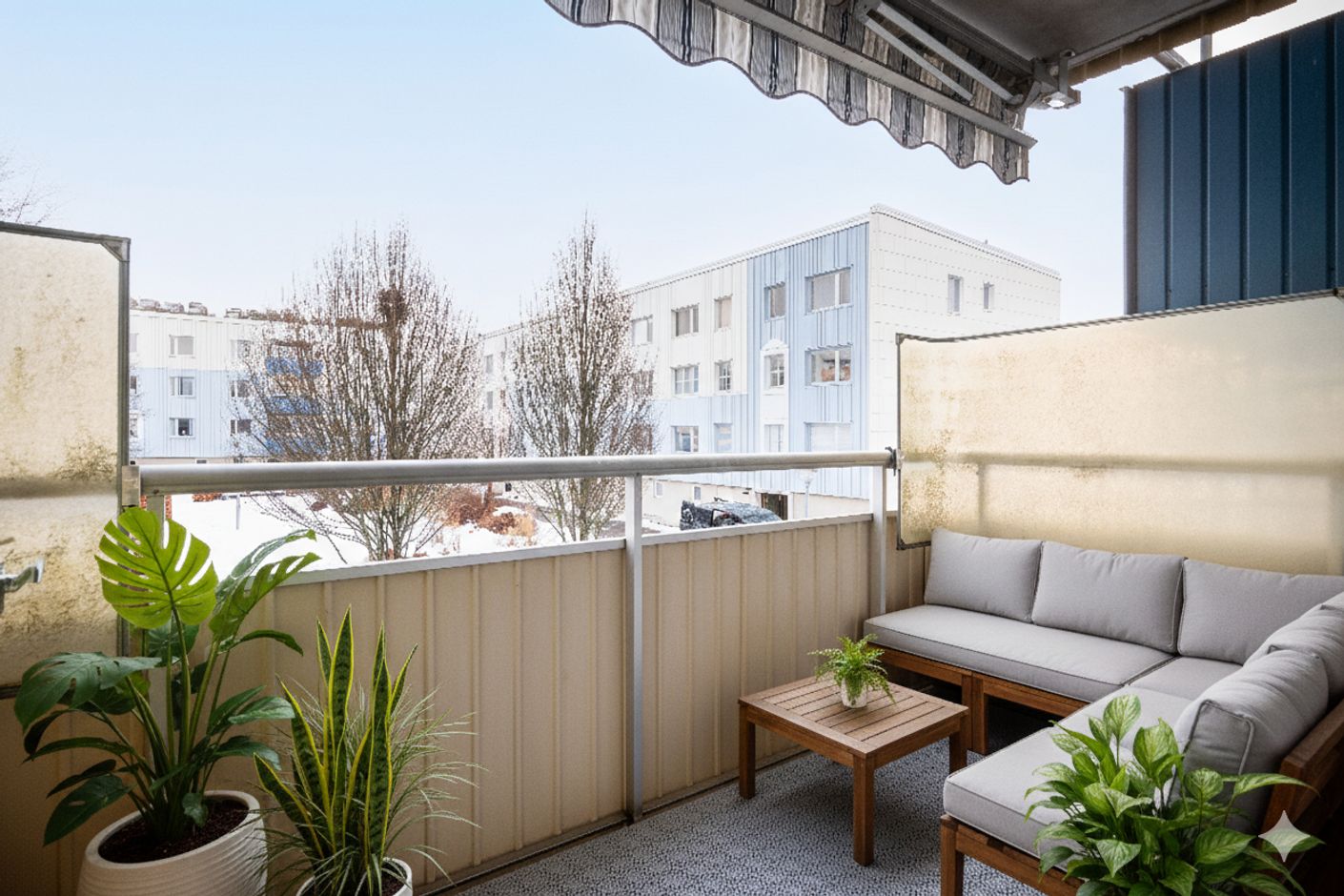 Lägenheten fördelas på en stor hall, kaklat badrum, rymligt kök med plats för matbord. Vardagsrum med parkettgolv och utgång till den stora balkongen med markis och ingen byggnad direkt framför. Det ger en känsla av frihet och rymd. Sovrummet är luftig och har 5 garderober.