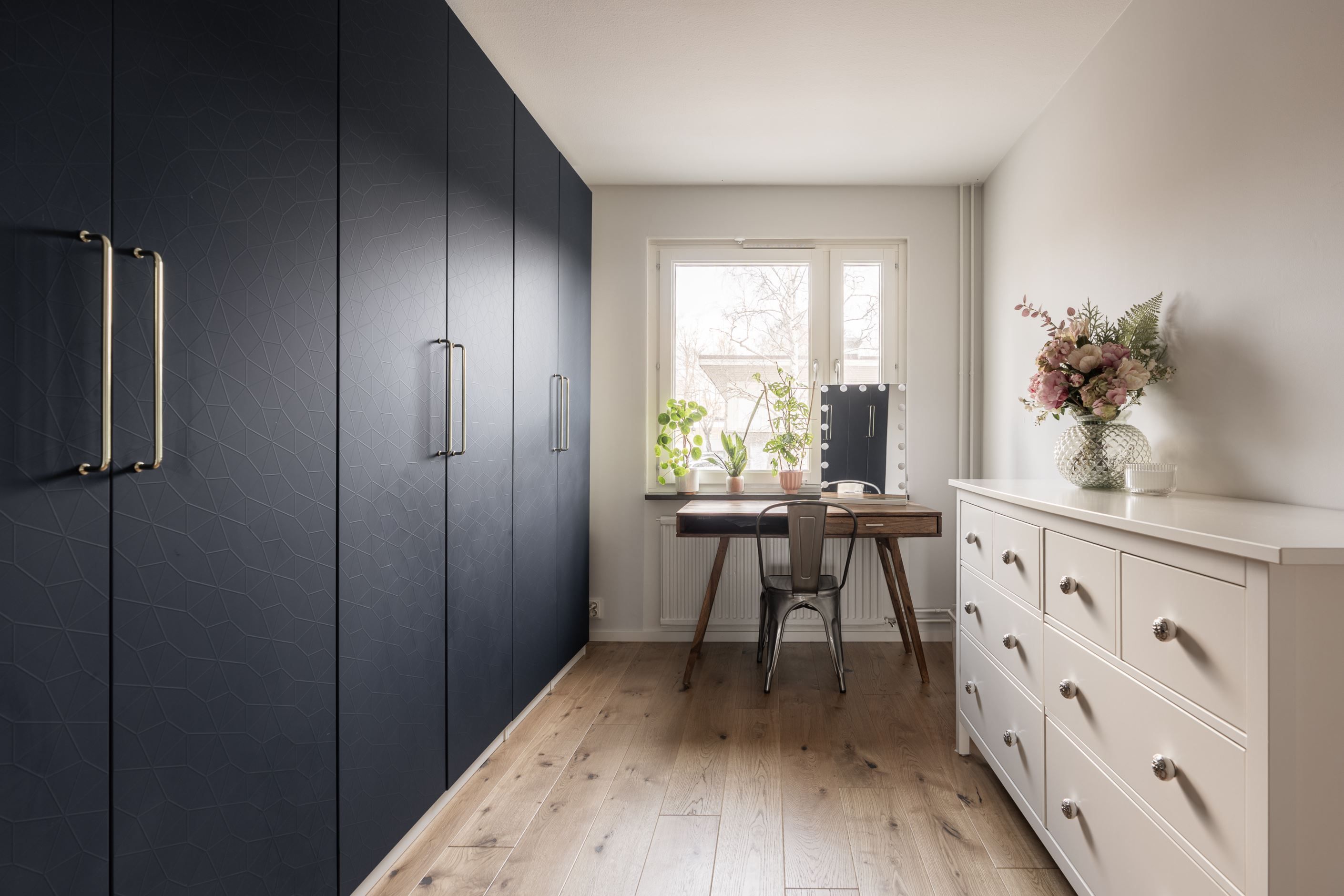 Från masterbedroom finns en praktisk klädkammare med gott om förvaring, vilket gör det enkelt att hålla ordning i vardagen.