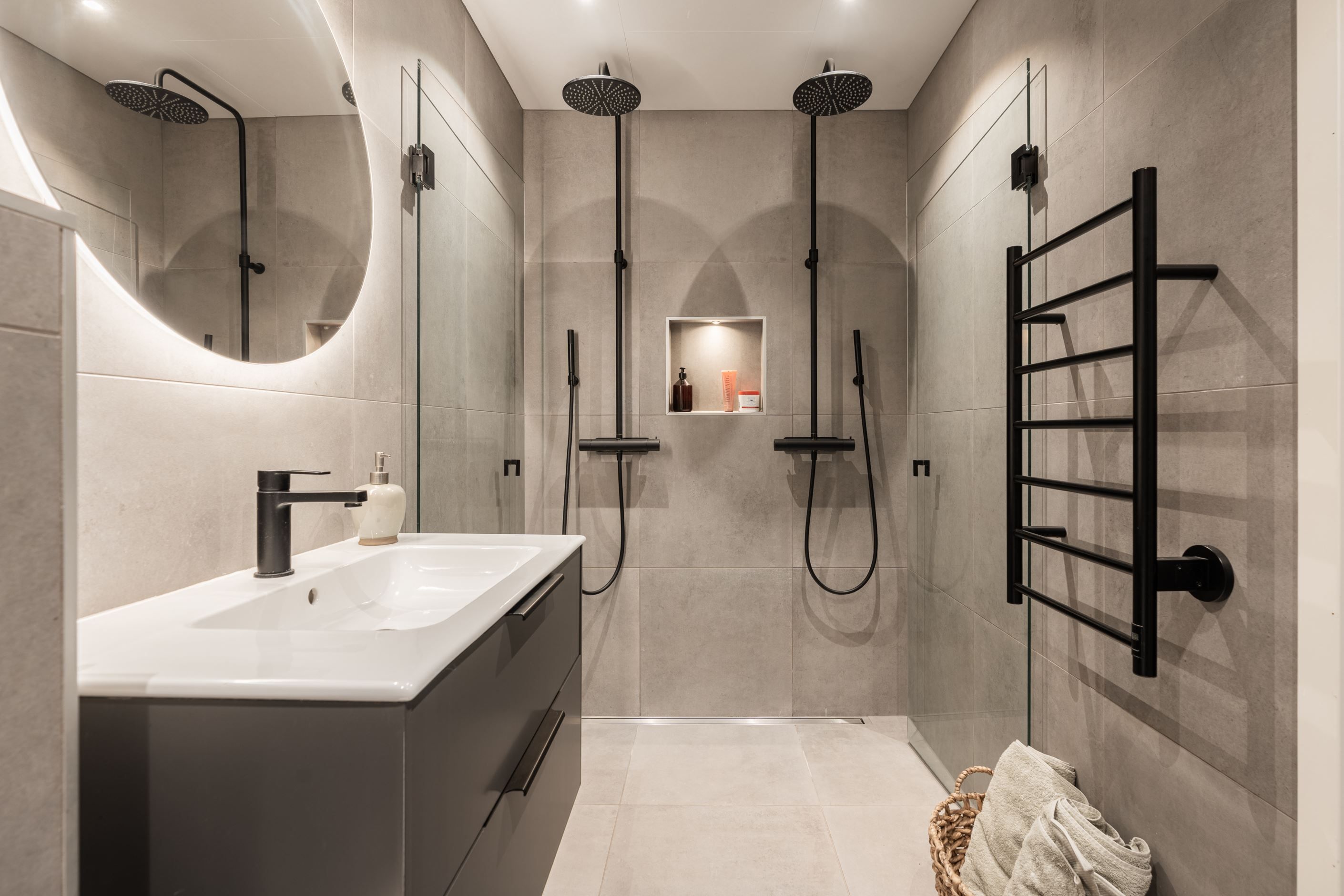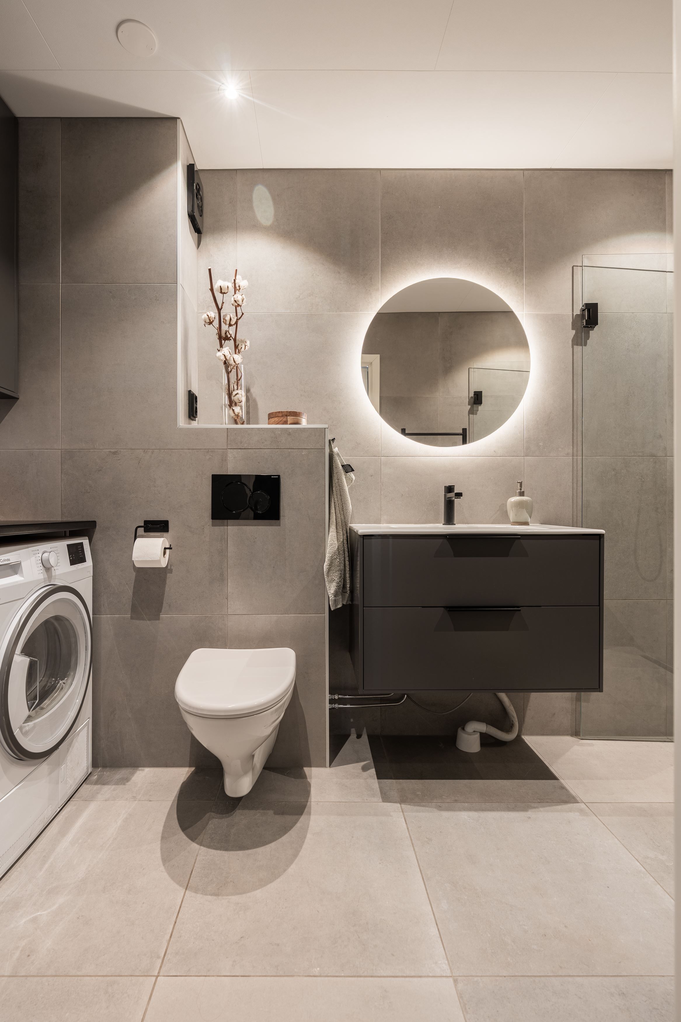 Badrummet har en exklusiv prägel med fina materialval och är utrustat med både tvättmaskin och torktumlare – bekvämt och genomtänkt.