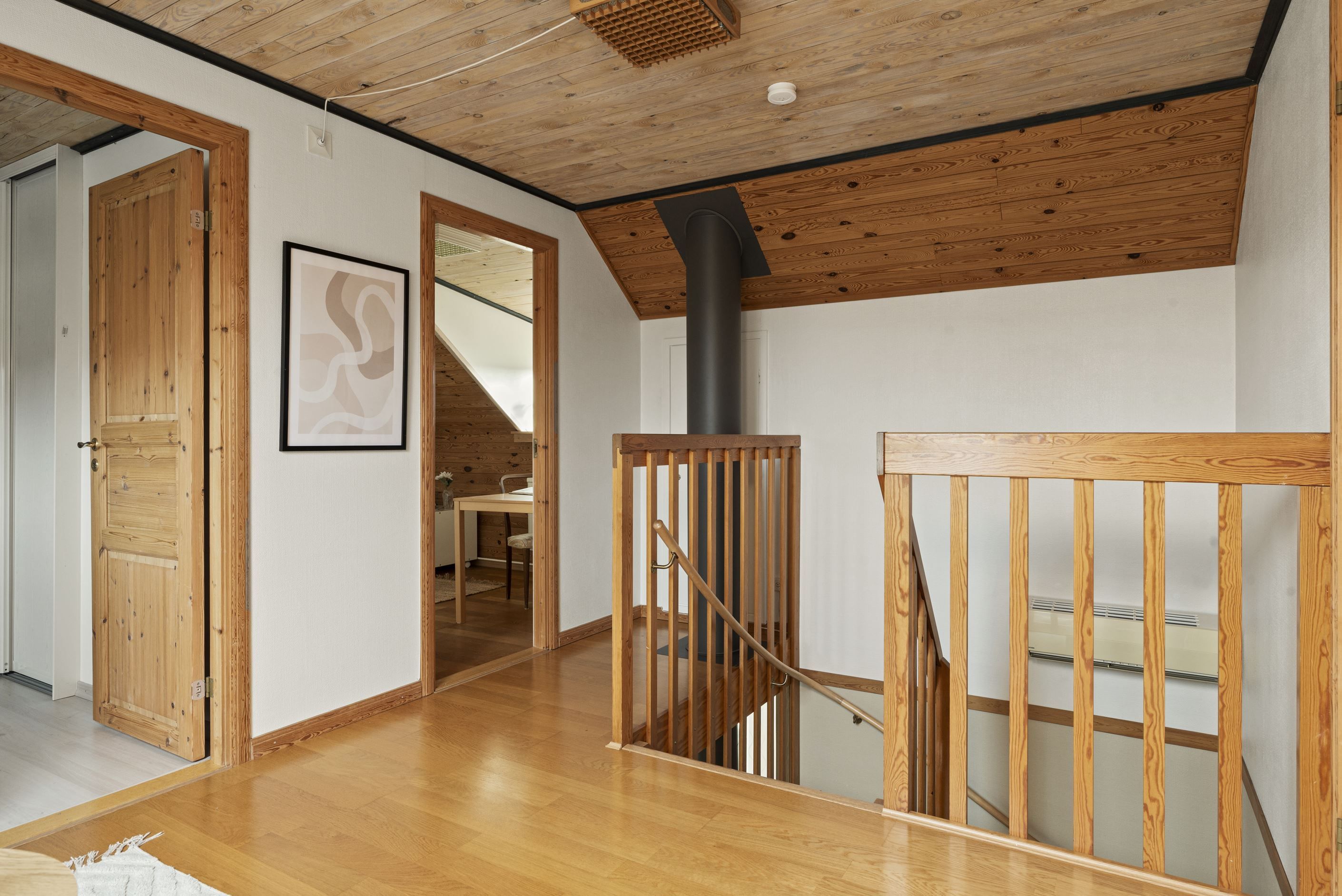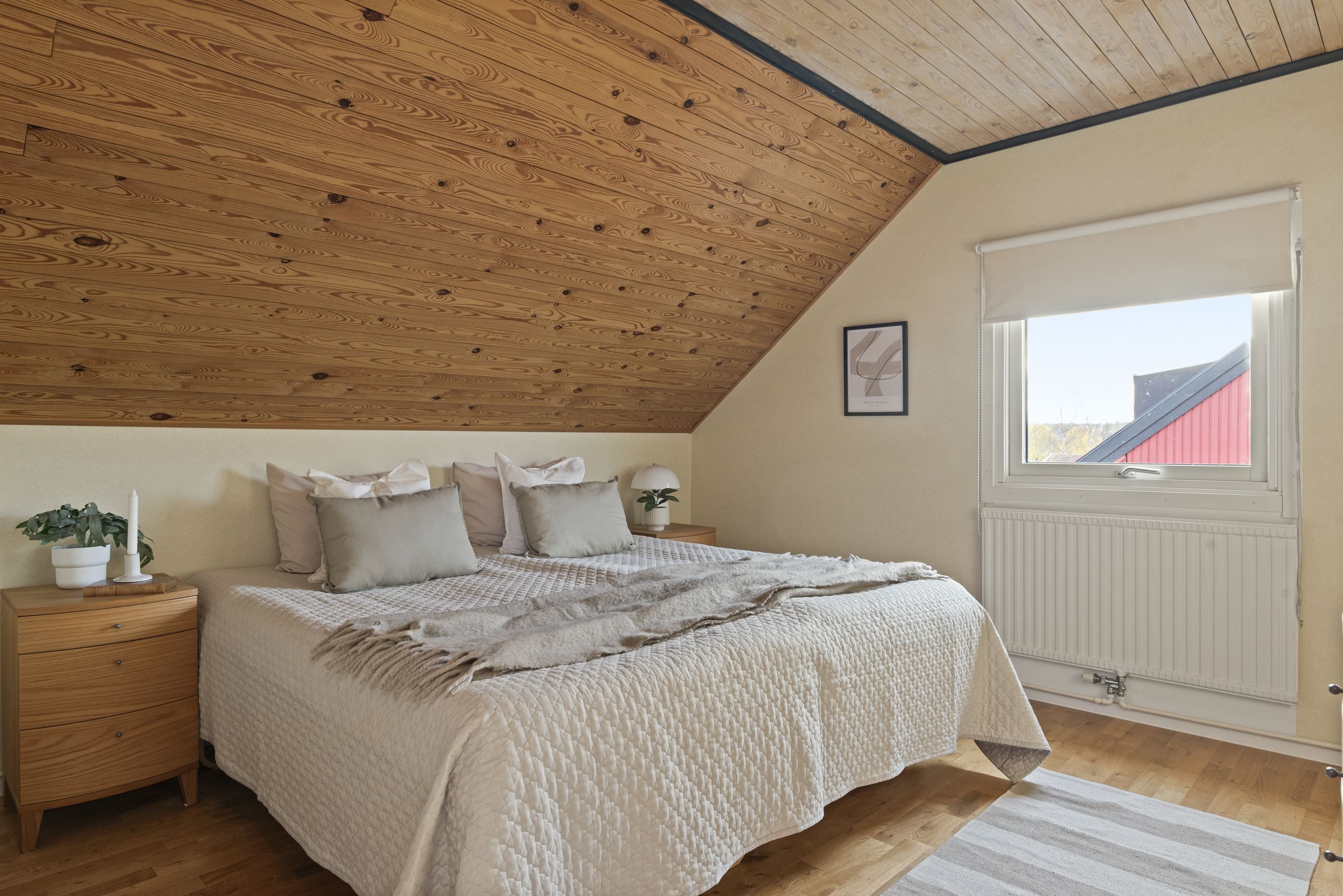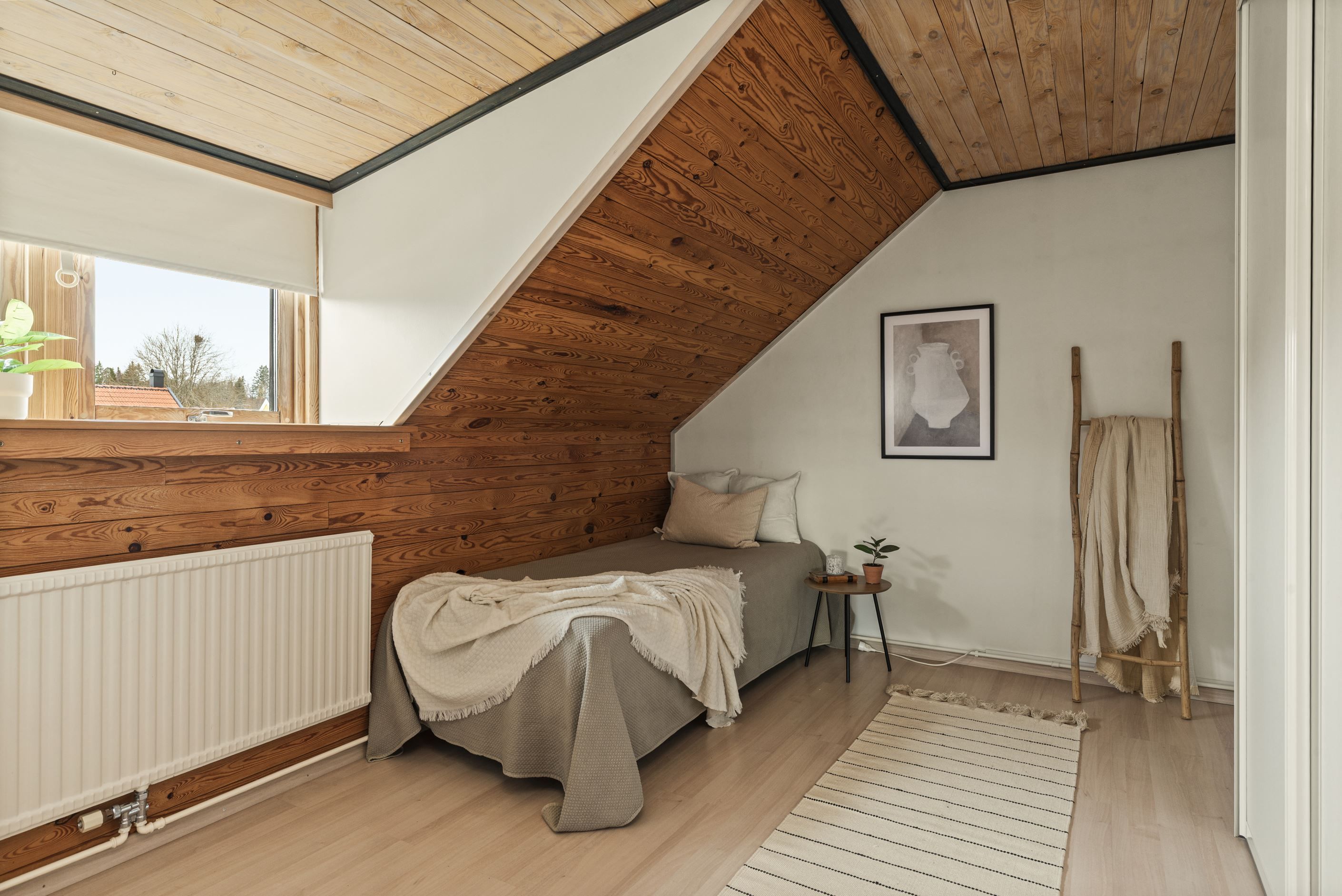 Övre plan erbjuder ett ljust och trivsamt allrum – idealiskt som TV-hörna eller barnens lekyta. Här finns tre sovrum, varav ett större med extra utrymme som kan användas som klädkammare. Planlösningen kompletteras av ett smakfullt och stilrent duschrum i tidlös design.