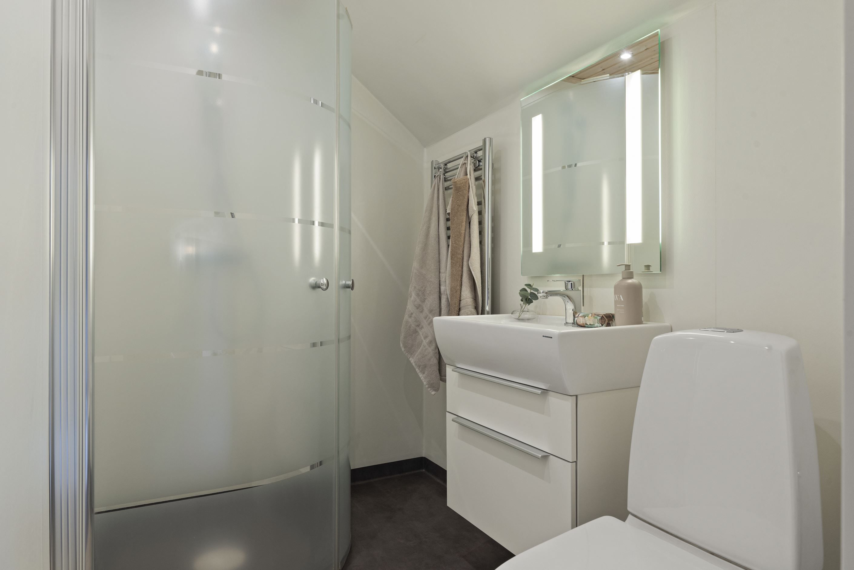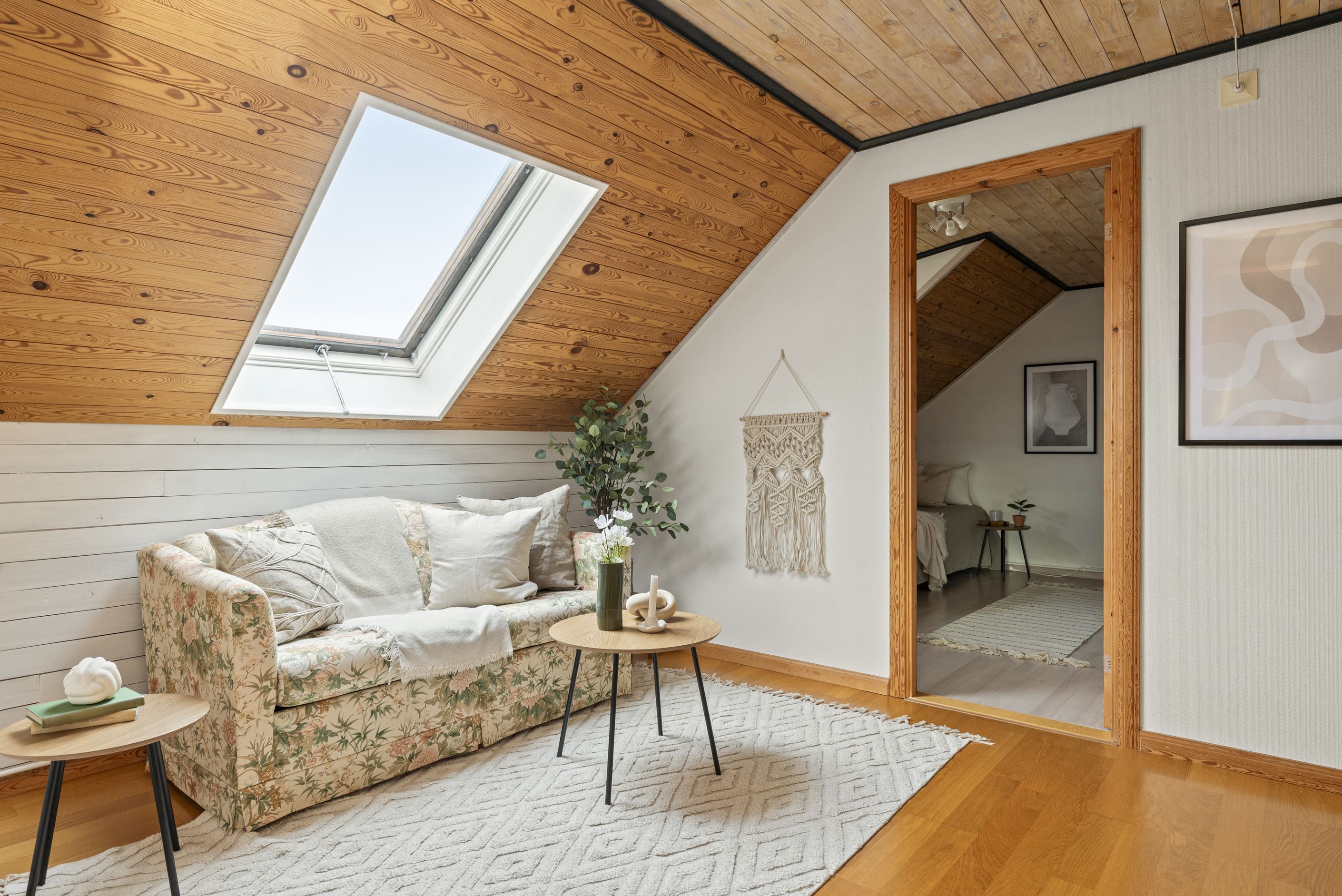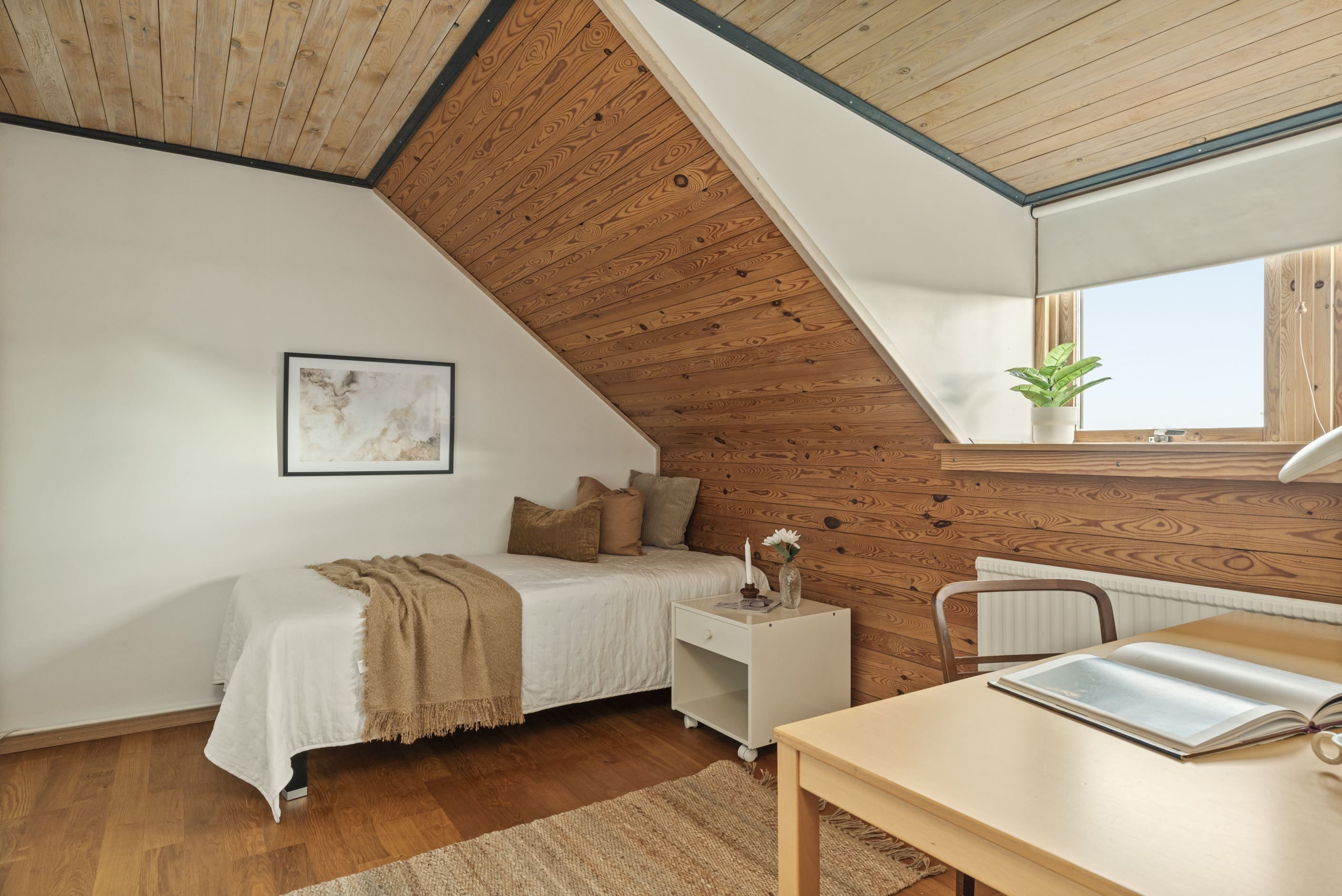 Övre plan erbjuder ett ljust och trivsamt allrum – idealiskt som TV-hörna eller barnens lekyta. Här finns tre sovrum, varav ett större med extra utrymme som kan användas som klädkammare. Planlösningen kompletteras av ett smakfullt och stilrent duschrum i tidlös design.