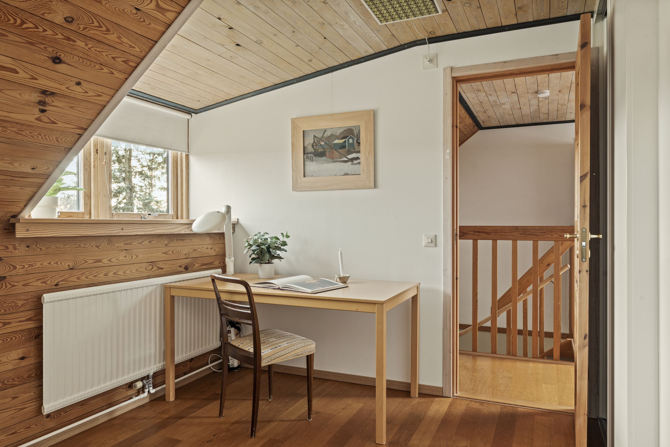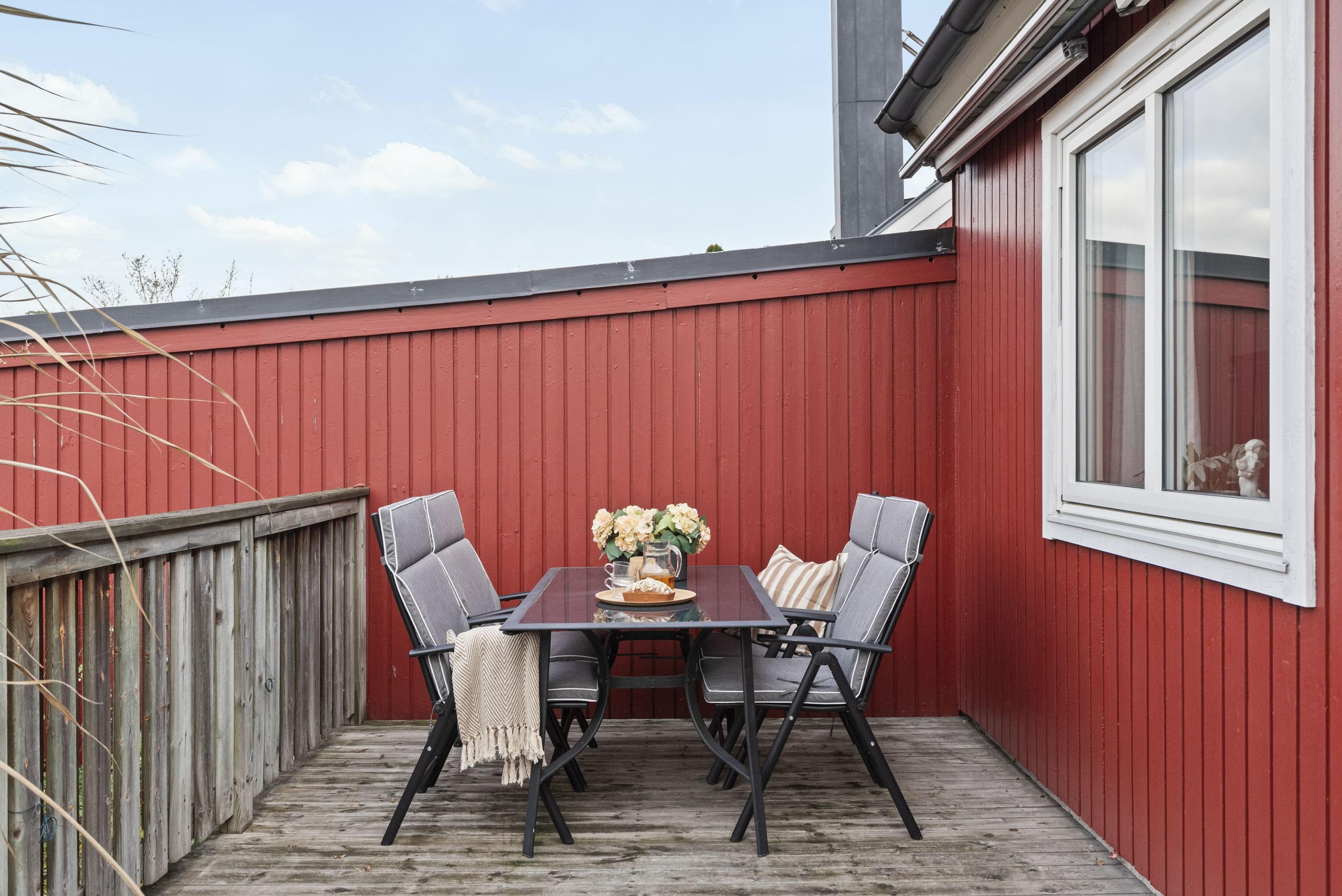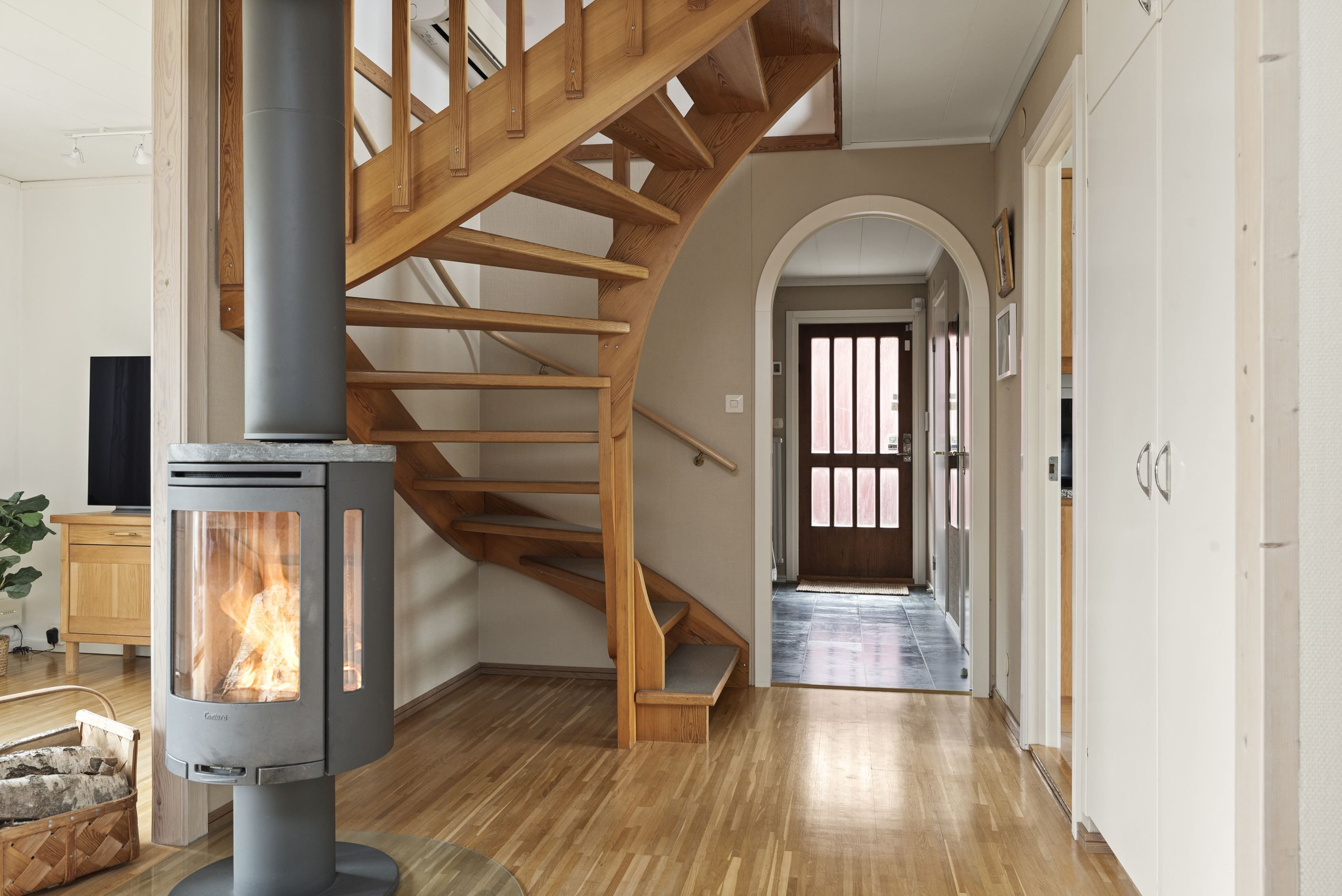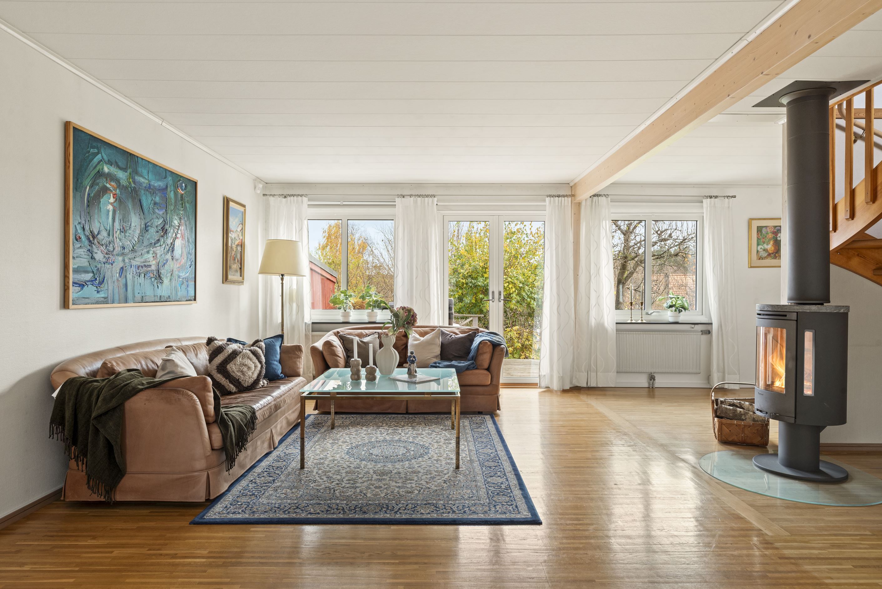 Vidare in öppnar huset upp sig mot ett stort och ljust vardagsrum med generösa fönsterpartier som släpper in rikligt med dagsljus. Den stämningsfulla kaminen blir en naturlig samlingspunkt och sprider värme under årets kallare månader. Från vardagsrummet nås den stora träaltanen – en självklar plats för sommarens middagar och avkoppling.
