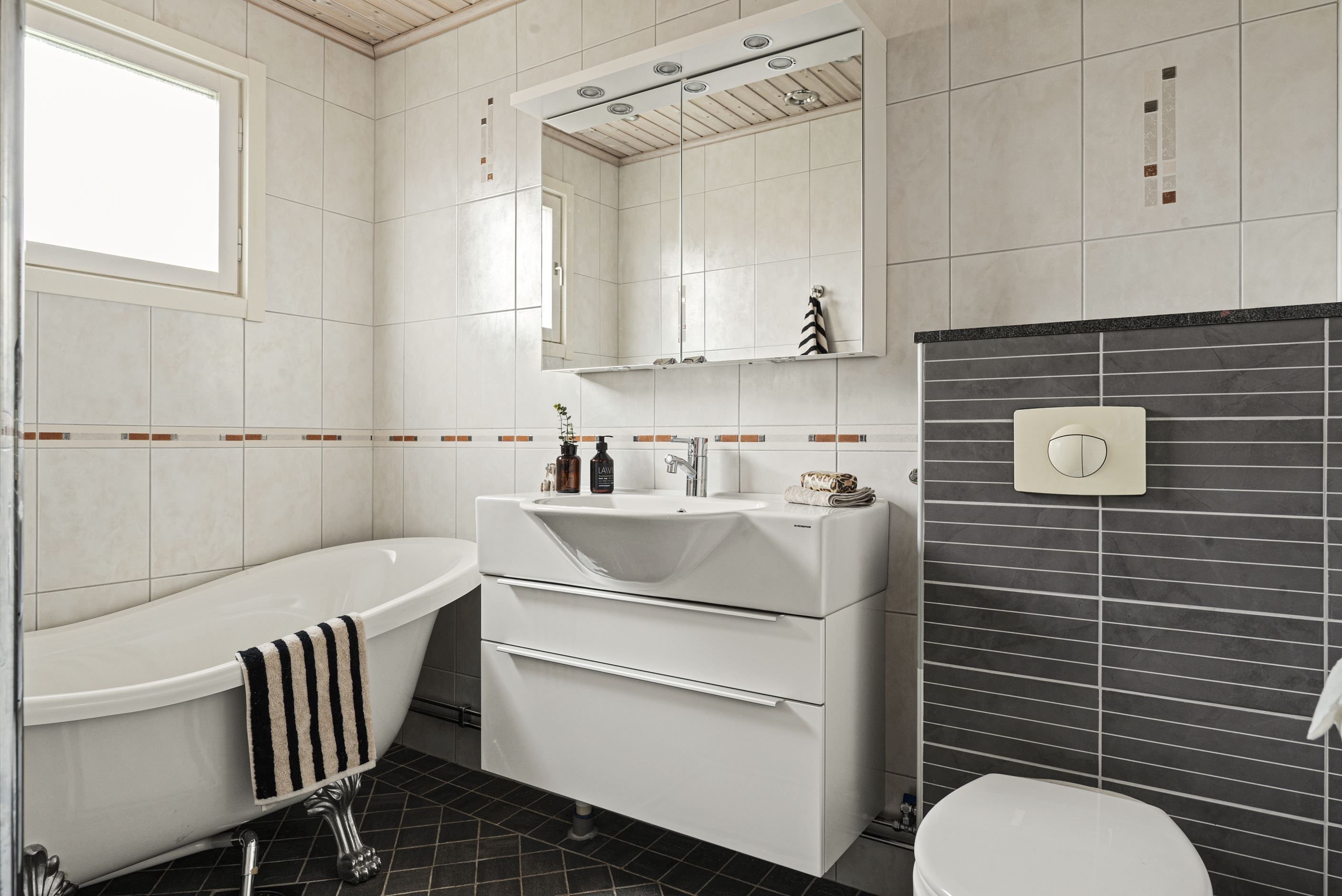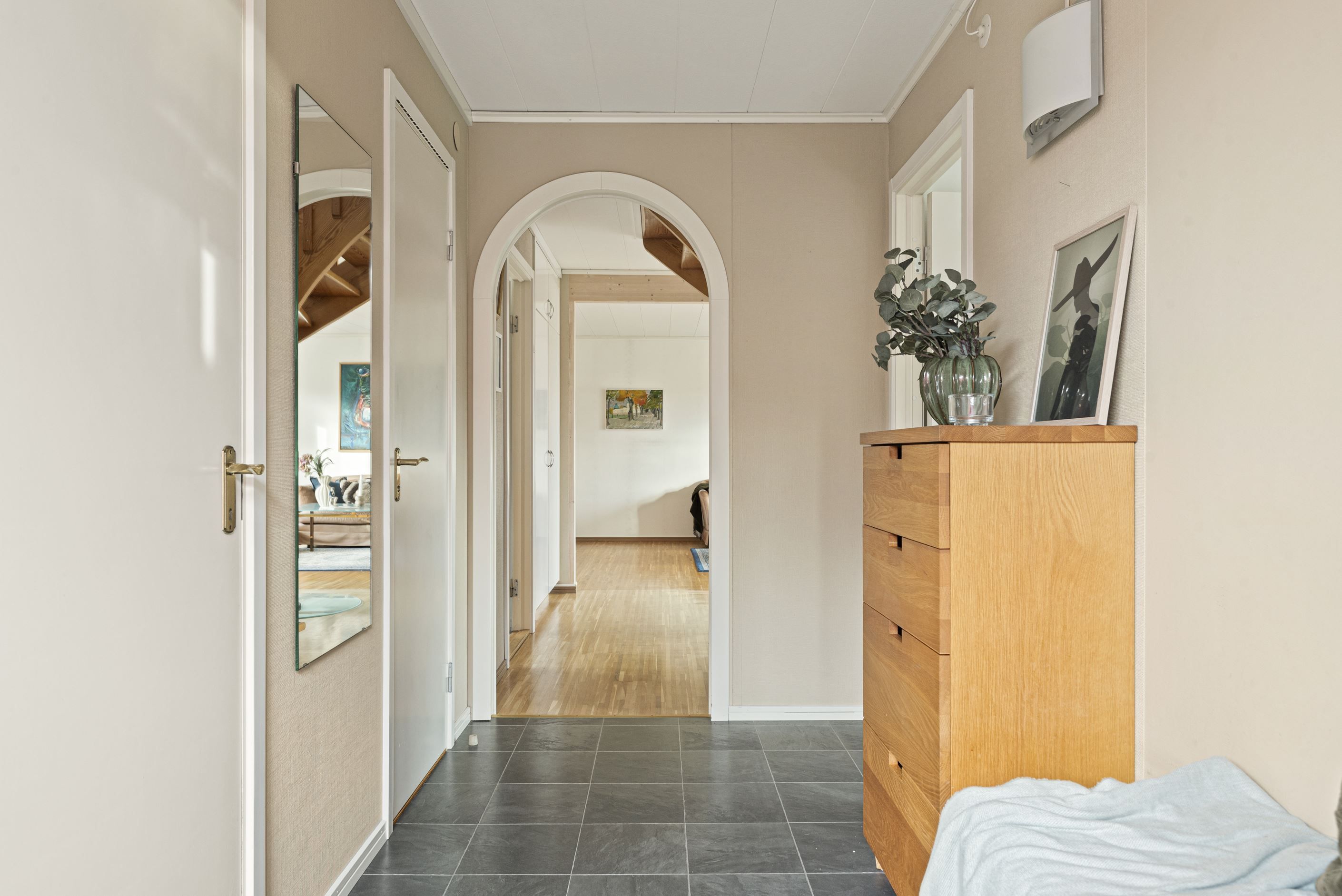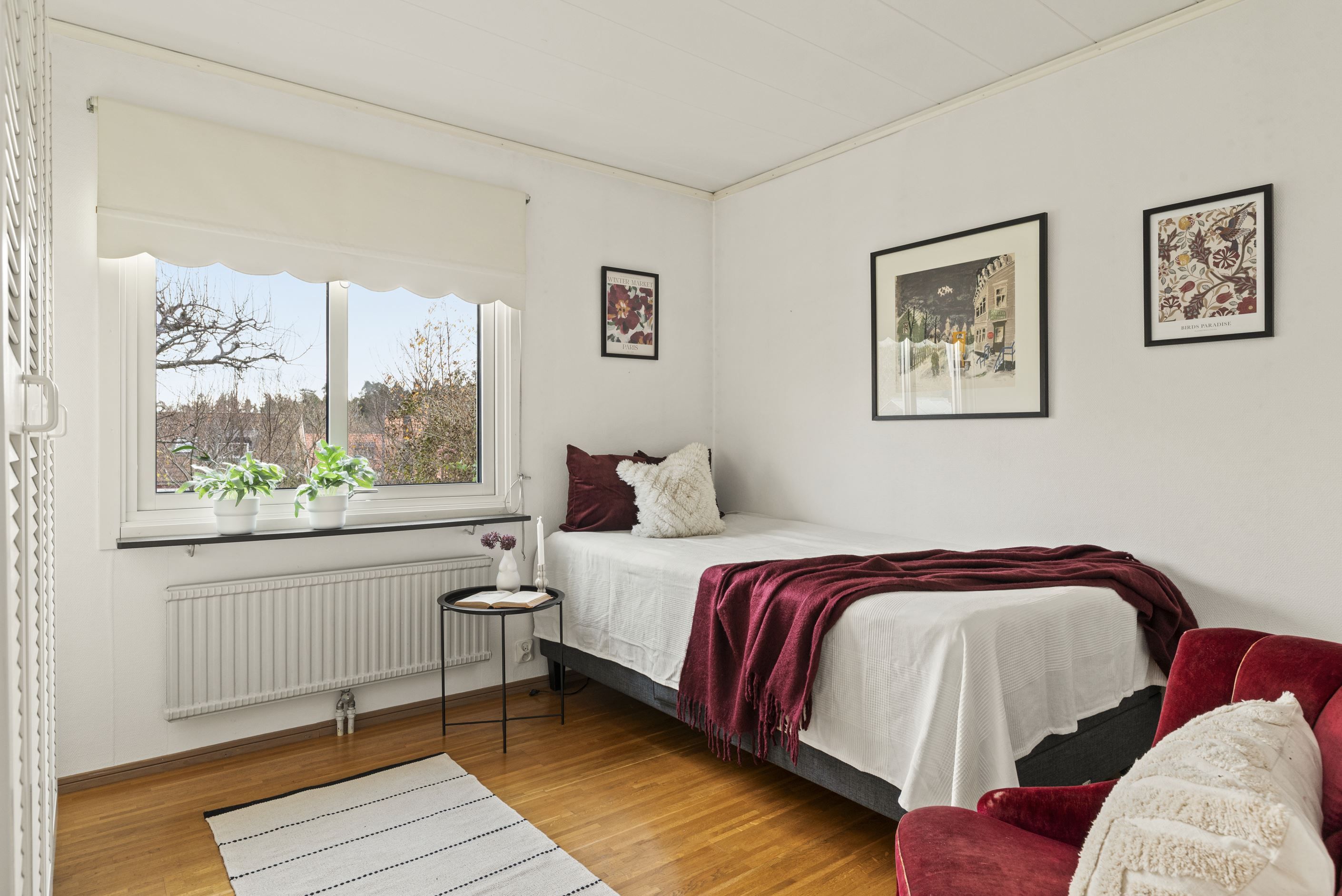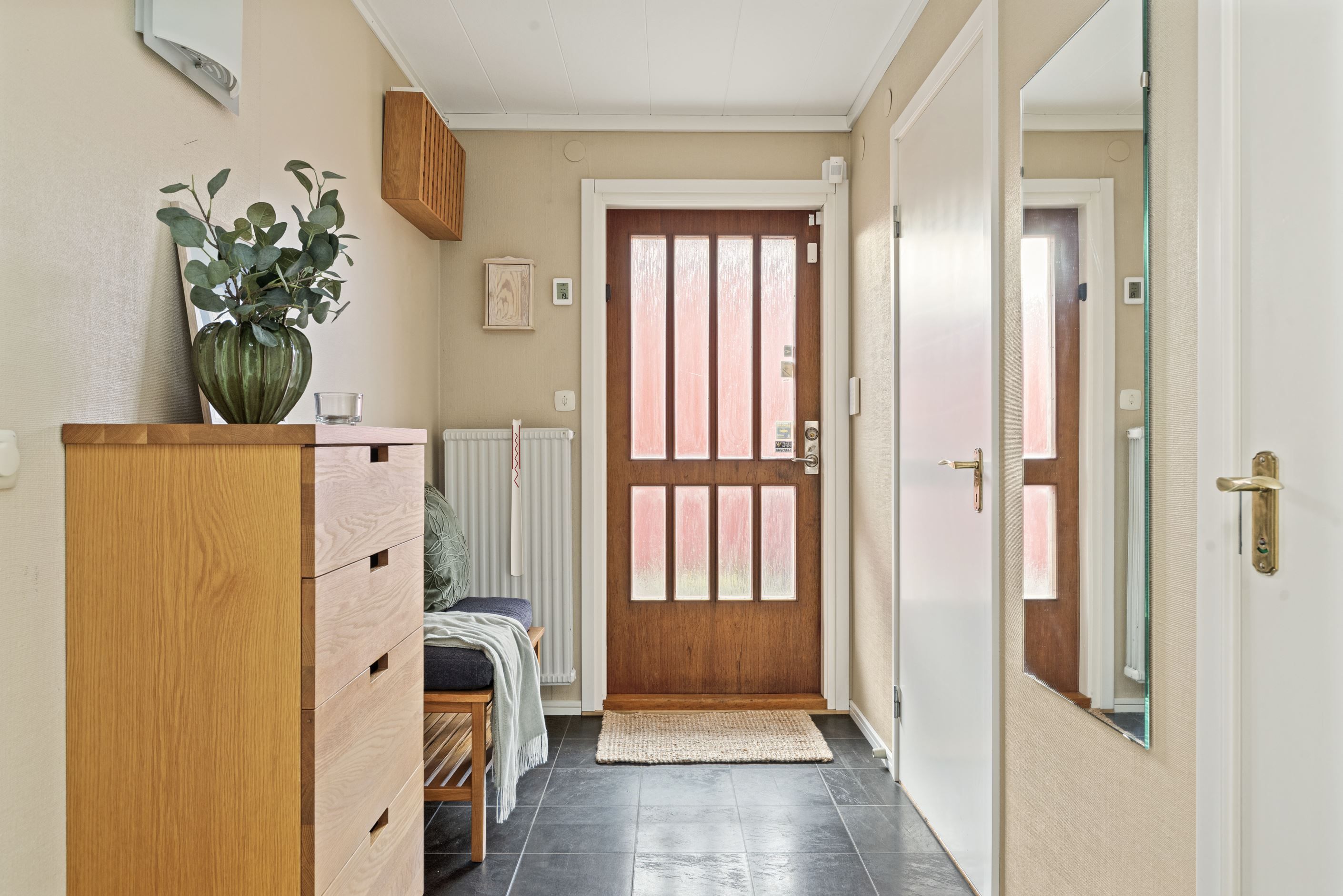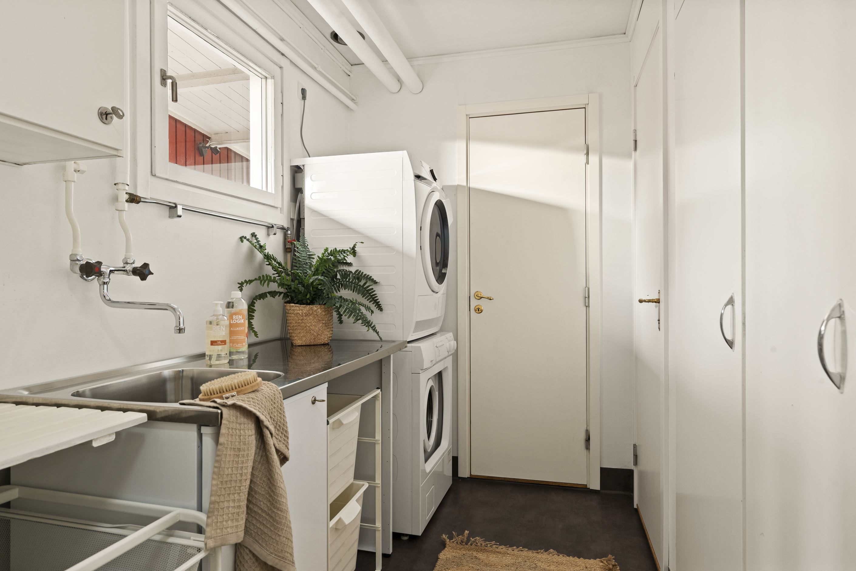 Ni välkomnas av en trivsam atmosfär i hallen som sätter tonen för resten av huset. Till vänster finns en funktionell tvättstuga med intilliggande pannrum samt ett rymligt och fräscht badrum. Här finns även ett harmoniskt sovrum med utsikt över den gröna och stillsamma baksidan.