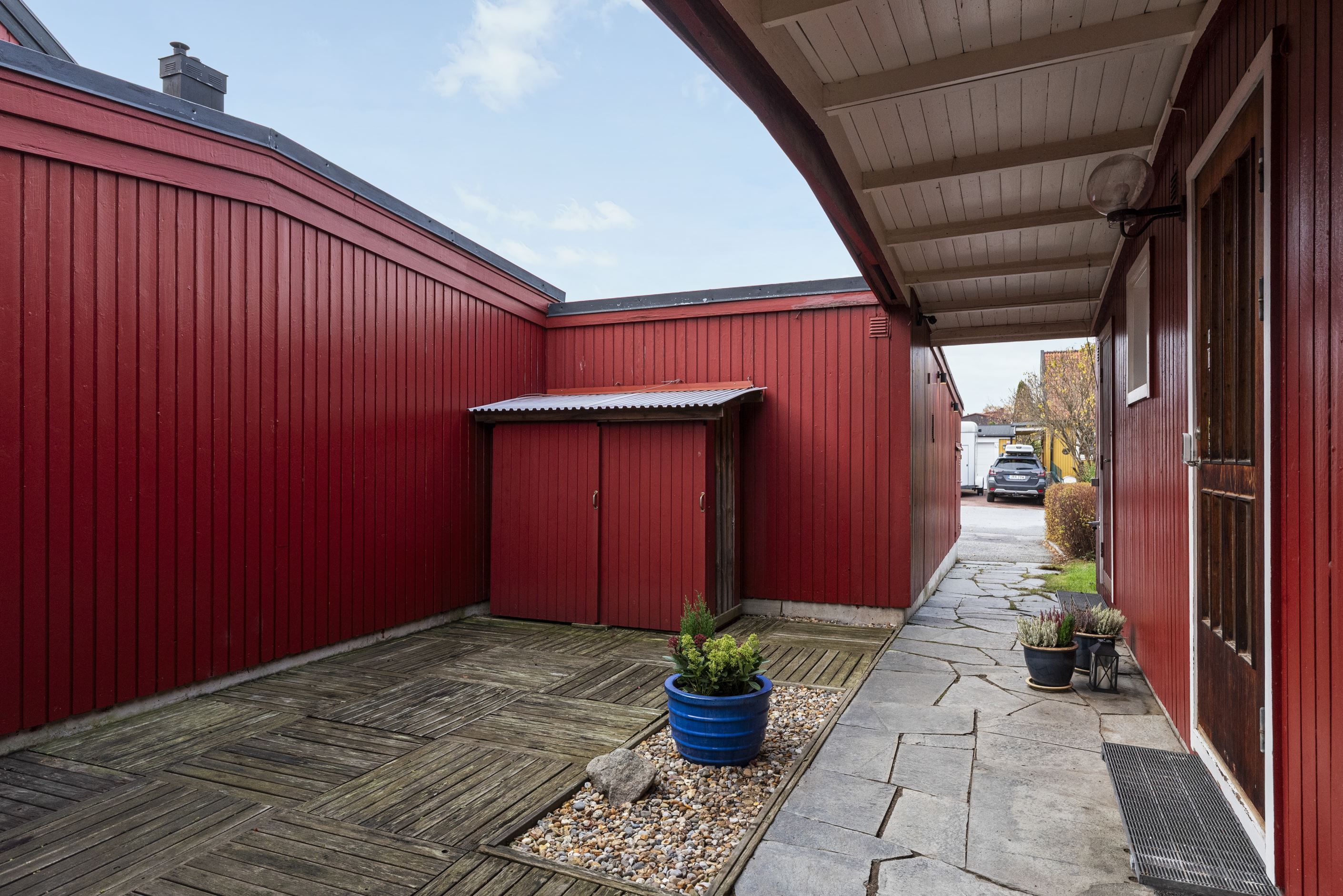 Mellan byggnaderna finns en stenlagd yta som passar perfekt för cyklar, plantering eller en extra sittgrupp.