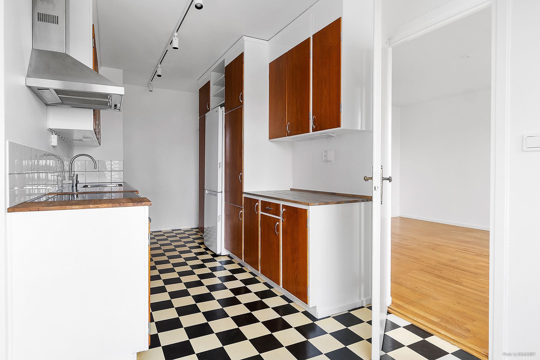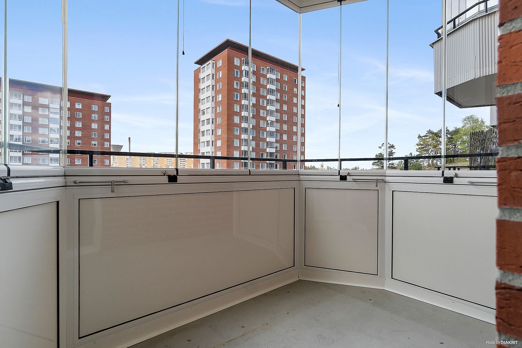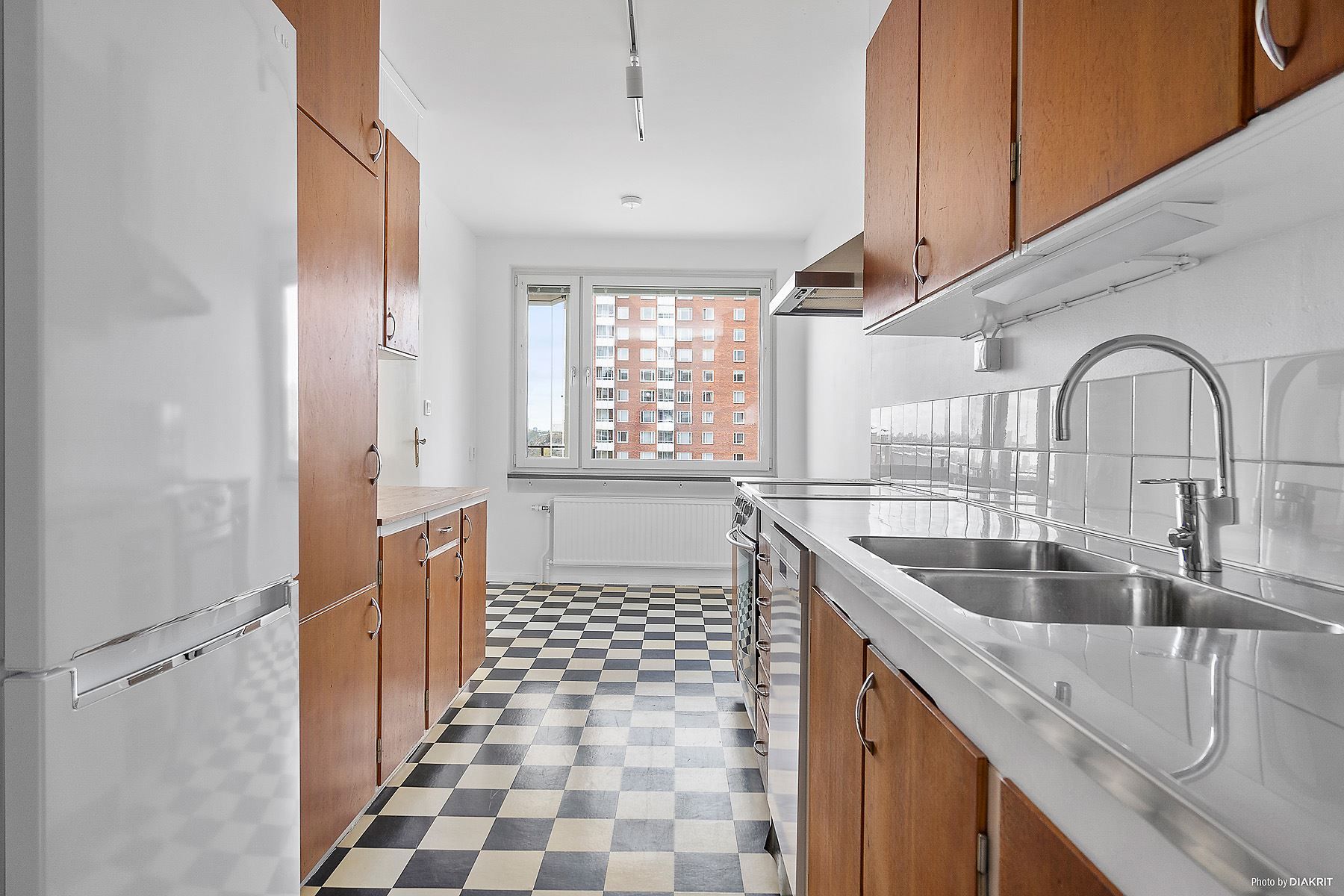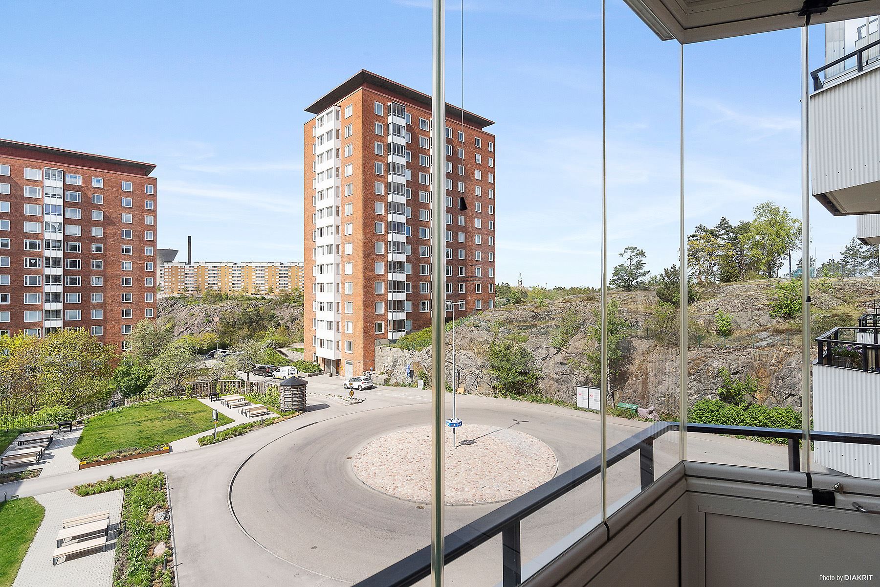 Köket är ljust och trivsamt, med en naturlig plats för matgrupp. Det rymliga vardagsrummet ger stora möbleringsmöjligheter och härifrån nås den inglasade balkongen i västerläge, där du kan njuta av eftermiddagssolen och en härlig utsikt mot Stockholms stad. Badrummet är kaklat och utrustat med dusch. En generös hall binder samman bostadens alla rum och erbjuder förvaringsmöjligheter efter behov samt en klädkammare.