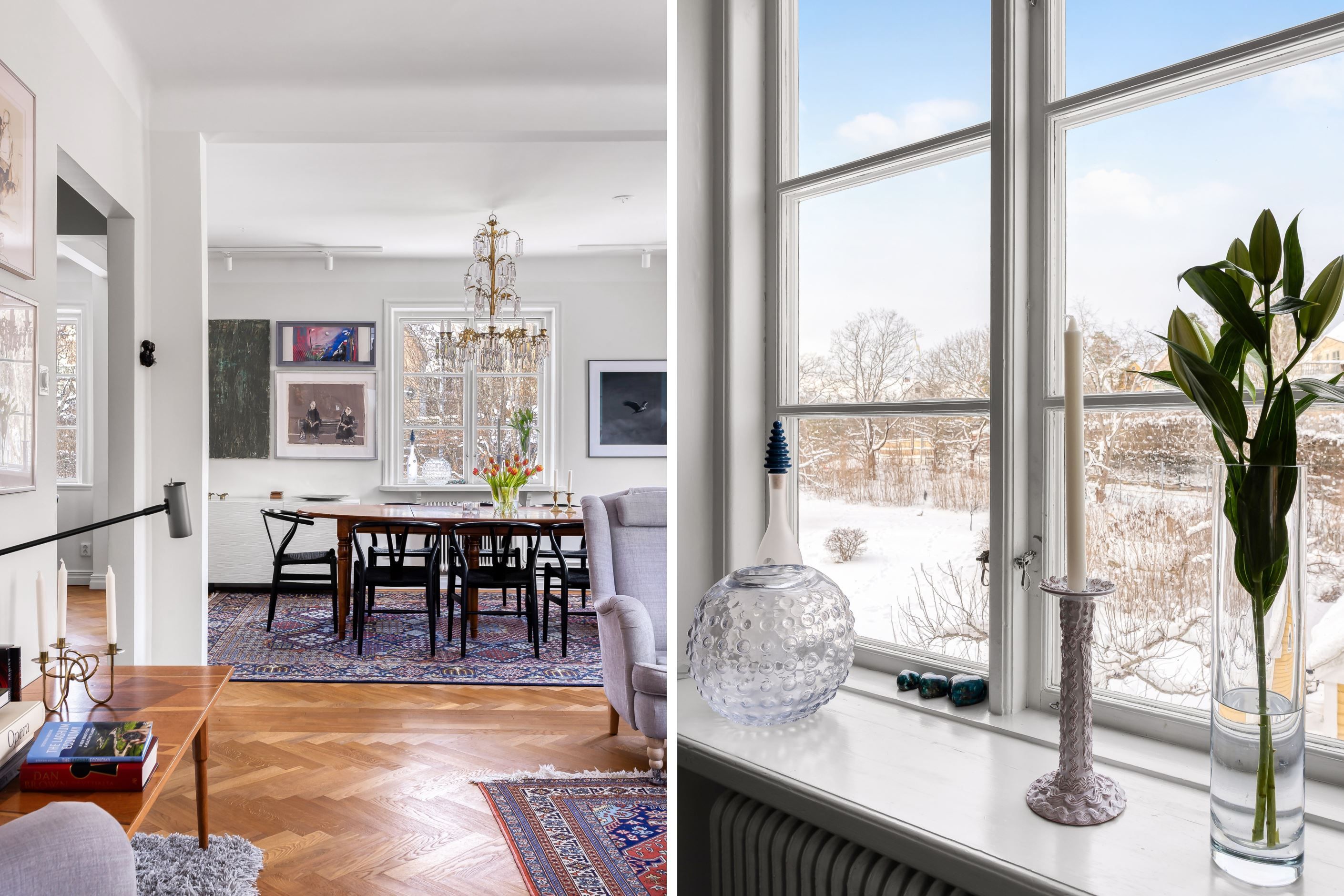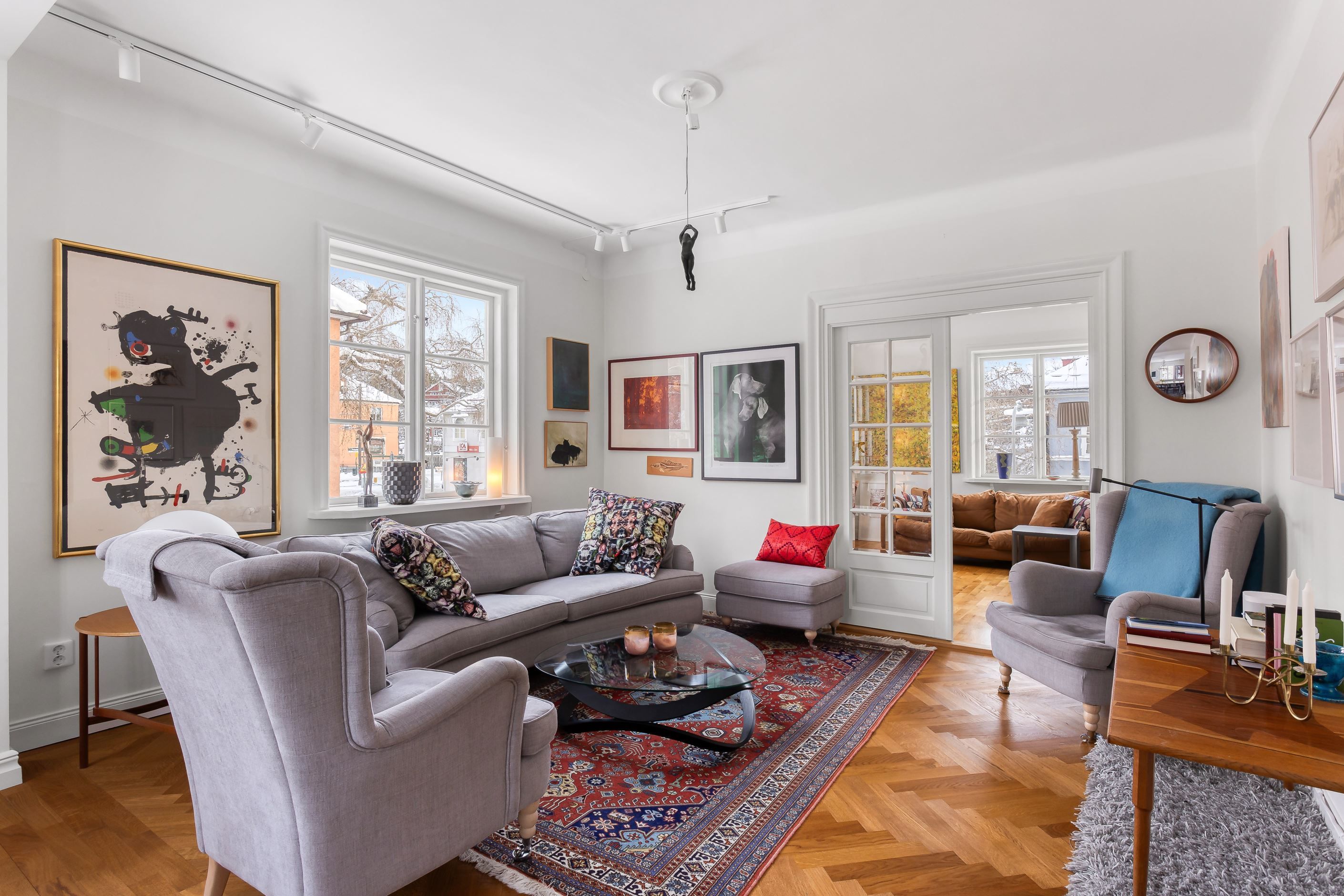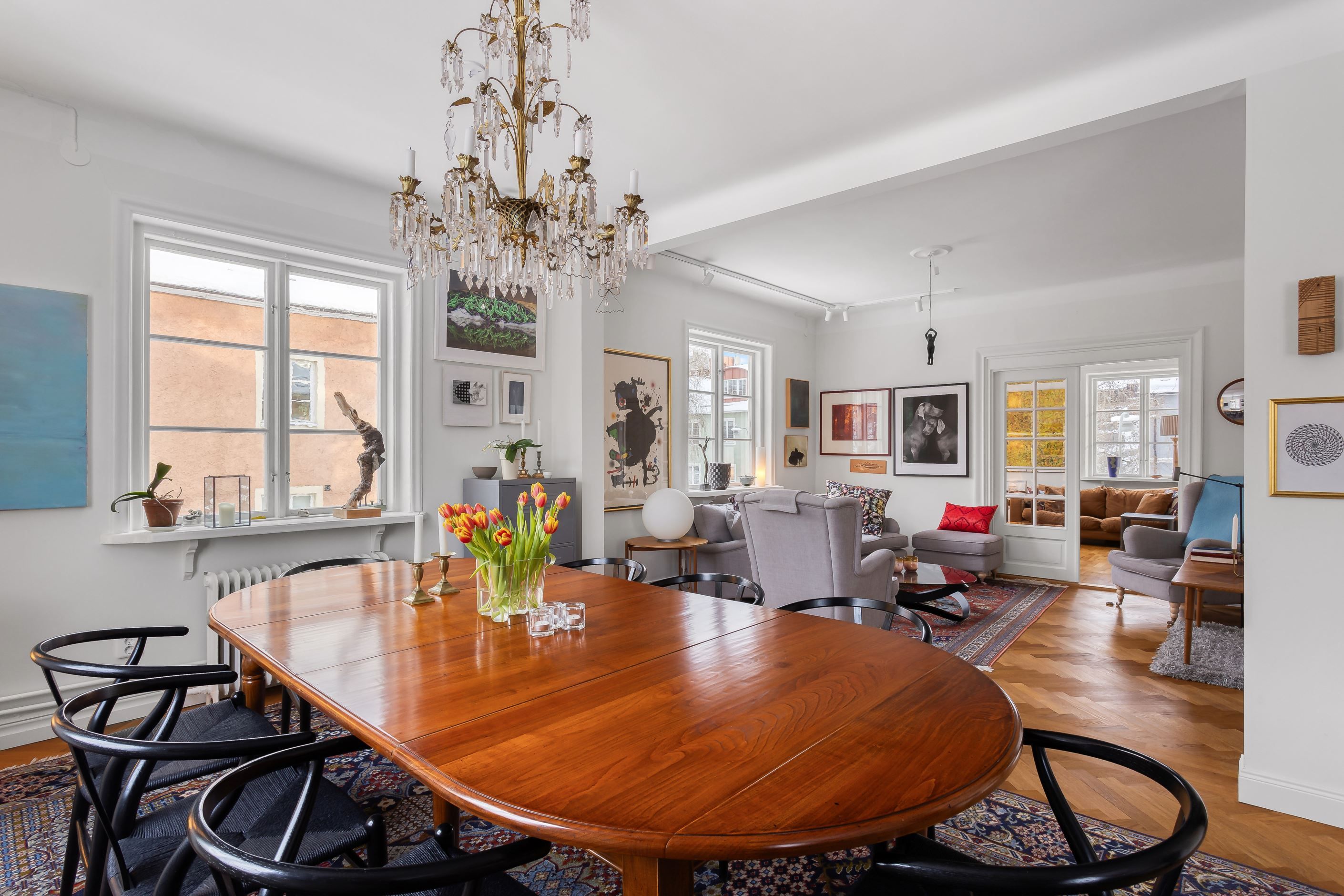 Den vackra och påkostade våningen har ett genomgående fint skick med ljus interiör och trägolv, vilket utgör en tacksam bas att möblera mot. 1920-talscharmen bevarad i de vackra spröjsade fönstren i tre väderstreck, spegeldörrar och djupa nischer m.m. Den generösa takhöjden ger luftiga ytor. Tilltalande gavelläge mot torget, kök i öppen planlösning med rymlig matsalsdel och sällskapsyta, två bra sovrum samt påkostade våtrum - badrum och två separata toaletter. Möjlighet till dubbla entréer, vilket gör boendet mer flexibelt.