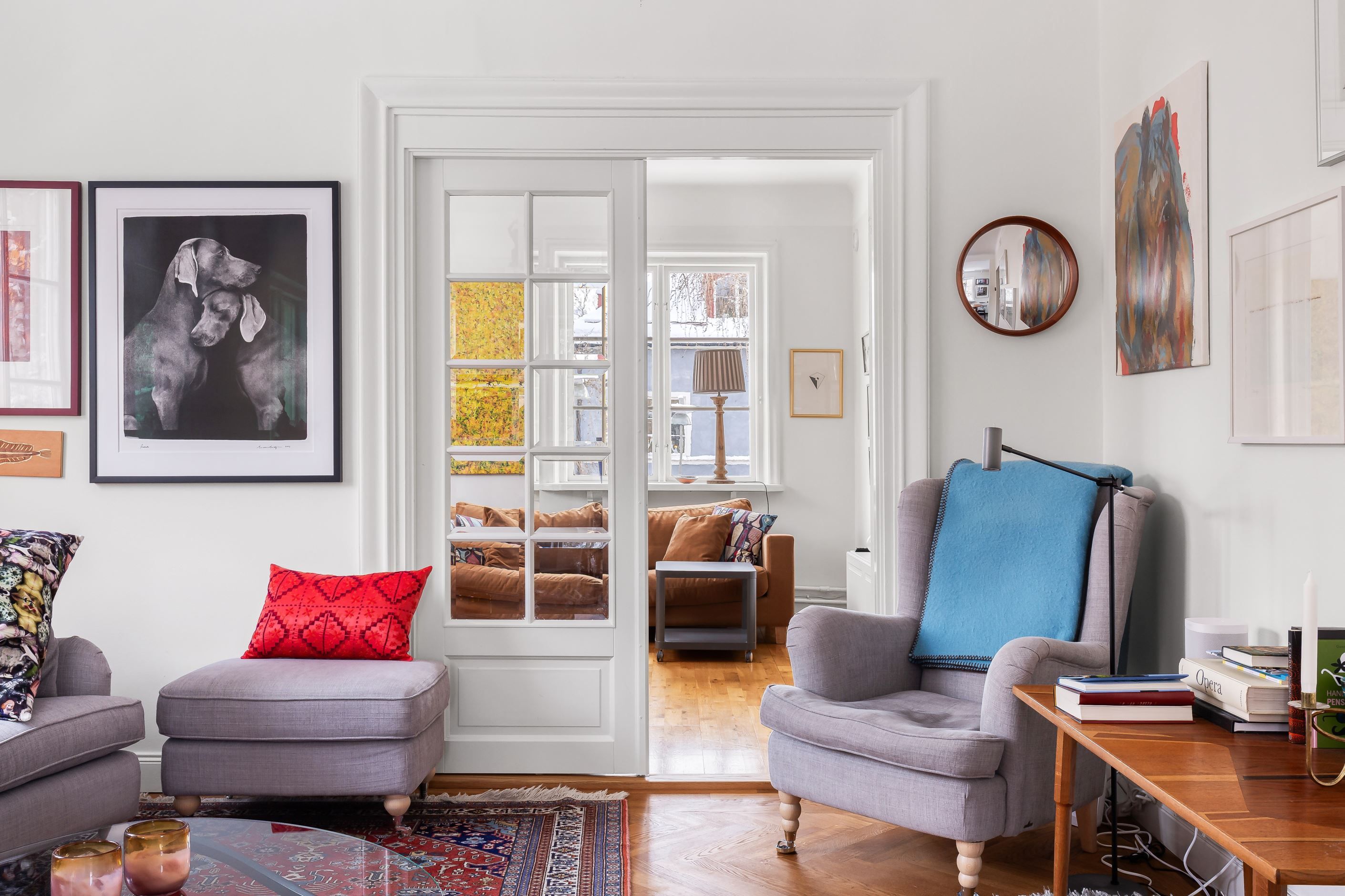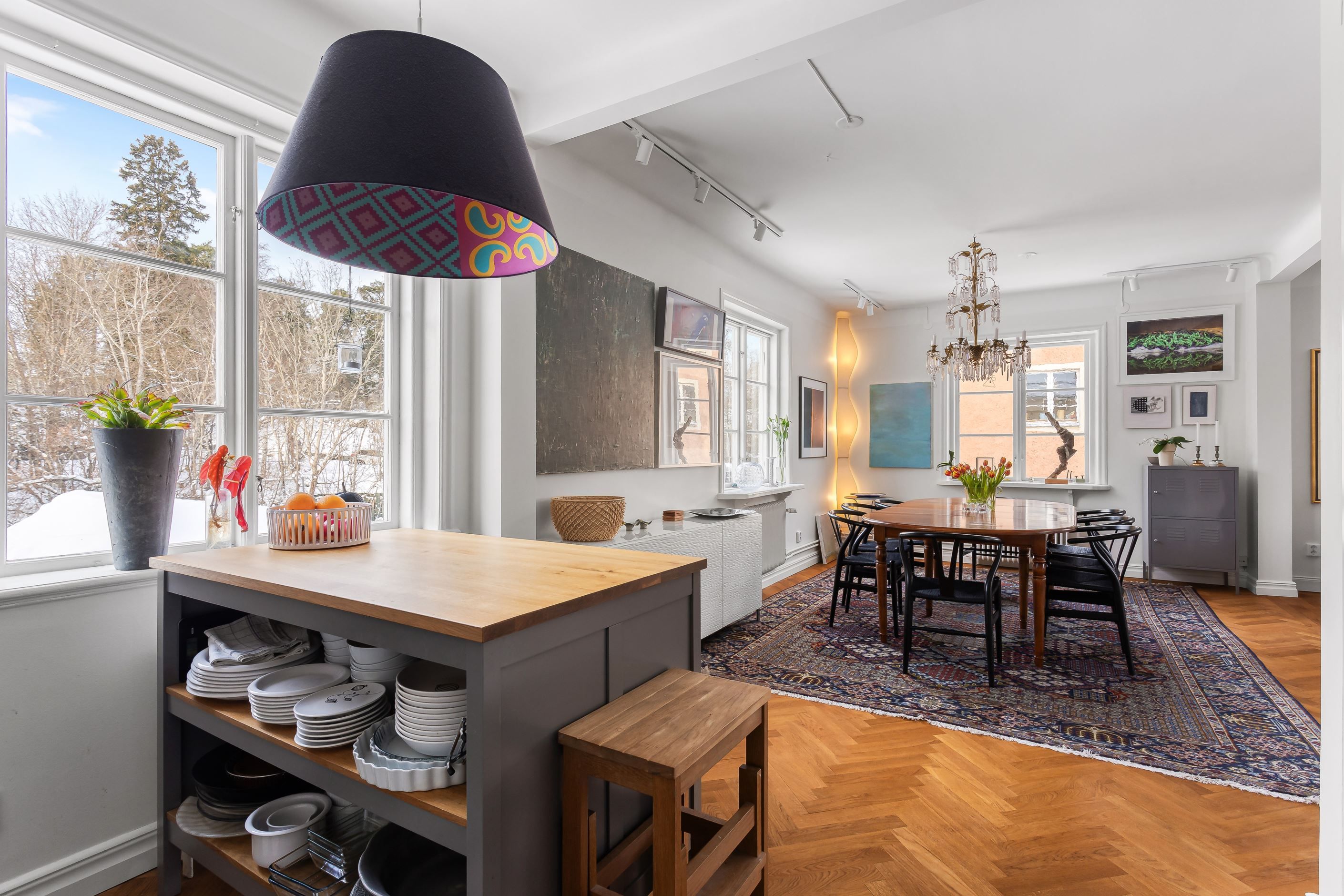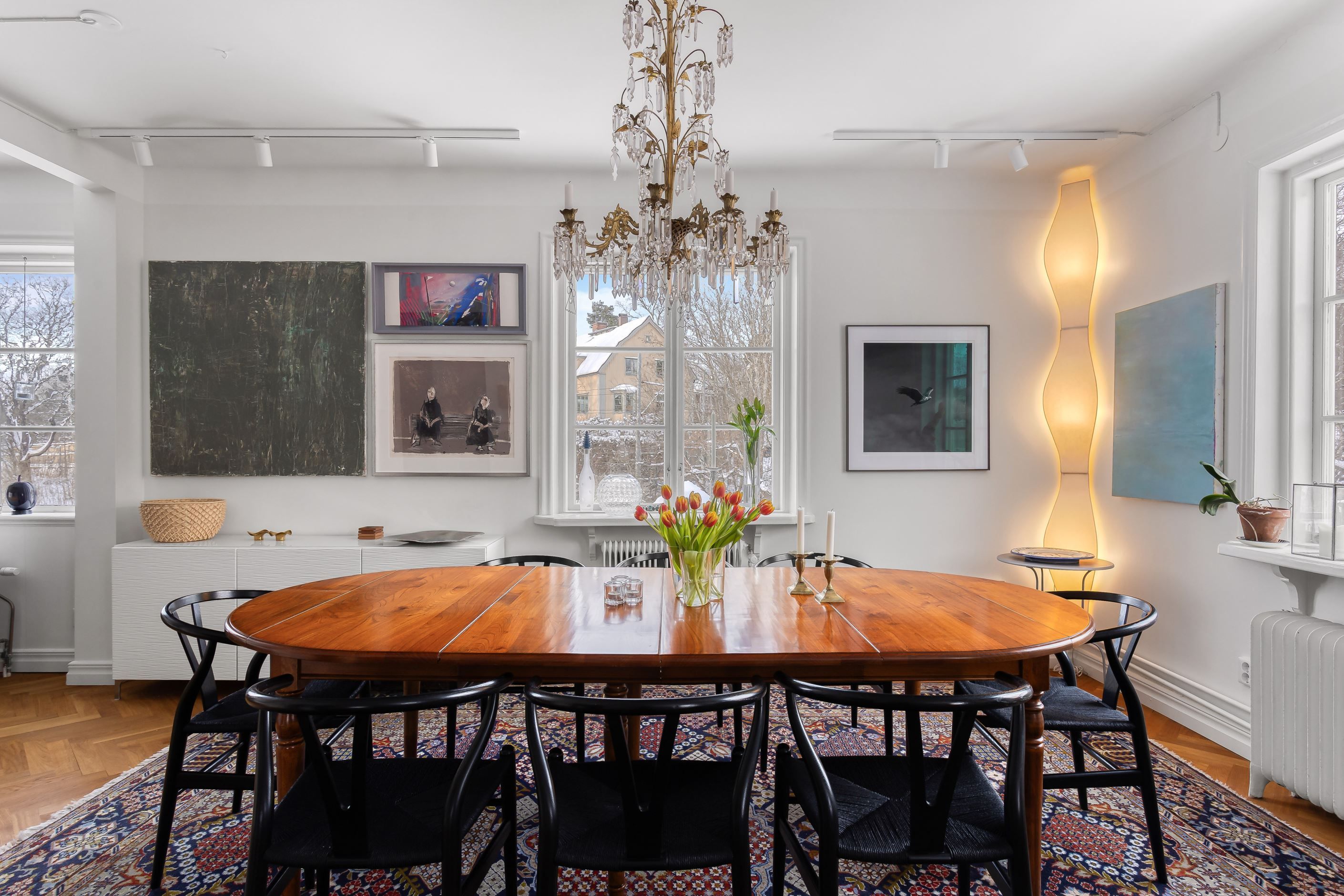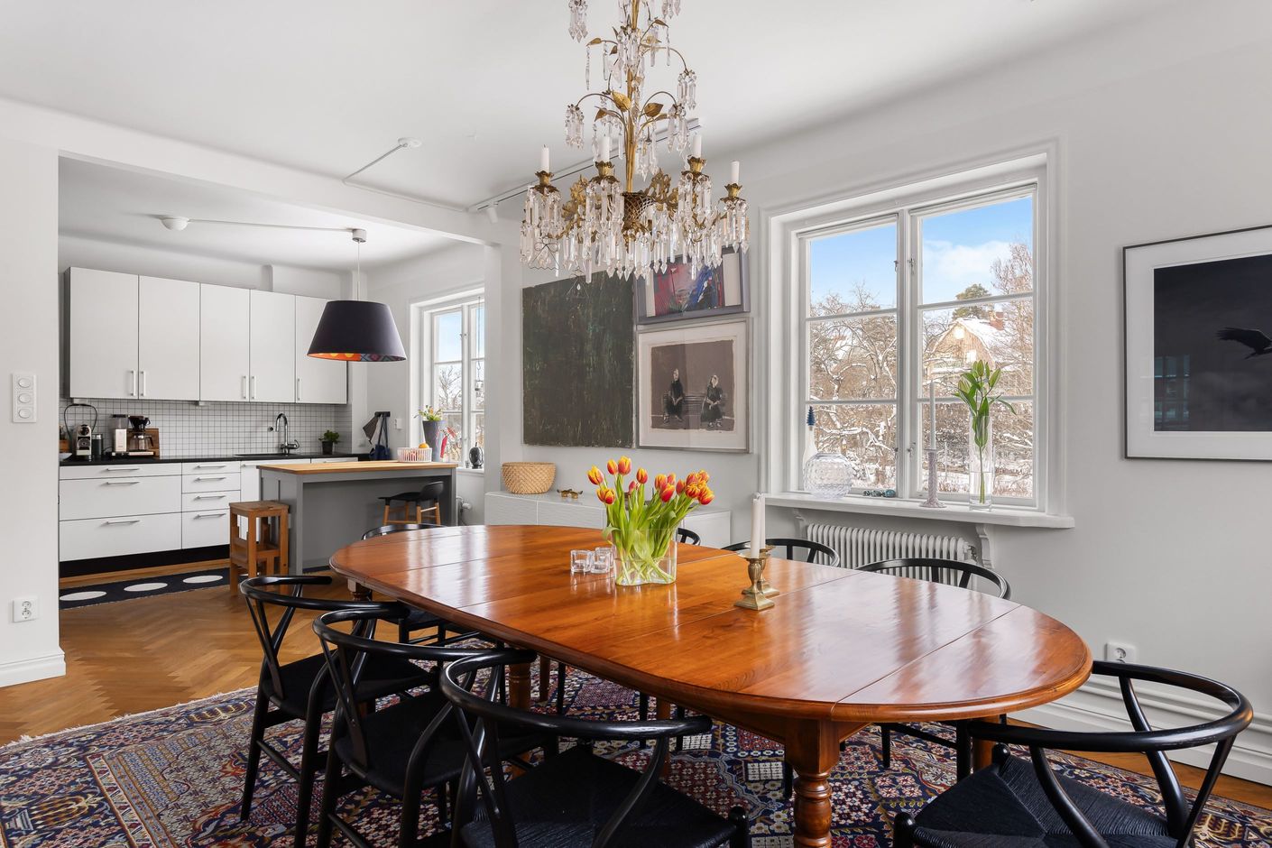 Den vackra och påkostade våningen har ett genomgående fint skick med ljus interiör och trägolv, vilket utgör en tacksam bas att möblera mot. 1920-talscharmen bevarad i de vackra spröjsade fönstren i tre väderstreck, spegeldörrar och djupa nischer m.m. Den generösa takhöjden ger luftiga ytor. Tilltalande gavelläge mot torget, kök i öppen planlösning med rymlig matsalsdel och sällskapsyta, två bra sovrum samt påkostade våtrum - badrum och två separata toaletter. Möjlighet till dubbla entréer, vilket gör boendet mer flexibelt.