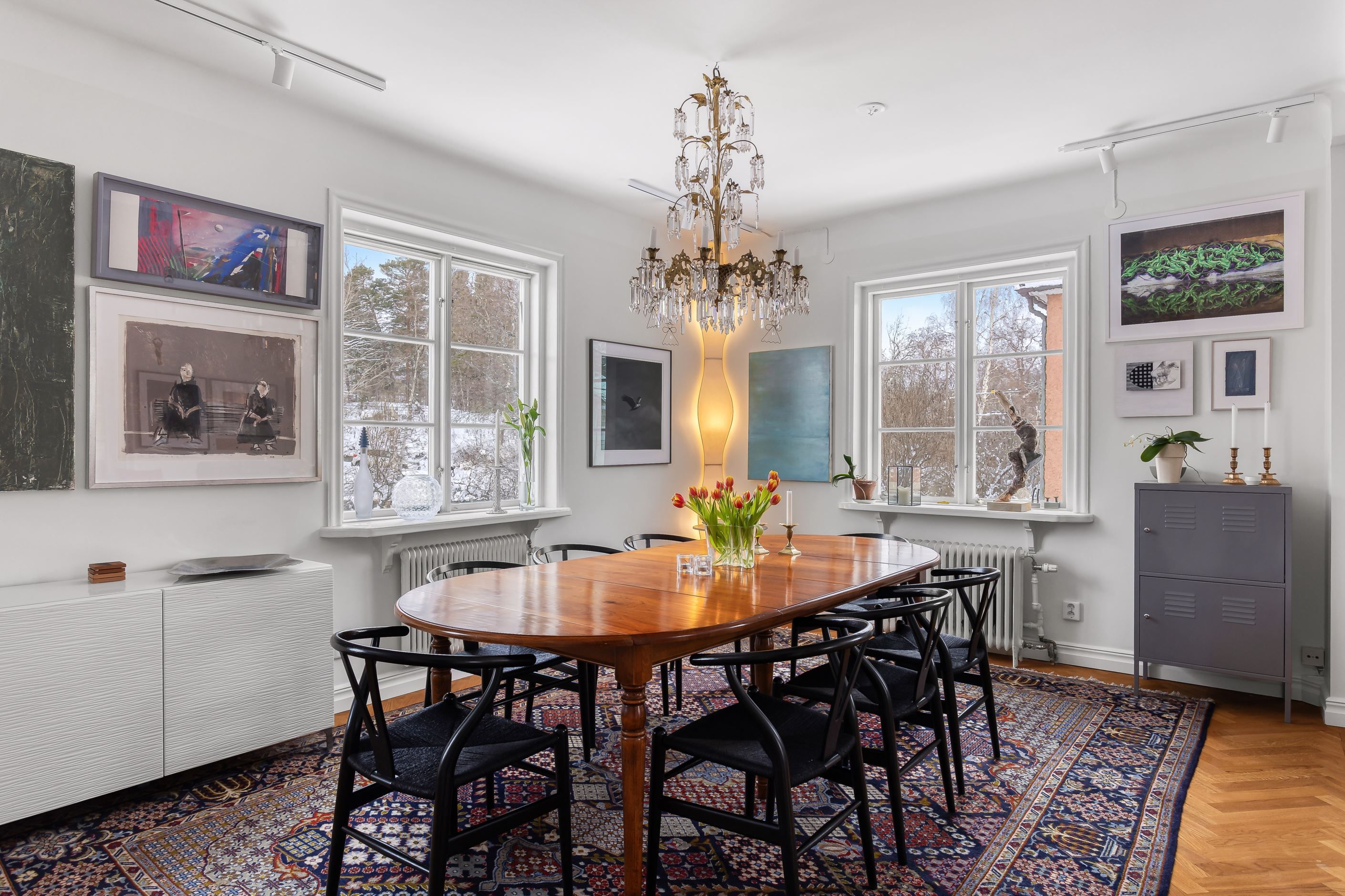 SÄLLSKAPSYTA/KÖK/MATSAL - Härlig sällskapsyta i öppen planlösning, ett bedårande vackert rum med varm atmosfär. Gavelläget ger ett fantastiskt ljus genom de spröjsade originalfönstren i två väderstreck. Fin vy ut mot föreningens vackra trädgård och vidare mot Ålstens villaidyll i fonden. Klassisk 20-talsatmosfär med härlig rymd. Här ryms både soffa och matsalsdel. Nyligen inlagt och mycket gediget ekgolv i stavlagt fiskbensmönster. Öppen planlösning mot KÖKET - Ett hemtrevligt och ljust kvalitetskök från Puustelli, med fönster ut mot den prunkande trädgården där man kan följa årstidernas färgsättningar. Stilfulla och strama vita skåpluckor med brun skåpinredning. Gott om förvaring och bra arbetsytor på svart granit. Integrerad och synnerligen tystgående diskmaskin från Bosch, spishäll, inbyggd varmluftsugn, rostfri fläkt samt rostfri kyl/frys, Micro Caso. Köksö som er ytterligare arbetsyta och förvaring samt två frukostplatser. Matplats med plats för rejält matbord som rymmer många.