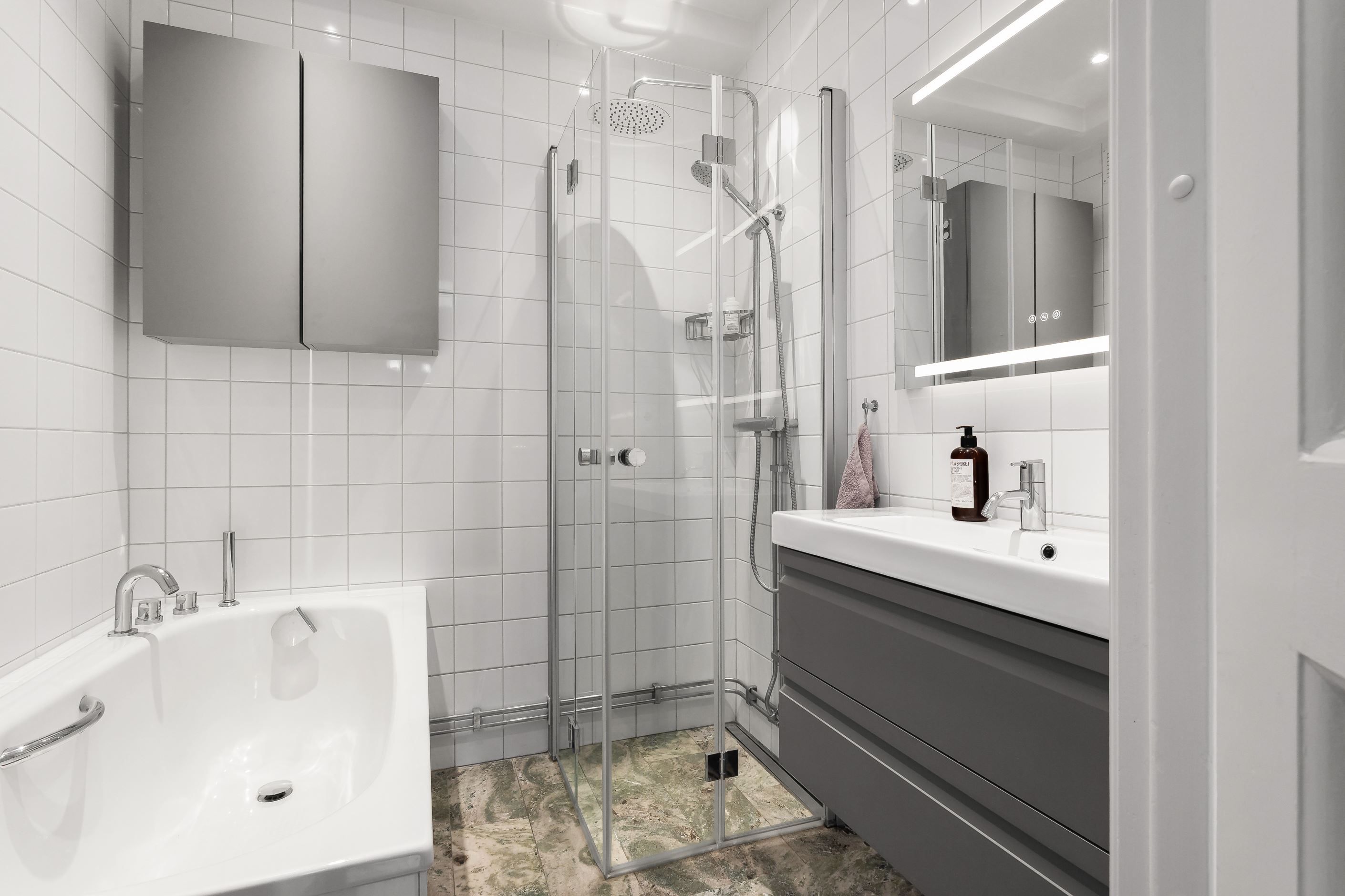 BADRUM - Badrum med kakel i vitt och stilfullt marmorgolv. Badkar, dusch samt handfat. Badrumsmöbel i peppargrått.