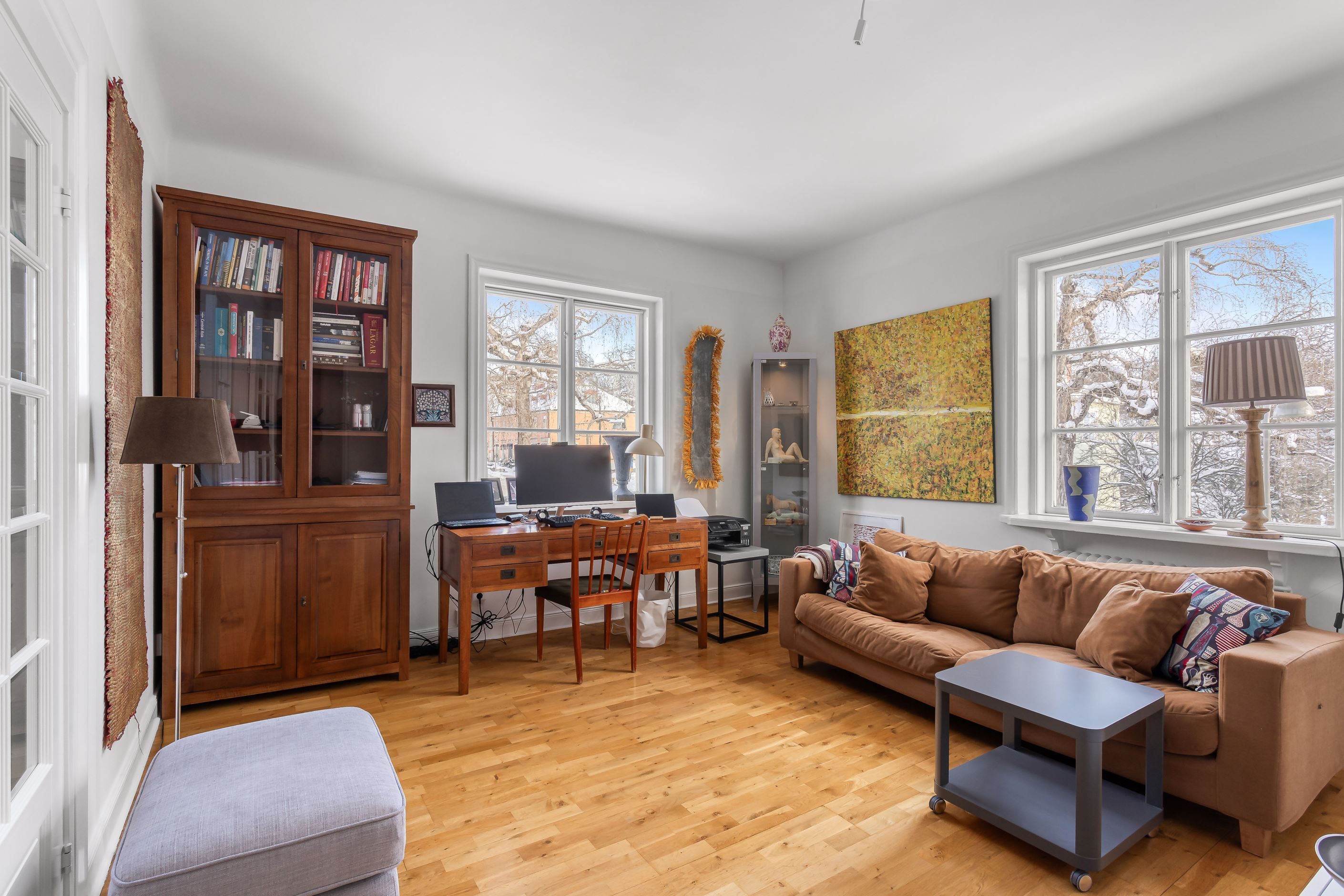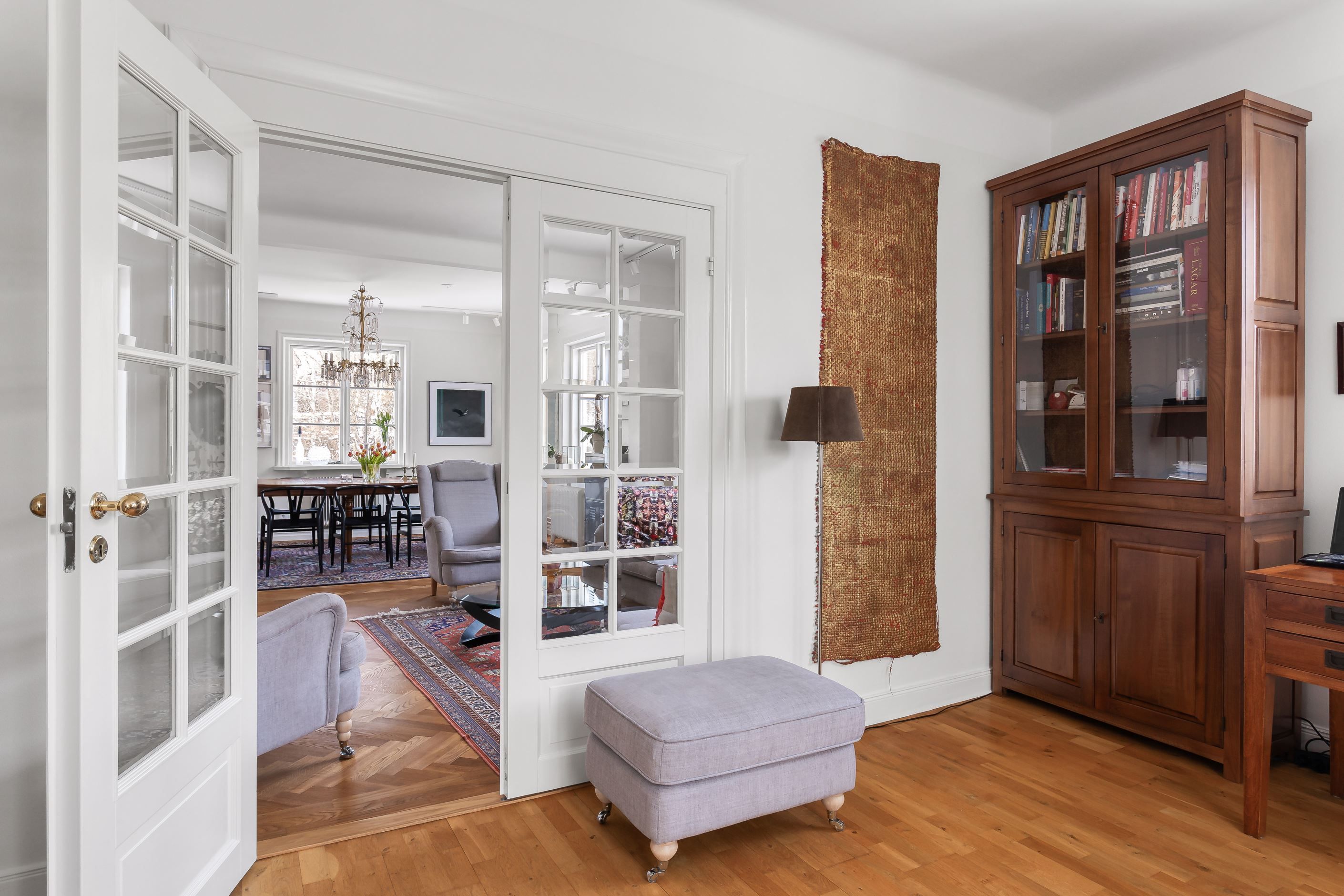 SÄLLSKAPSRUM/SOVRUM - Härligt gavelrum med flera funktioner. Glasade dubbeldörrar med spröjs delar av rummen. Dörrarna utgör ett smycke i rummen. Ekgolvet är av gemensamt i de bägge rummen. Vy mot Ålstensgatans vackra Poppelallé, samt mot Torget. För dagen ett sällskapsrum som lika gärna kan nyttjas som sovrum om behov finns. Garderobsvägg ger bra förvaringstillfälle.