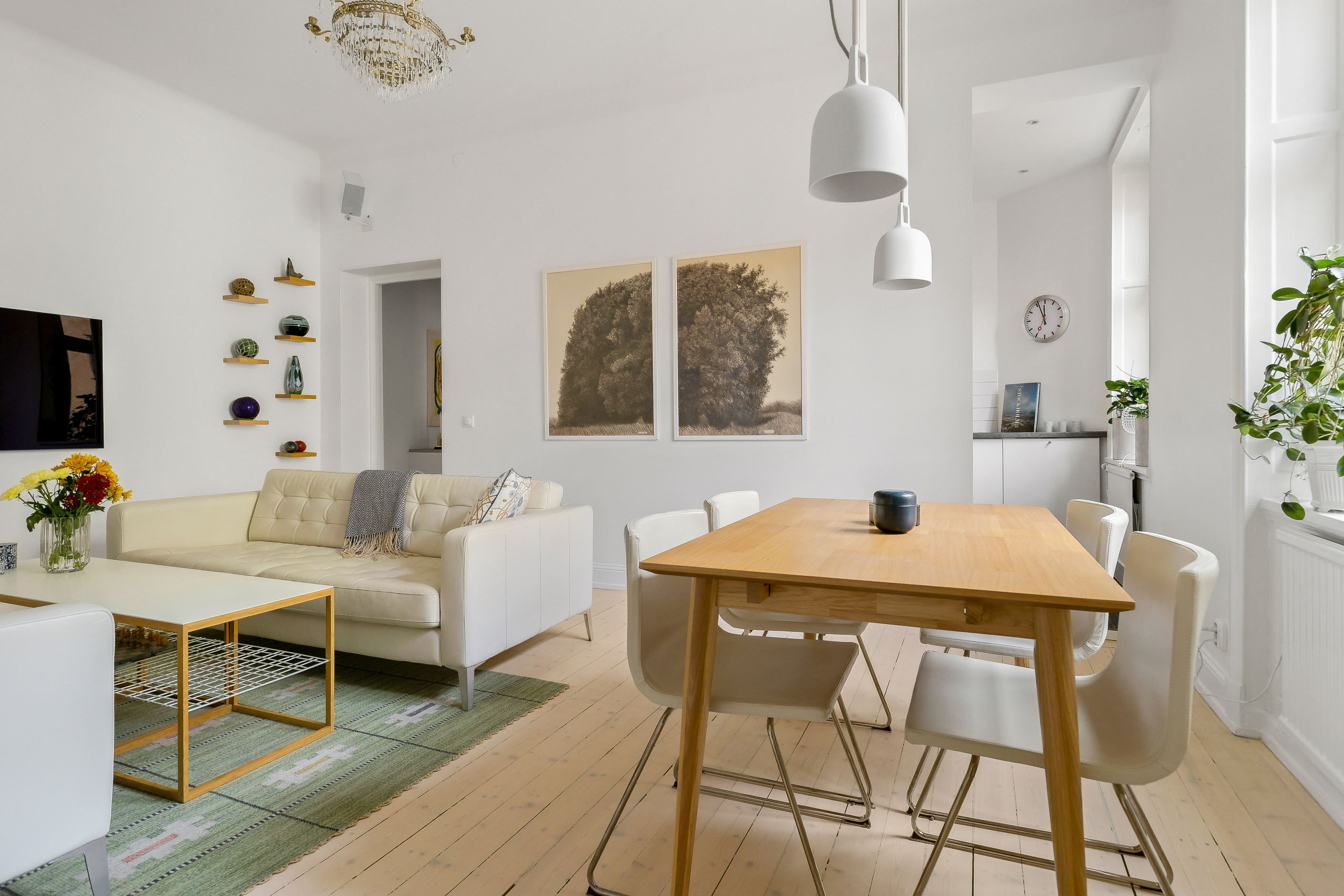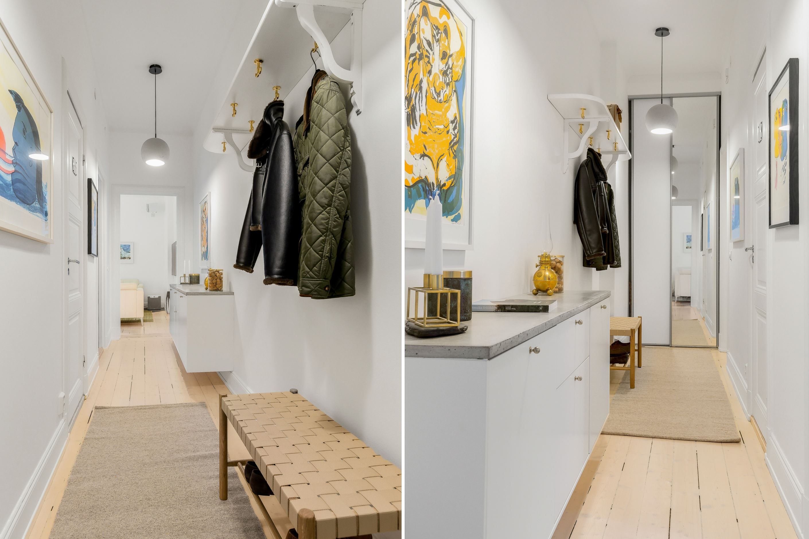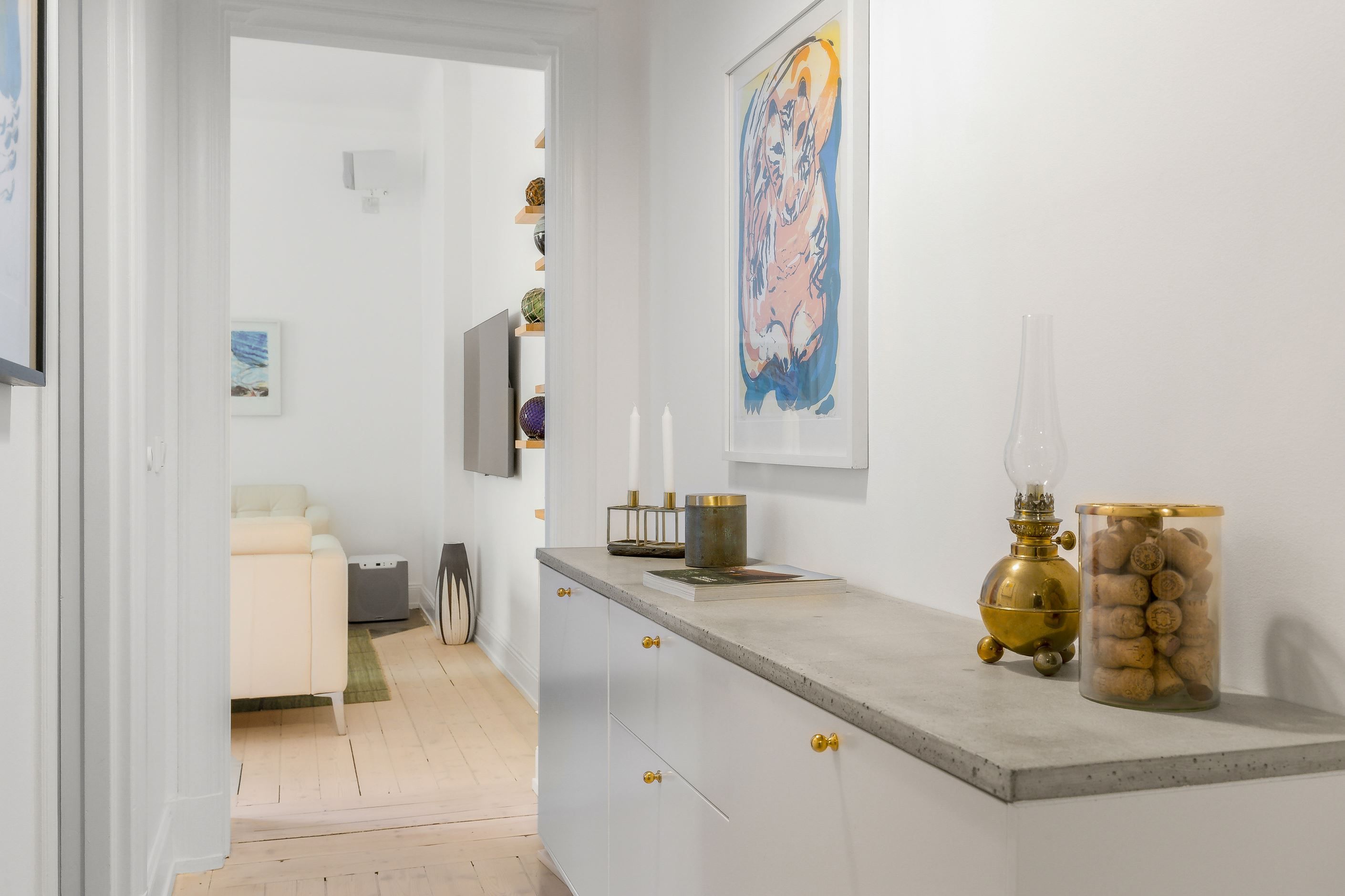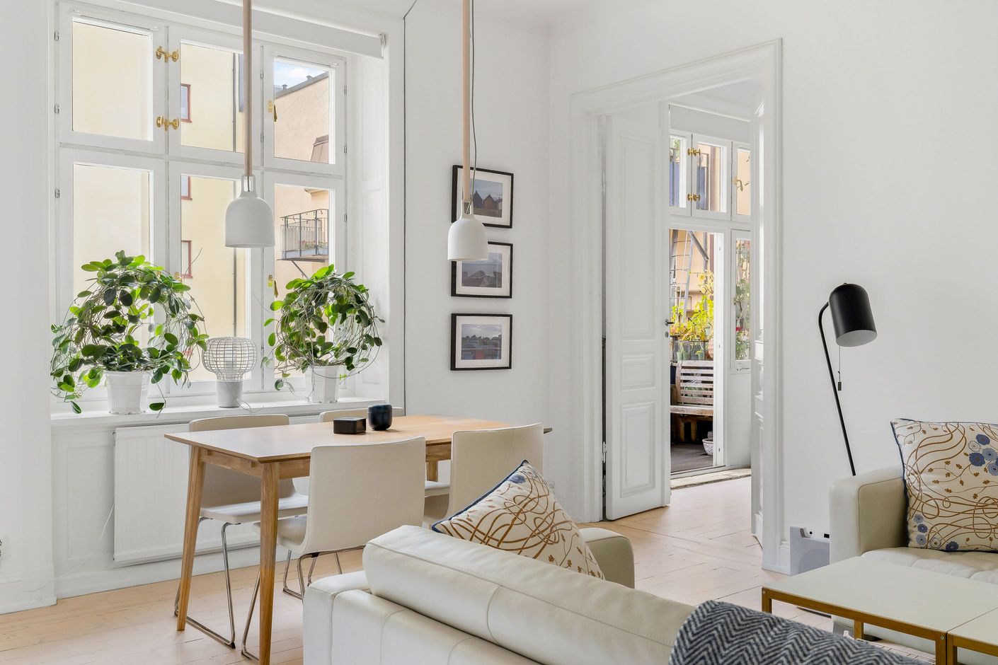 Välkommen till denna stilfulla tvåa på attraktiva Kungsholmen – ett hem där modern design möter tidlös charm. Här bor du i en ljus och genomtänkt lägenhet med generös takhöjd, stora fönsterpartier och en planlösning som både är social och funktionell. När du kliver in möts du av en inbjudande hall med ljuspigmenterade furugolv som löper vidare genom bostaden, målade väggar i ljus nyans och en smakfull fondvägg som skapar en välkomnande känsla.