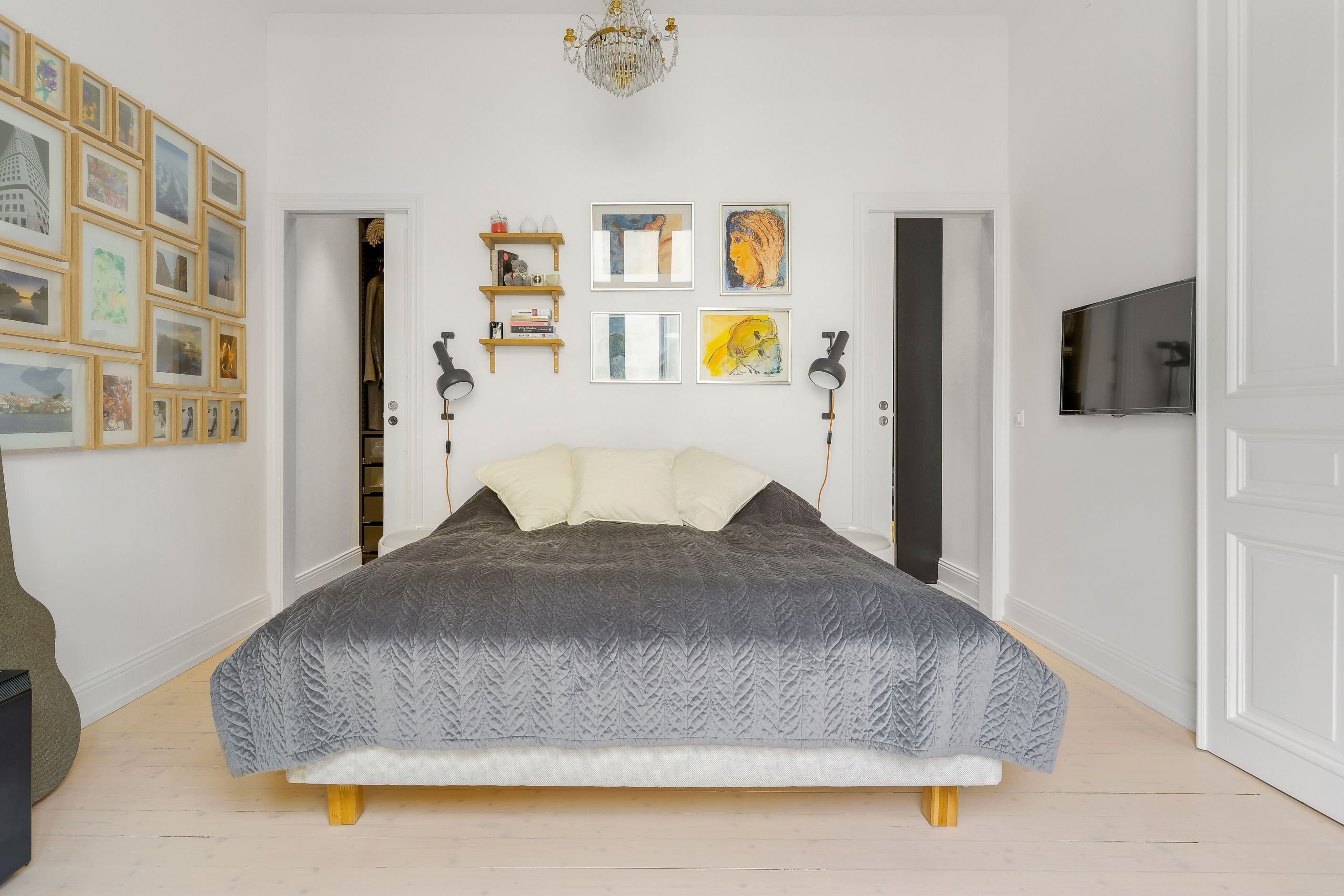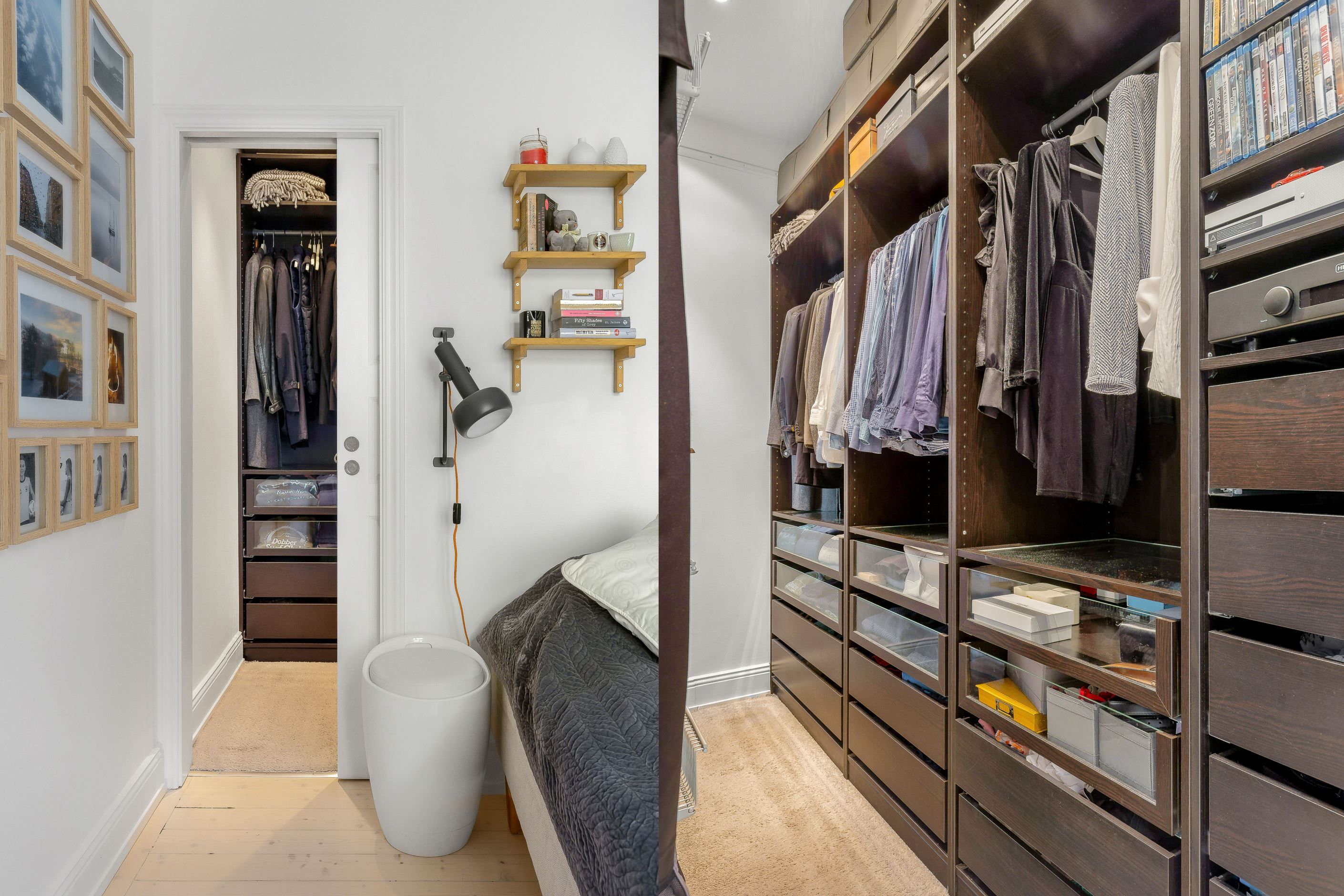 Från vardagsrummet leder vackra pardörrar med skjutfunktion in till sovrummet – ett rum som verkligen utmärker sig. Här finns både utgång till balkongen och en exklusiv walk-in closet i genomgångsmodell, med ingång från båda kortsidorna. Denna lösning erbjuder gott om förvaring och en känsla av lyx som är svårslagen i en tvåa. Rummet är dessutom rofyllt beläget mot föreningens grönskande innergård, vilket ger en harmonisk atmosfär.