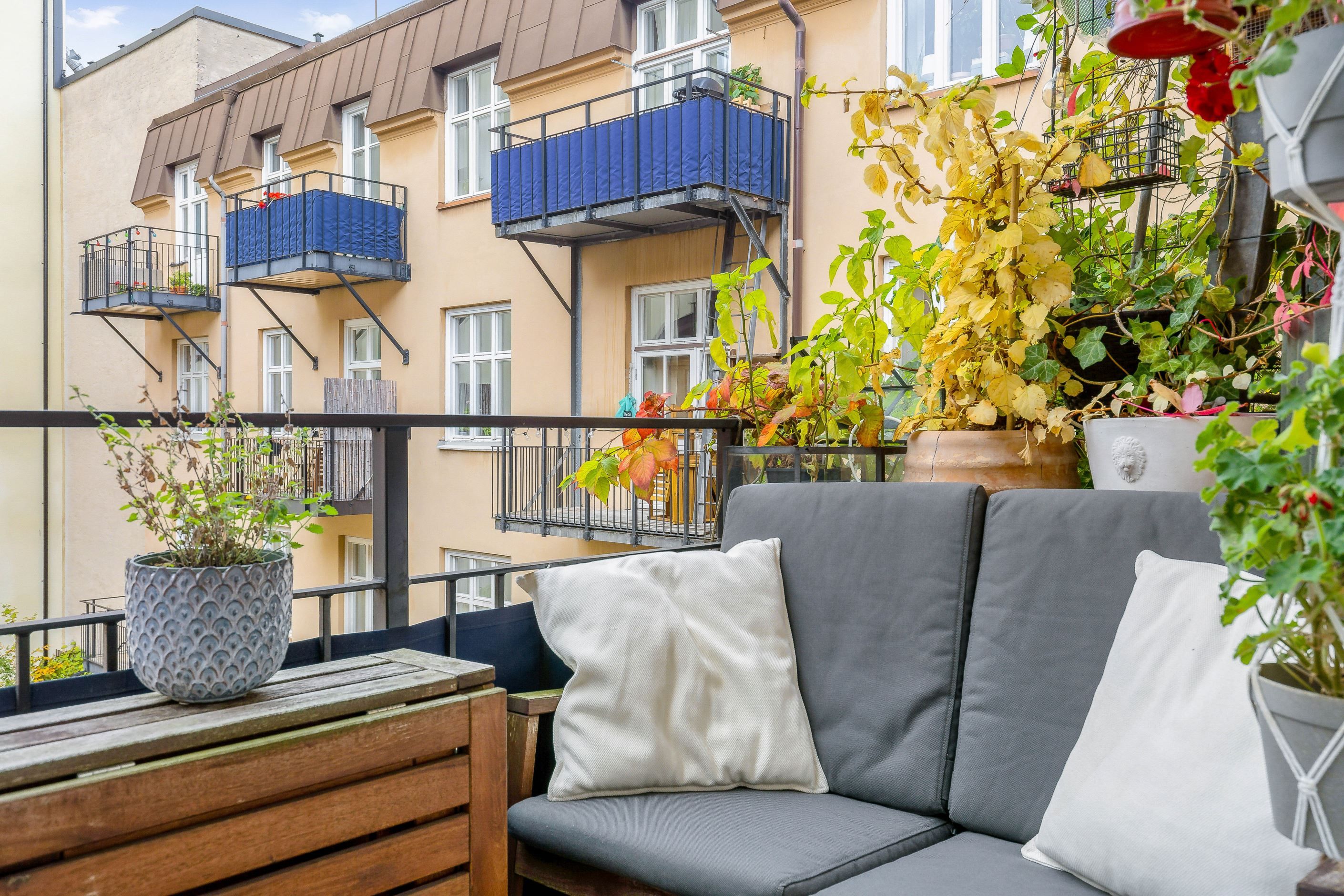 Balkongen, i härligt västläge, är en självklar förlängning av bostaden under sommarhalvåret. Här kan man njuta av solen från eftermiddag till kväll med en rogivande utsikt över innergården. Balkongen är byggd i järnsmide med marinblått insyns- och vindskydd samt trallgolv – en perfekt plats för både avkoppling och sociala stunder.