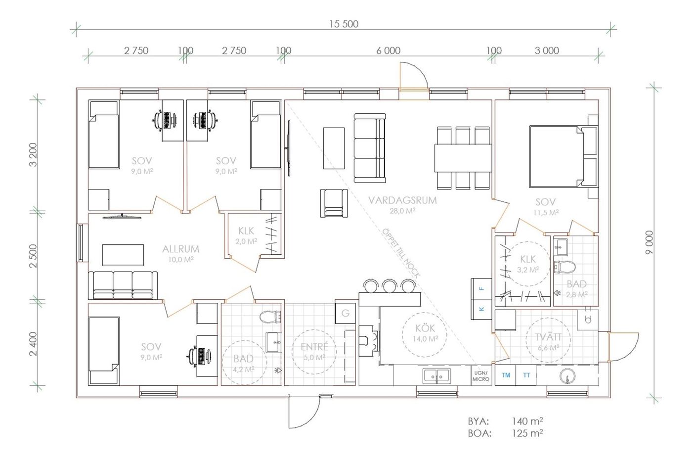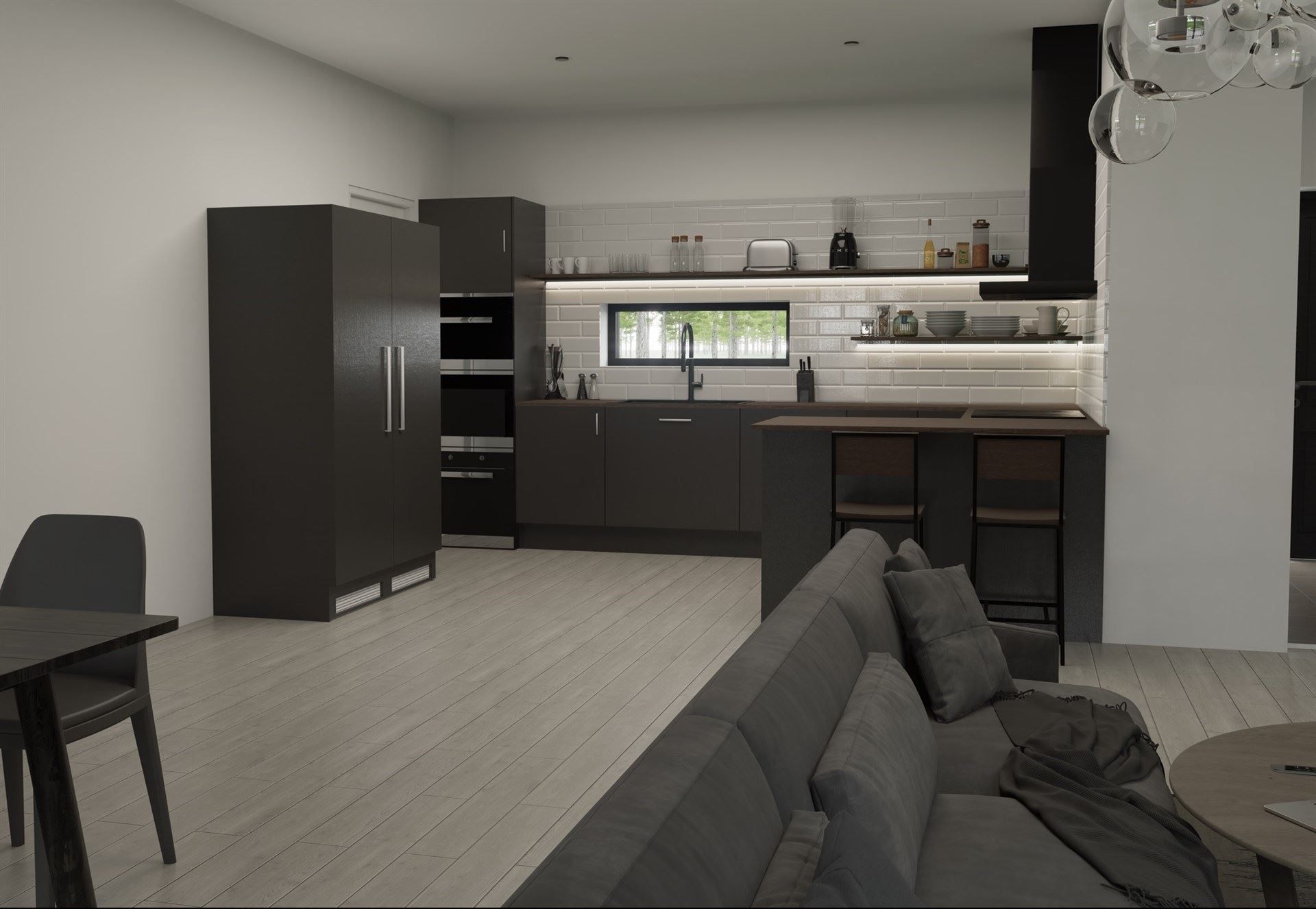 Invändigt möts du av genomtänkta materialval såsom kök från HTH, smakfull kompositbänkskiva och ett stilrent badrum med 60x60 cm plattor – detaljer som ger en modern och exklusiv känsla.