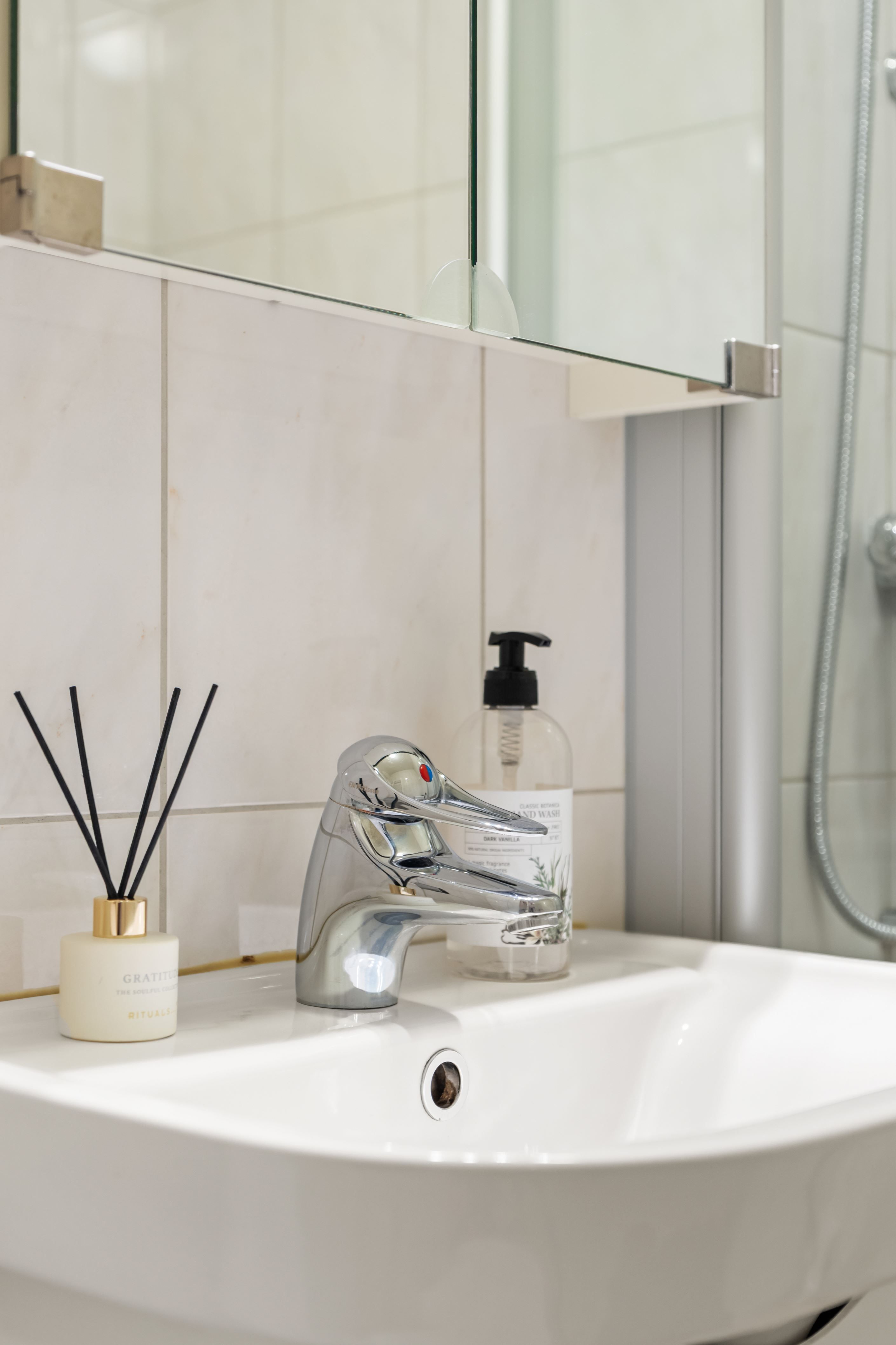 Badrummet är smakfullt inrett med klinkergolv och behaglig golvvärme – en lyxig detalj som höjer komforten året runt.