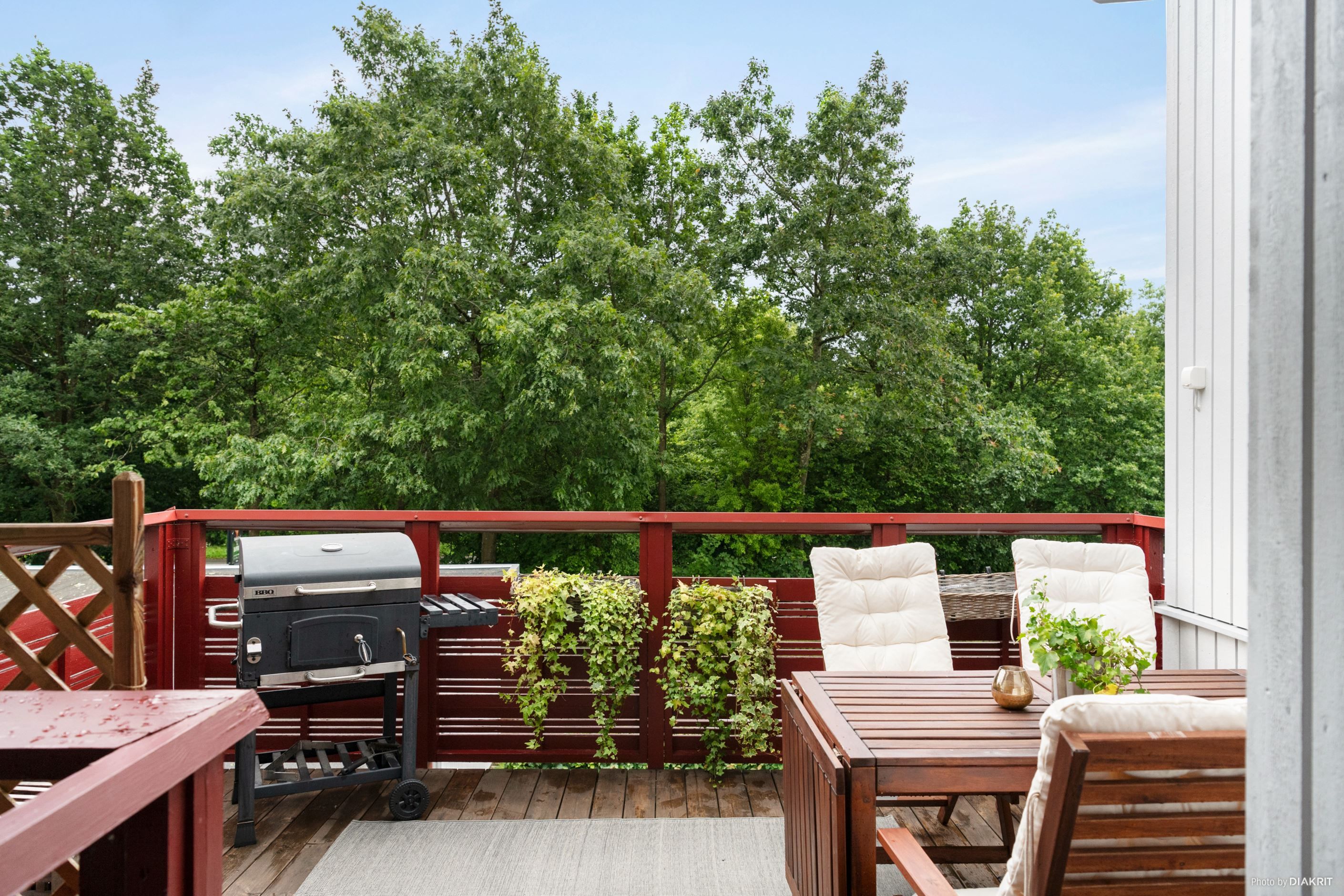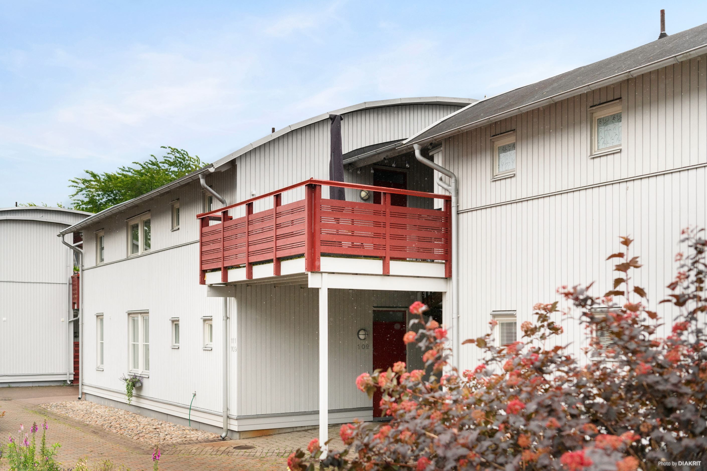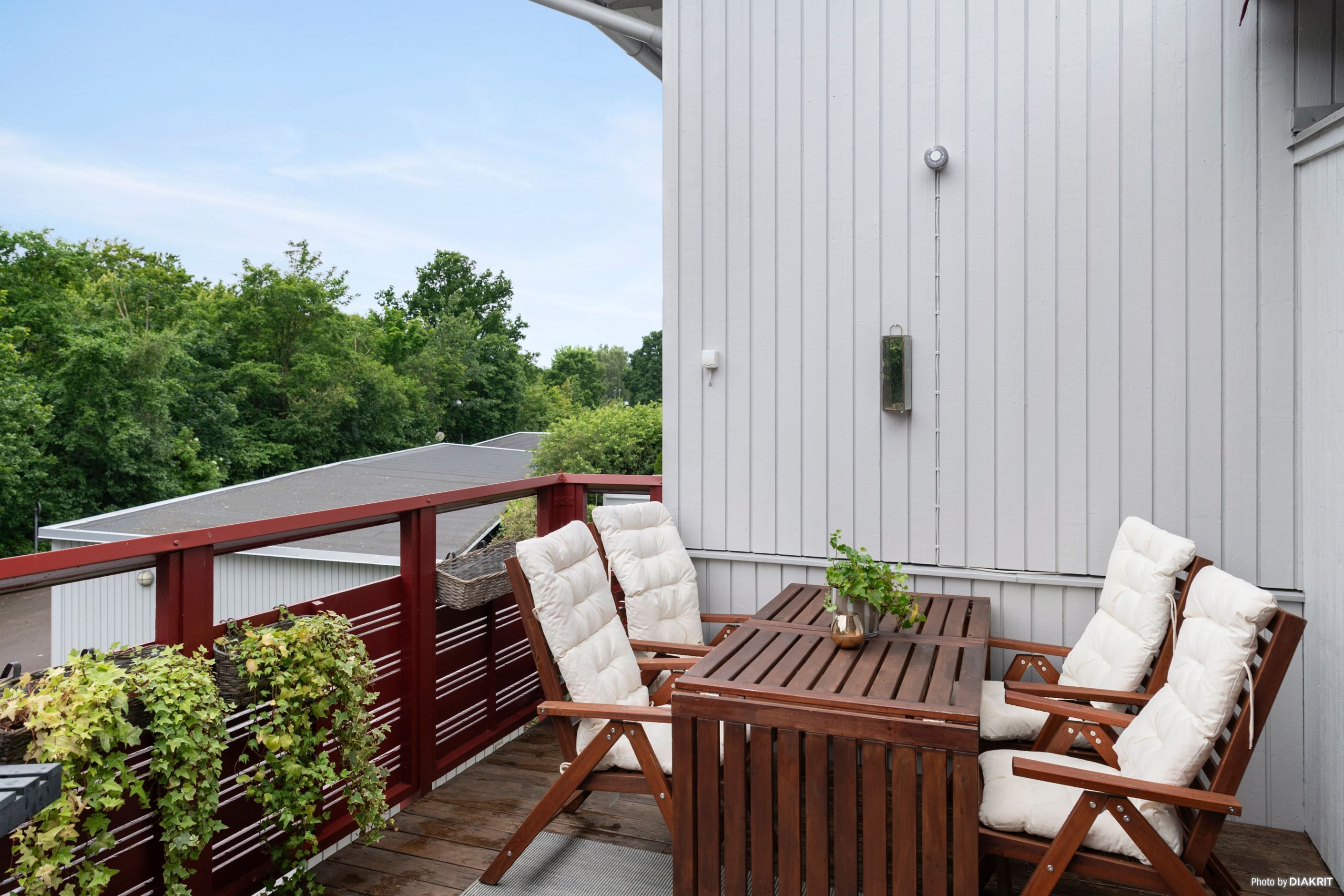 Utanför entrén finns en privat terrass, en perfekt plats för morgonkaffet, odlingar i kruka eller kvällar med familj och vänner. Terrassen förstärker lägenhetens känsla av rymd och erbjuder ett rofyllt utomhusutrymme.