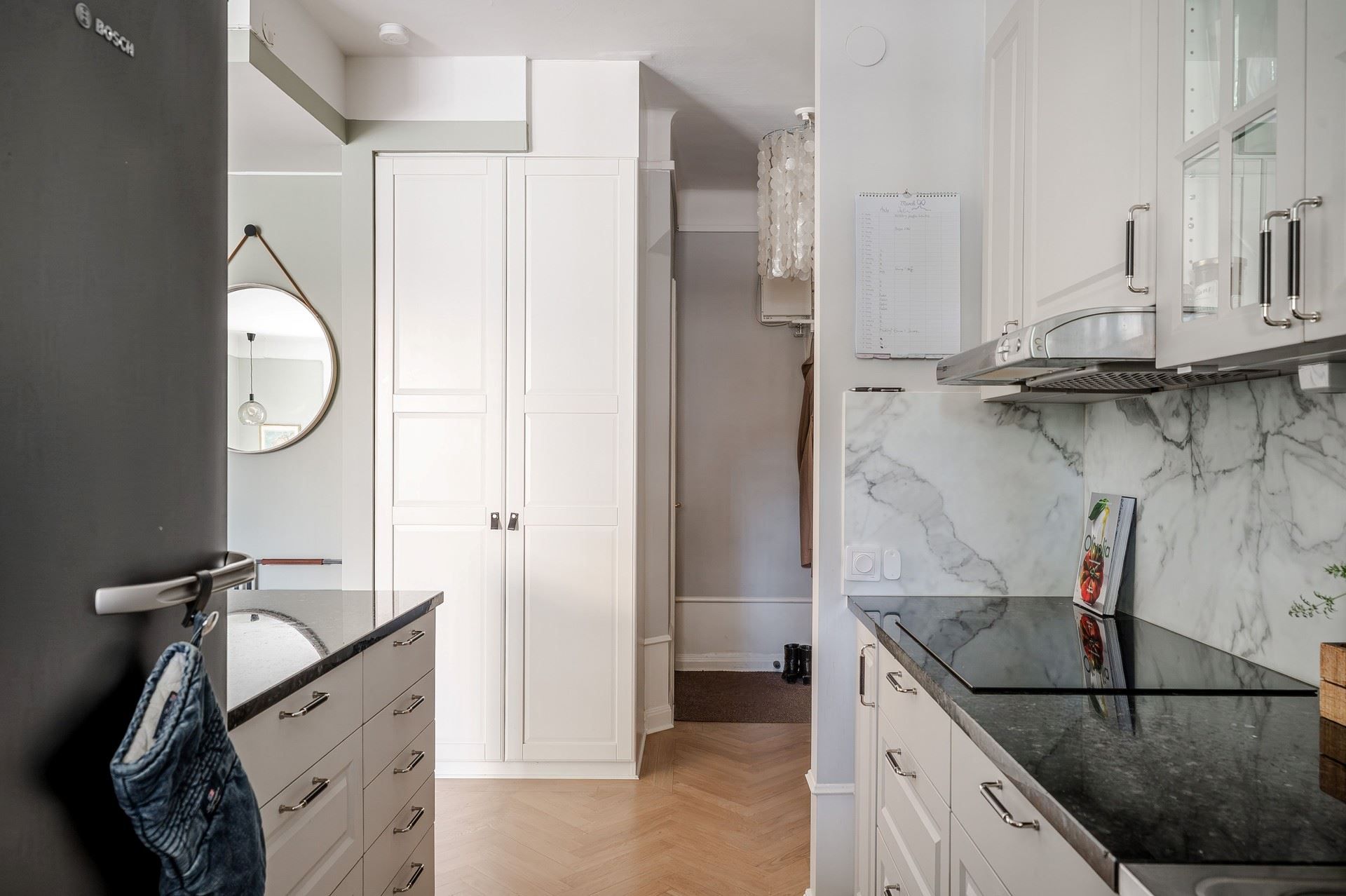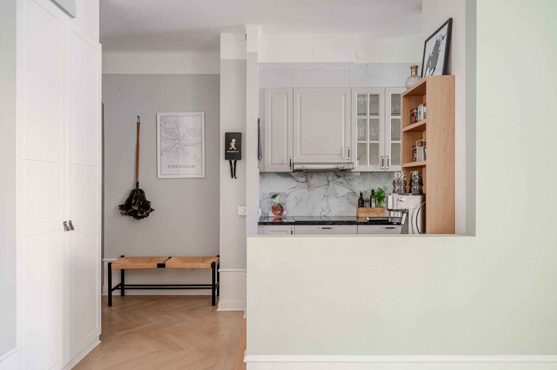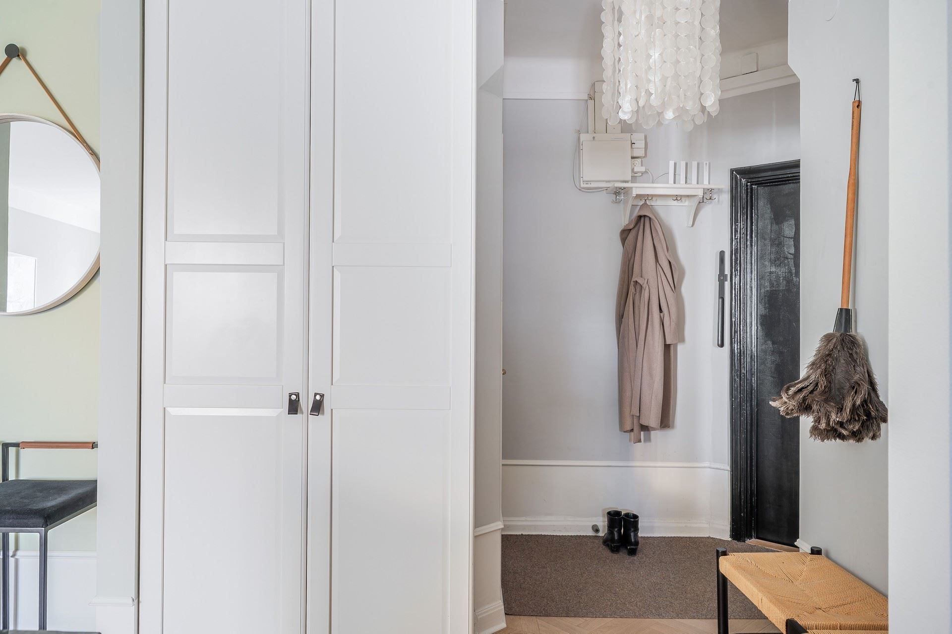 Du kliver in i hallen där du enkelt når bostadens samtliga rum. Här finns både upphängningsmöjligheter samt en rymlig garderob för praktisk förvaring av ytterkläder.
