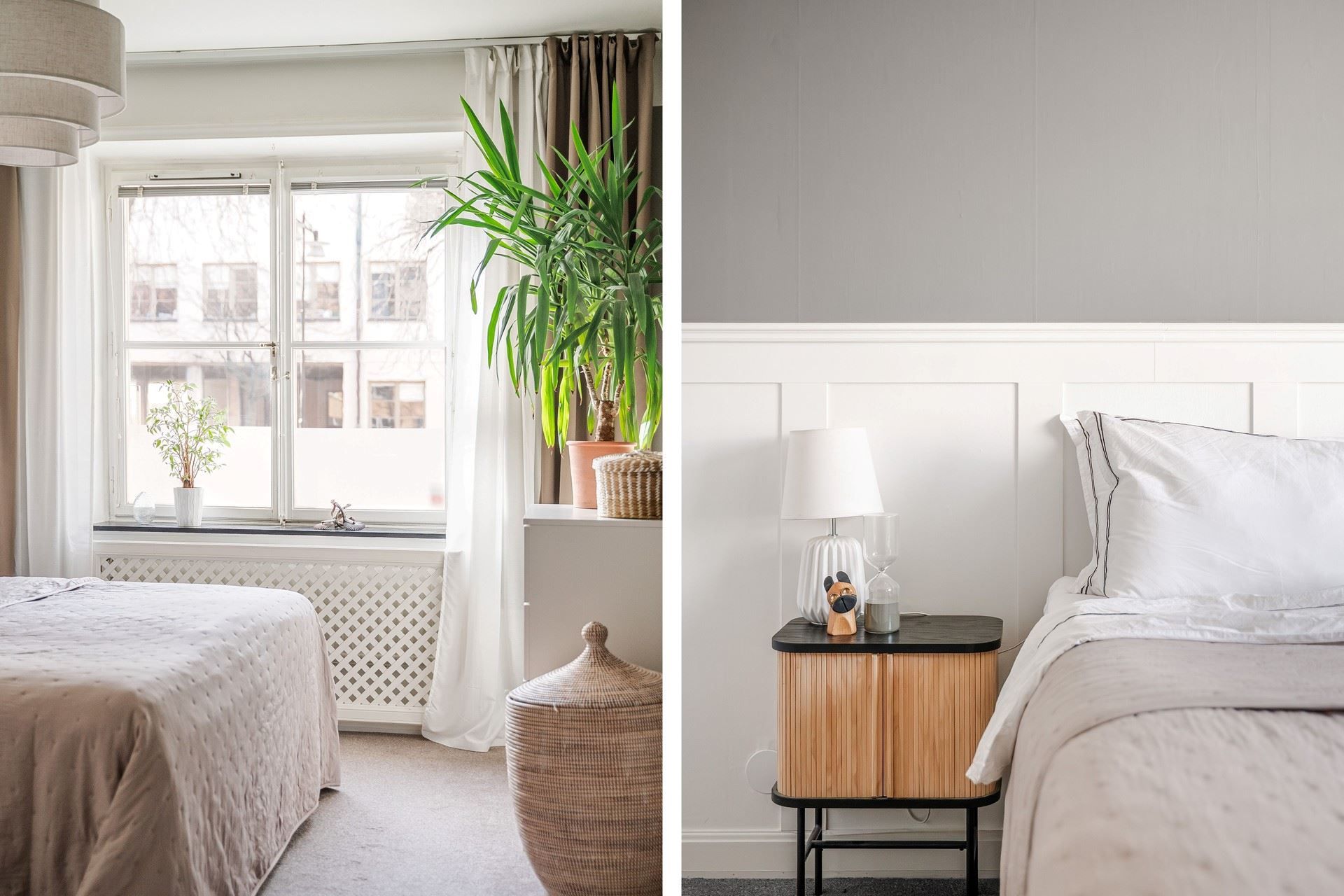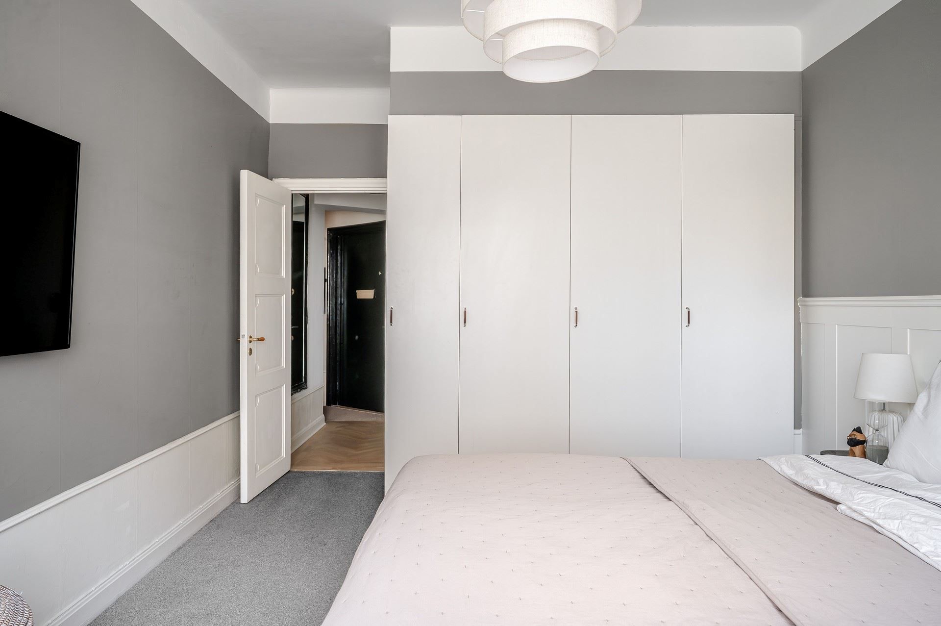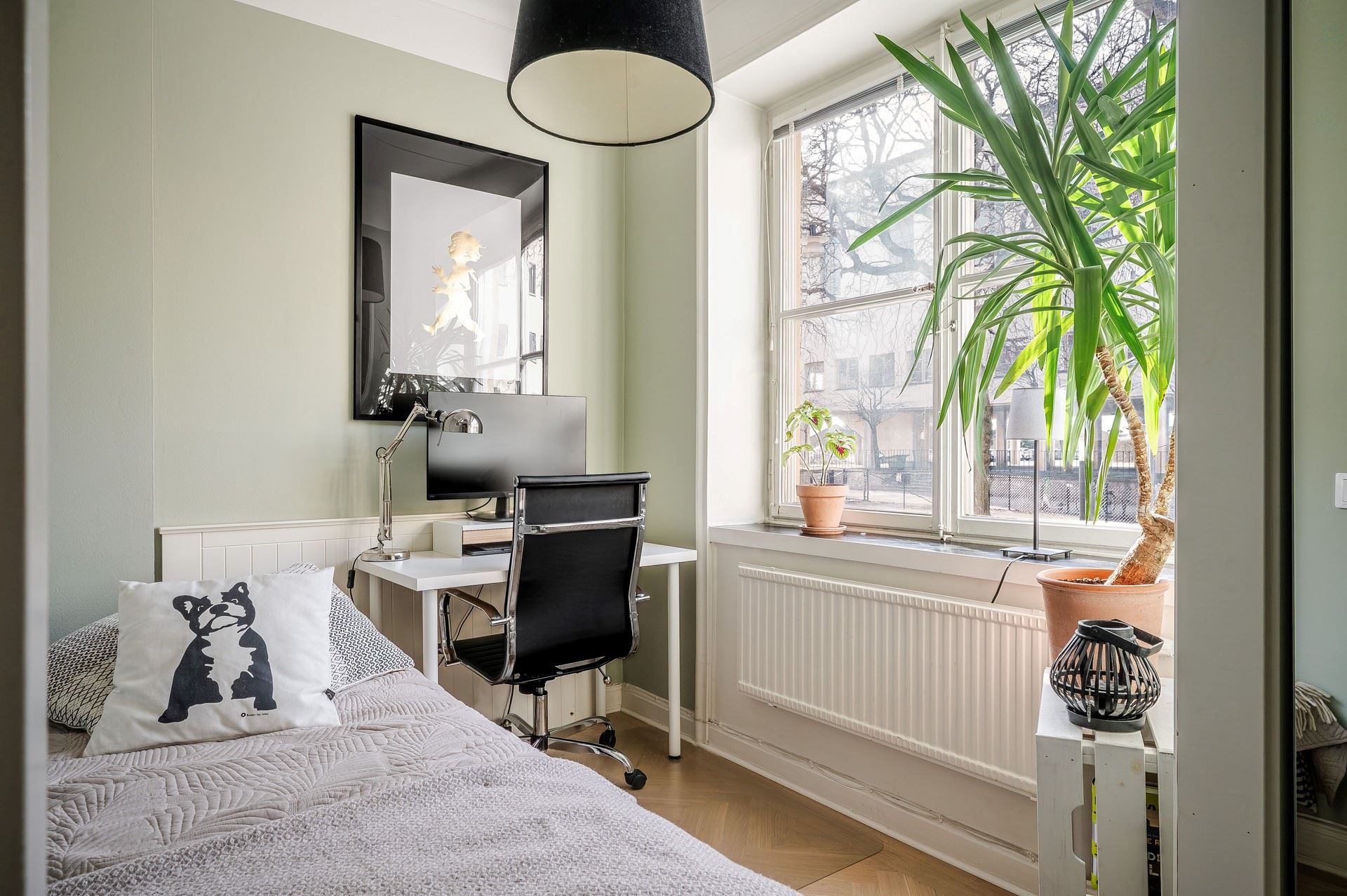 Från vardagsrummet når du det mindre sovrummet som är smart planerat. Idag används rummet som både gästrum och kontor men har tidigare fungerat utmärkt som barnrum. Här finns flexibilitet att anpassa efter dina behov.