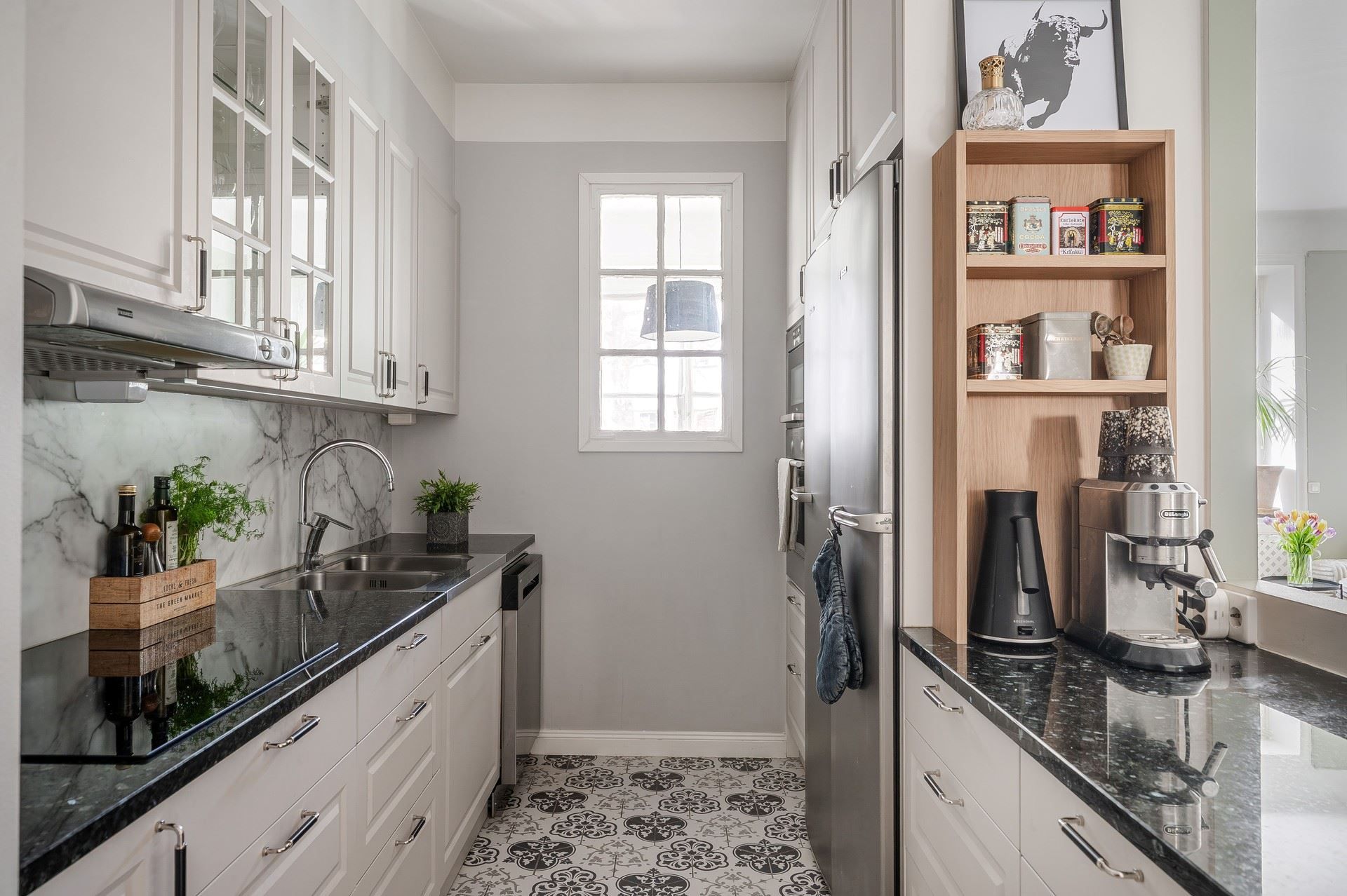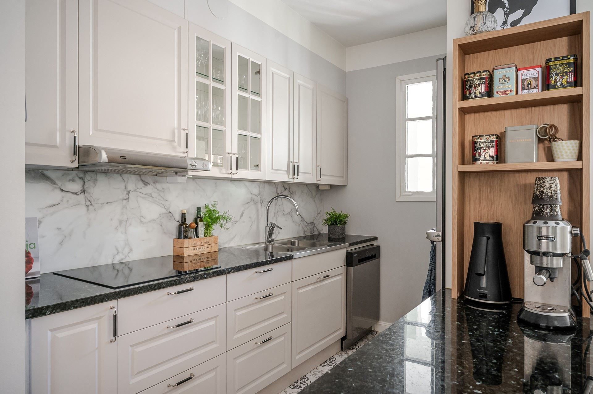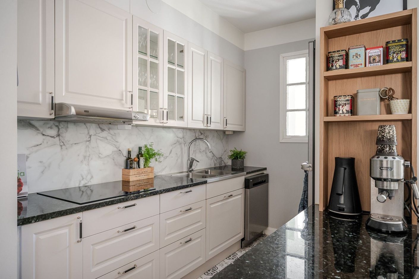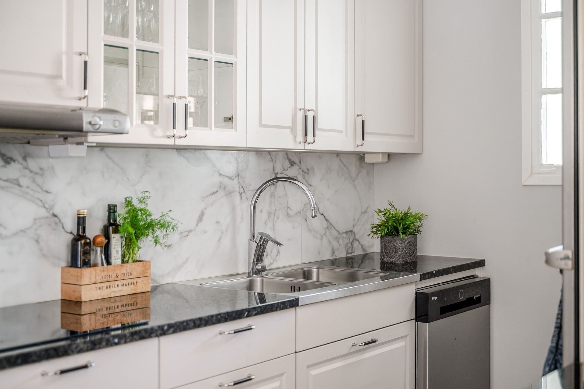 Köket erbjuder god förvaring bakom grå profilerade luckor och en elegant bänkskiva i sten. Den maskinella utrustningen består av ugn, häll, mikro, diskho och diskmaskin.