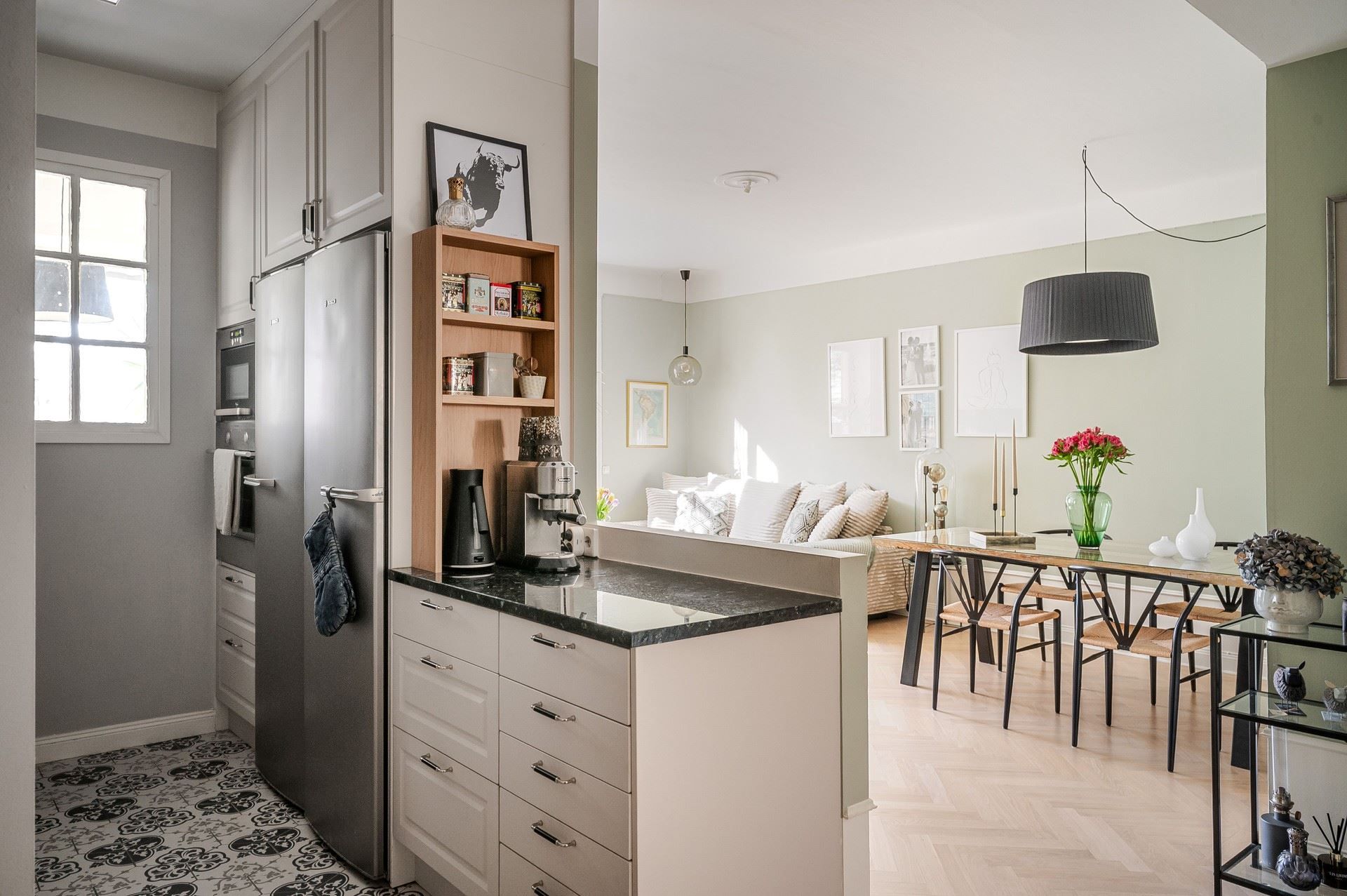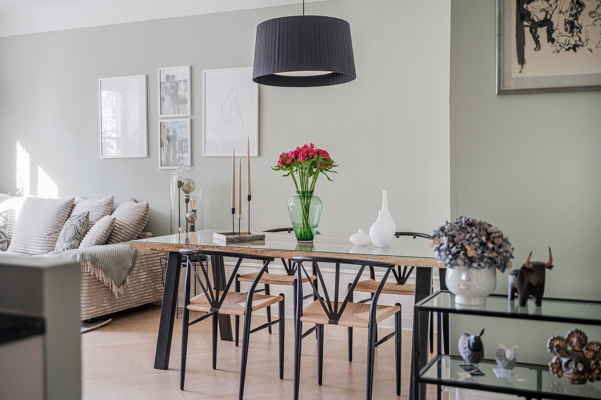 Det stora vardagsrummet ligger i öppen planlösning med köket och är minst lika stilfullt som resten av bostaden. Här finns gott om plats för både ett stort matbord och en generös soffgrupp.