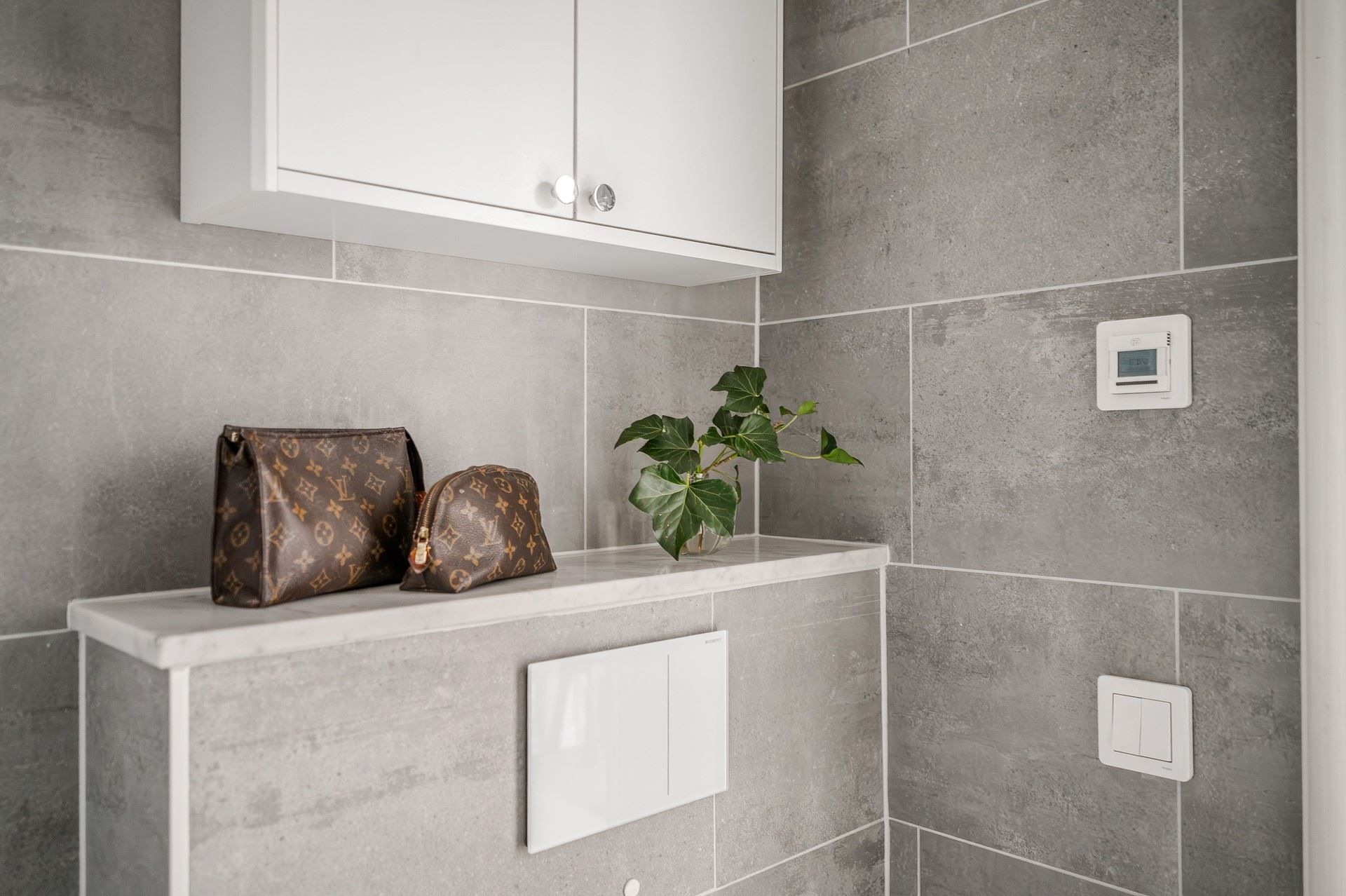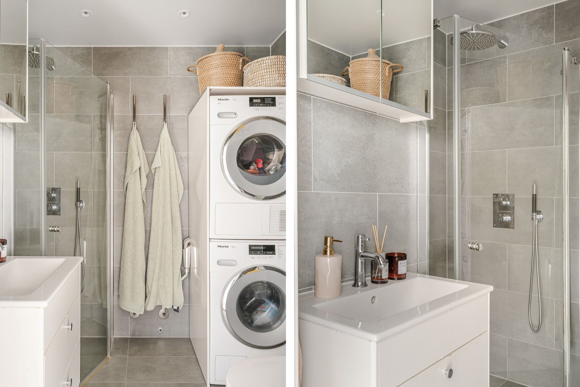 Från hallen nås bostadens stilrena badrum. Här finns allt du kan önska. Helkaklade ytor, en rymlig dusch med glasväggar, handdukstork, golvvärme samt både tvättmaskin och torktumlare.