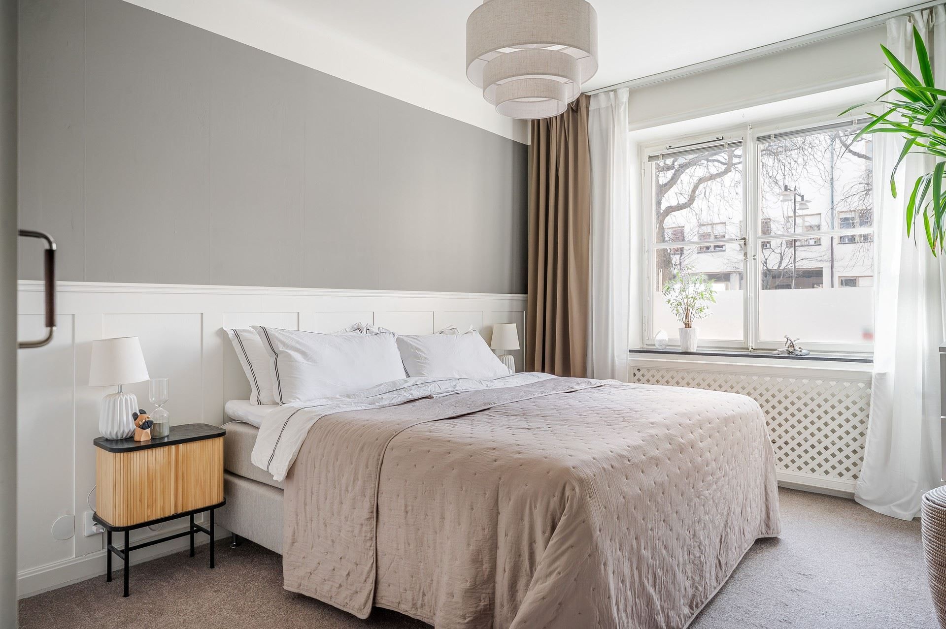 Intill ligger det större sovrummet med plats för dubbelsäng, sängbord och ytterligare möbler efter behov.