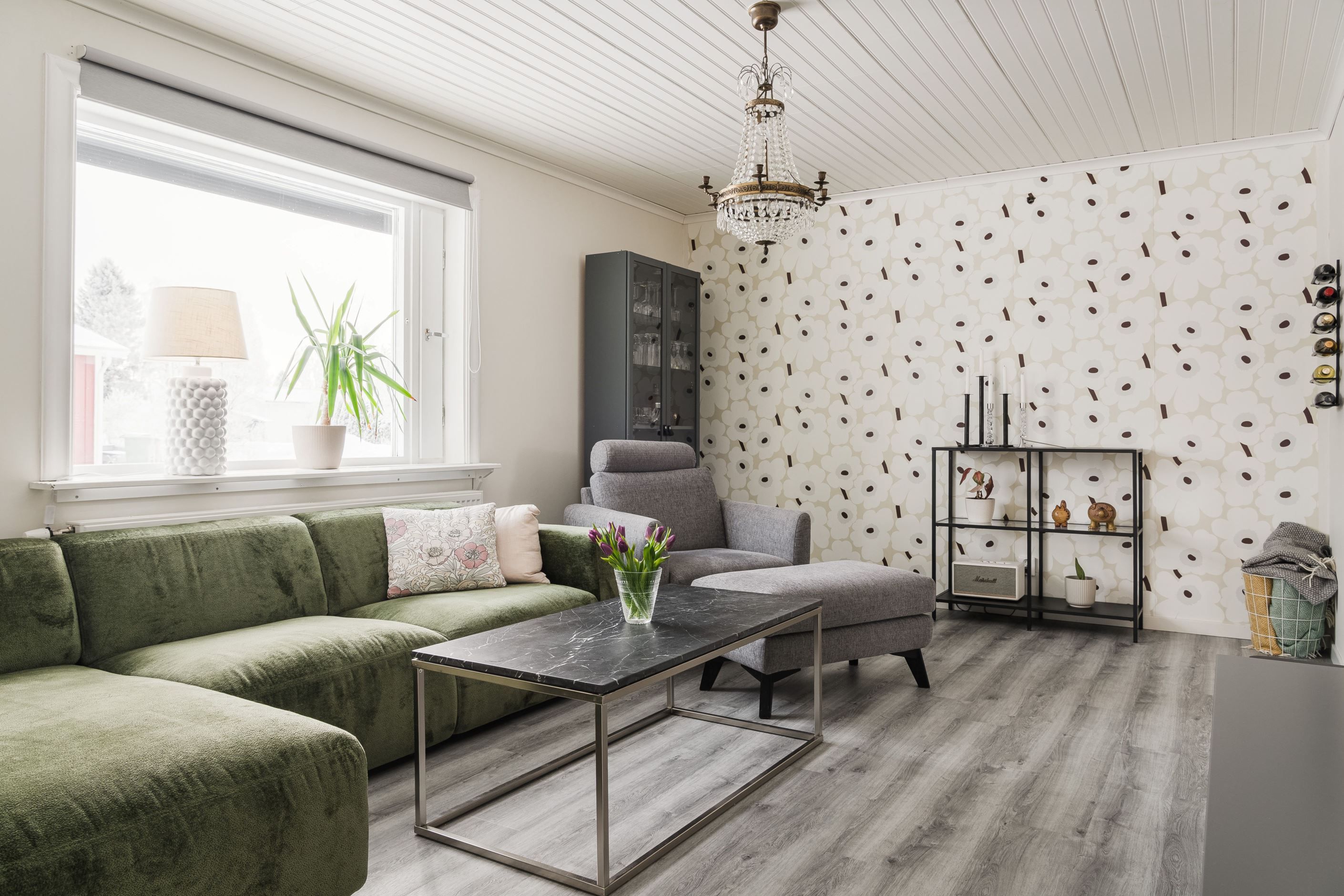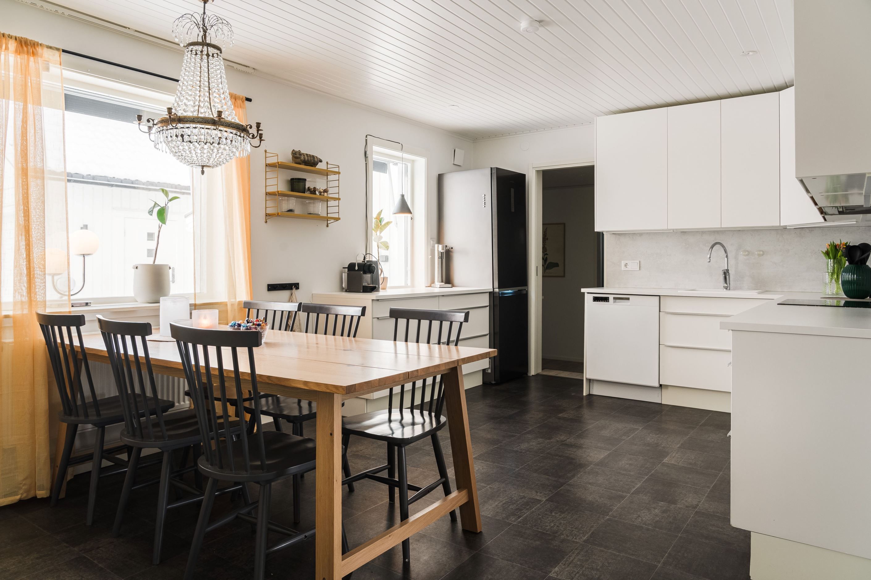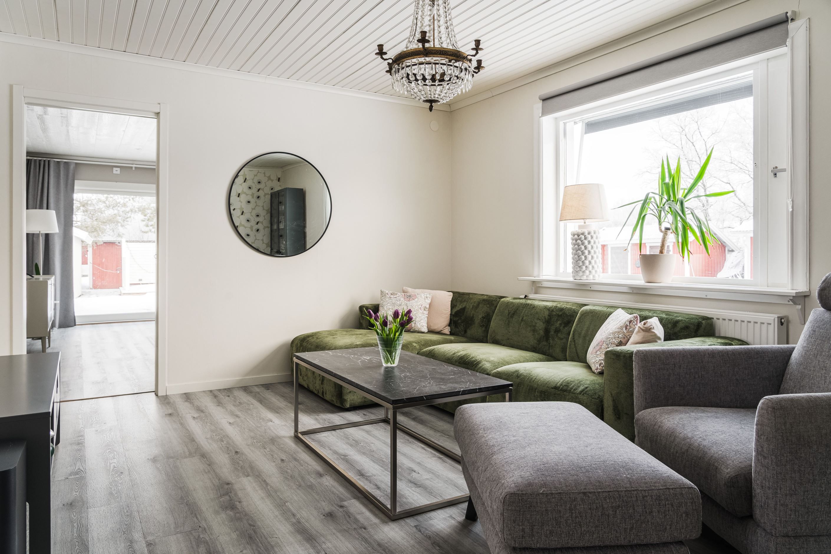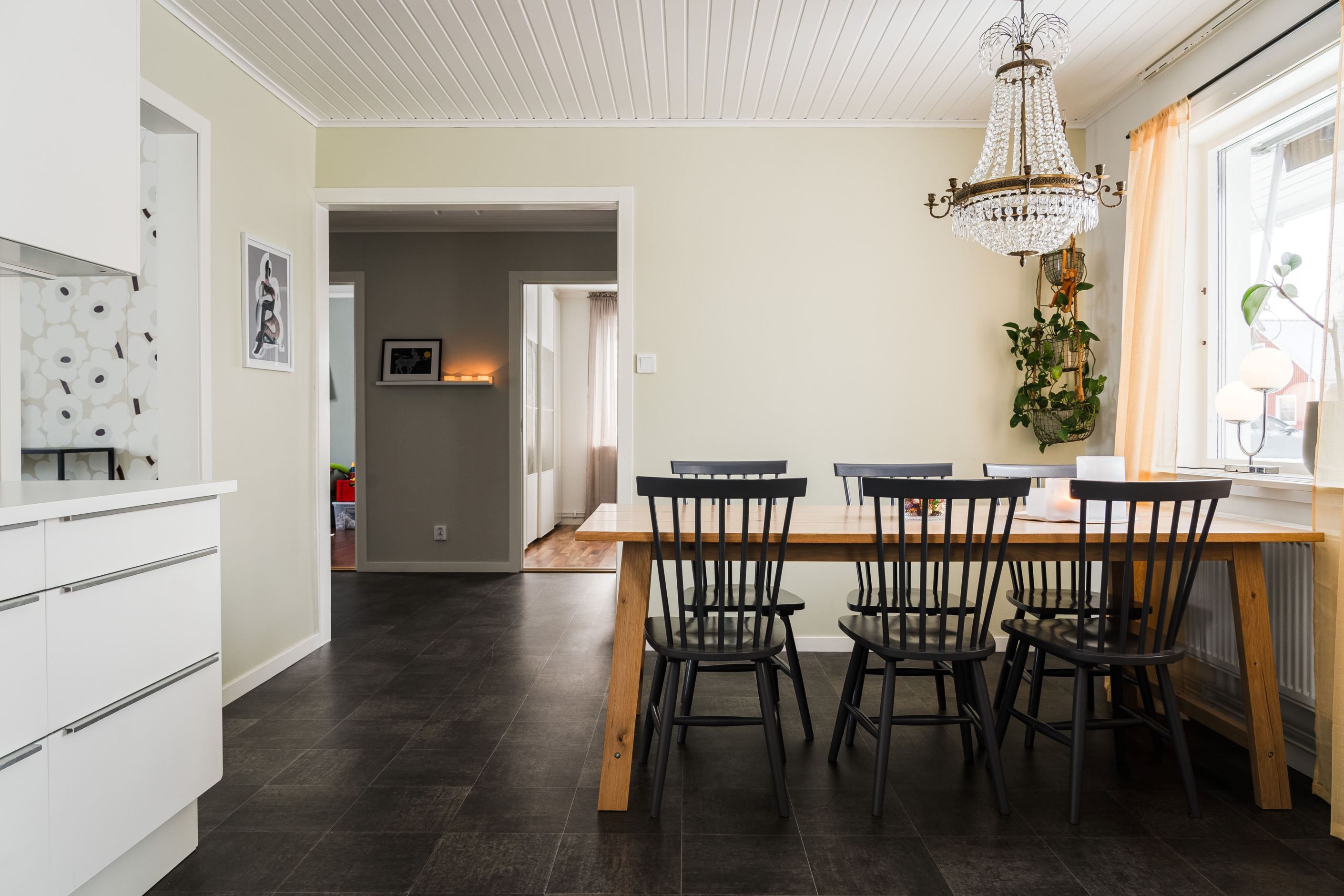 Trevlig planlösning med hall, gästtoalett, rymligt kök, kontor, vardagsrum och tre sovrum, varav ett större rum som även passar utmärkt som matrum. Här finns gott om plats att bjuda in familj och vänner till trevliga middagar. De stora skjutdörrarna i glas ger ett generöst ljusinsläpp och skapar en naturlig förlängning av rummet ut mot altanen på baksidan.