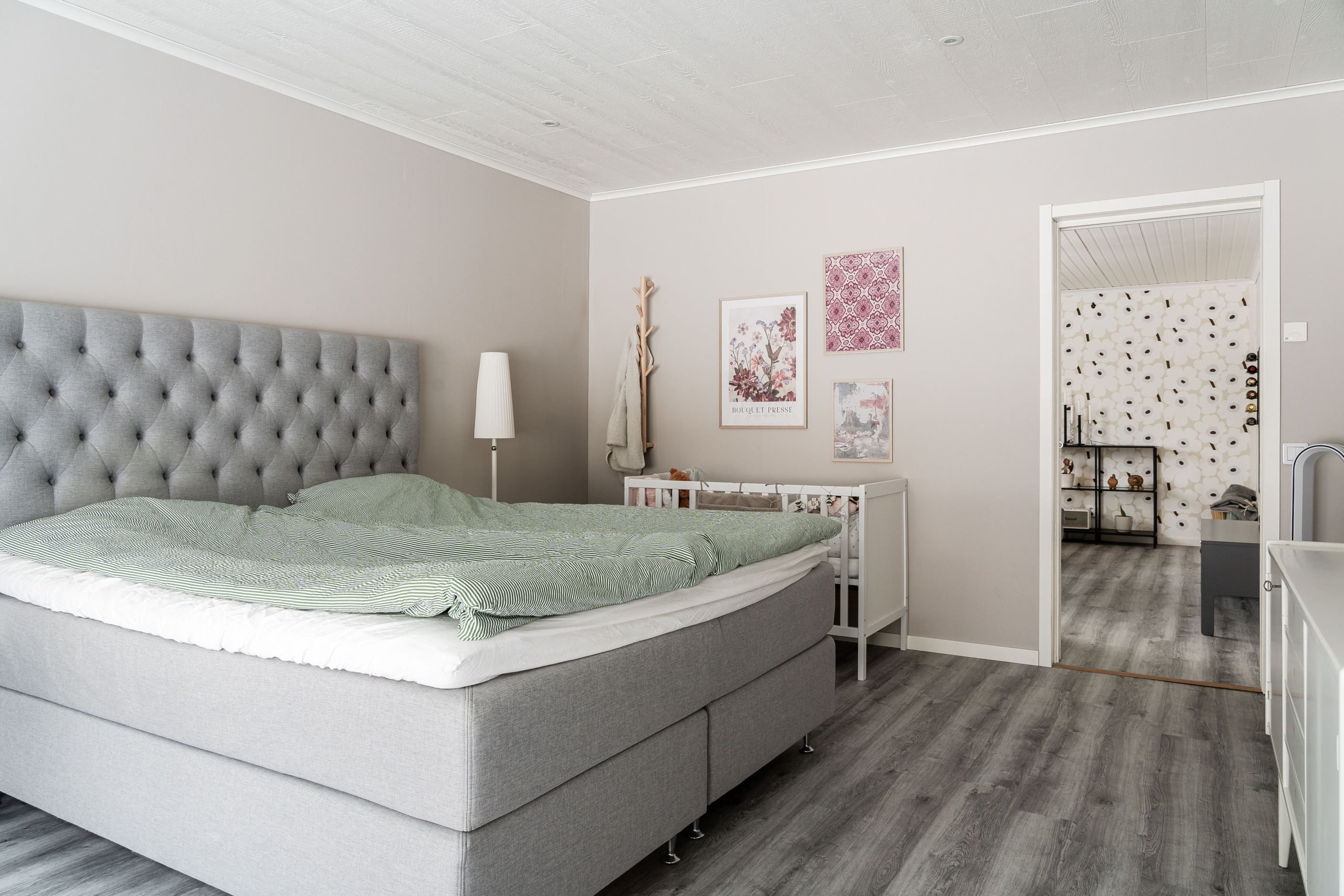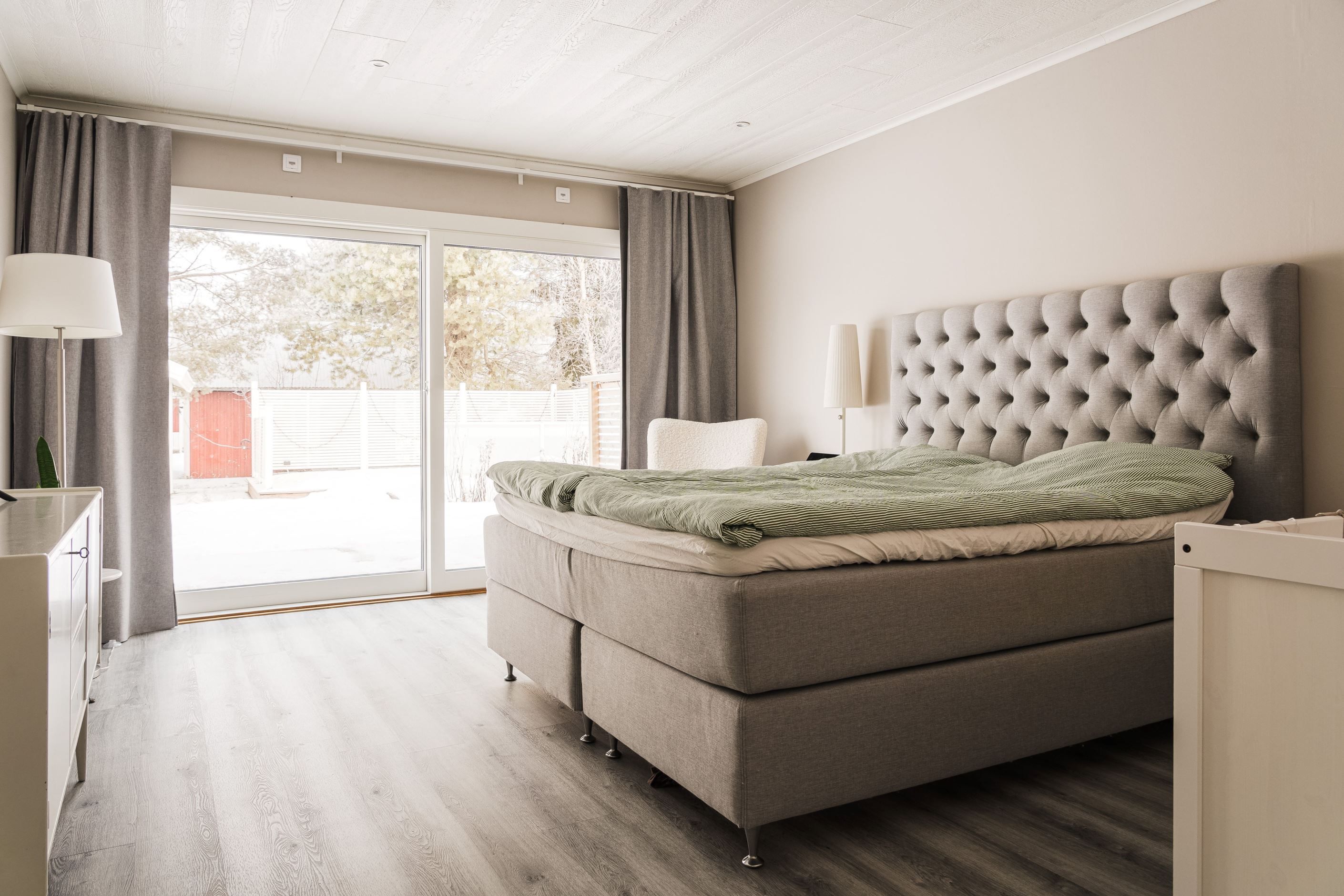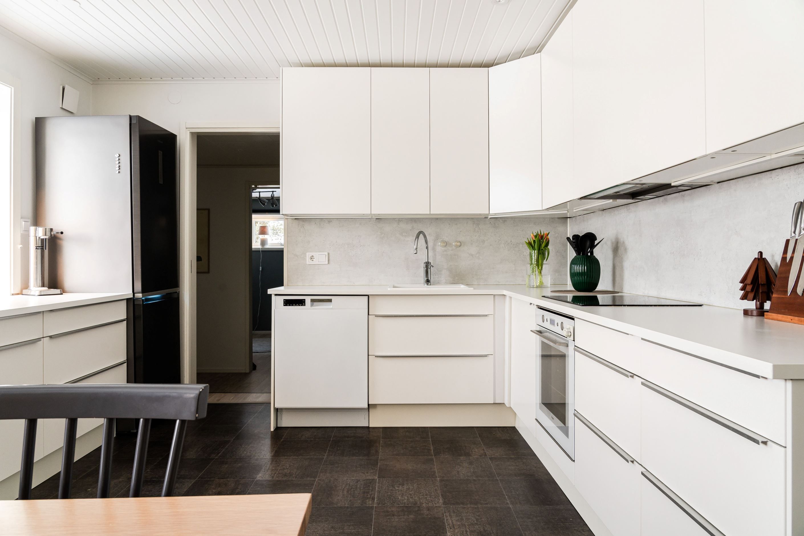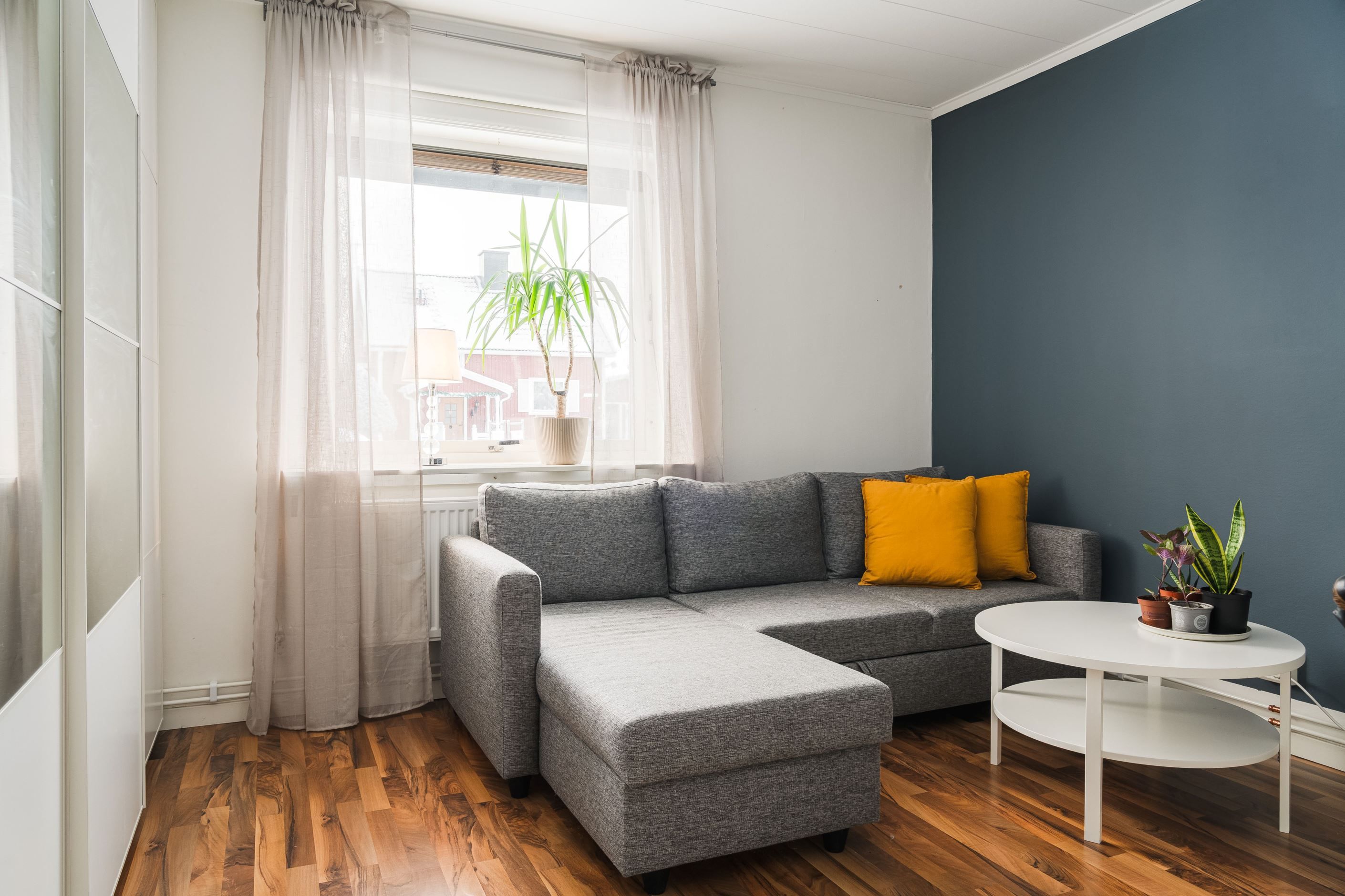 Trevlig planlösning med hall, gästtoalett, rymligt kök, kontor, vardagsrum och tre sovrum, varav ett större rum som även passar utmärkt som matrum. Här finns gott om plats att bjuda in familj och vänner till trevliga middagar. De stora skjutdörrarna i glas ger ett generöst ljusinsläpp och skapar en naturlig förlängning av rummet ut mot altanen på baksidan.