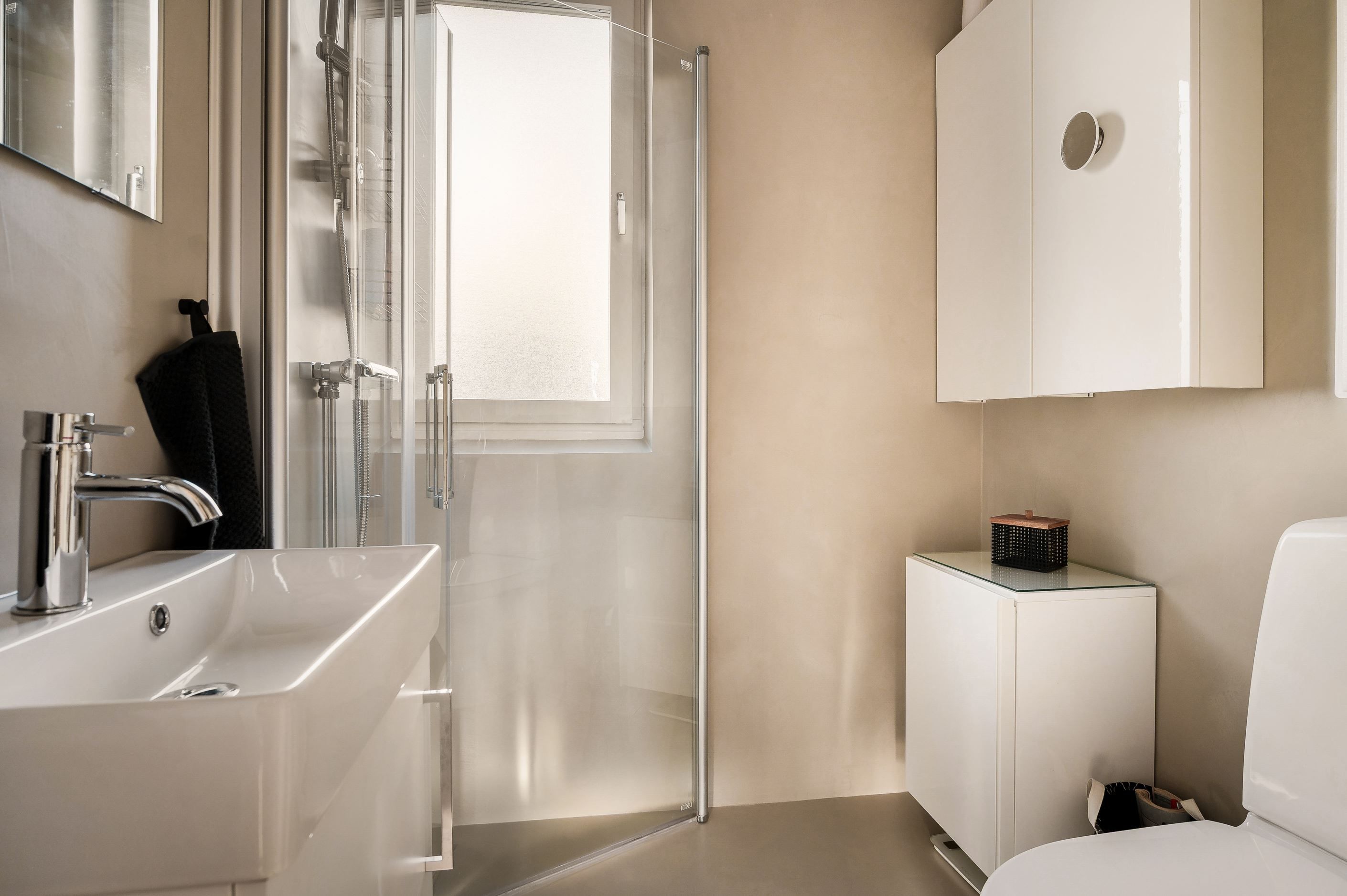 Badrummet ytskiktsrenoverades under 2025 och är snyggt utformat.