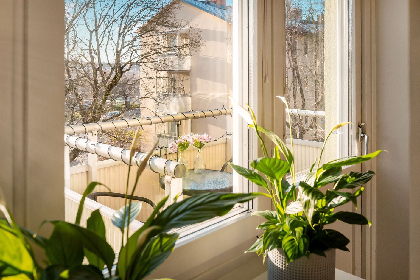 Här finns två sovrum (varav ett med en rejäl klädkammare!), ett stort och lättmöblerat vardagsrum med balkong i sydväst inbäddat bland träden.