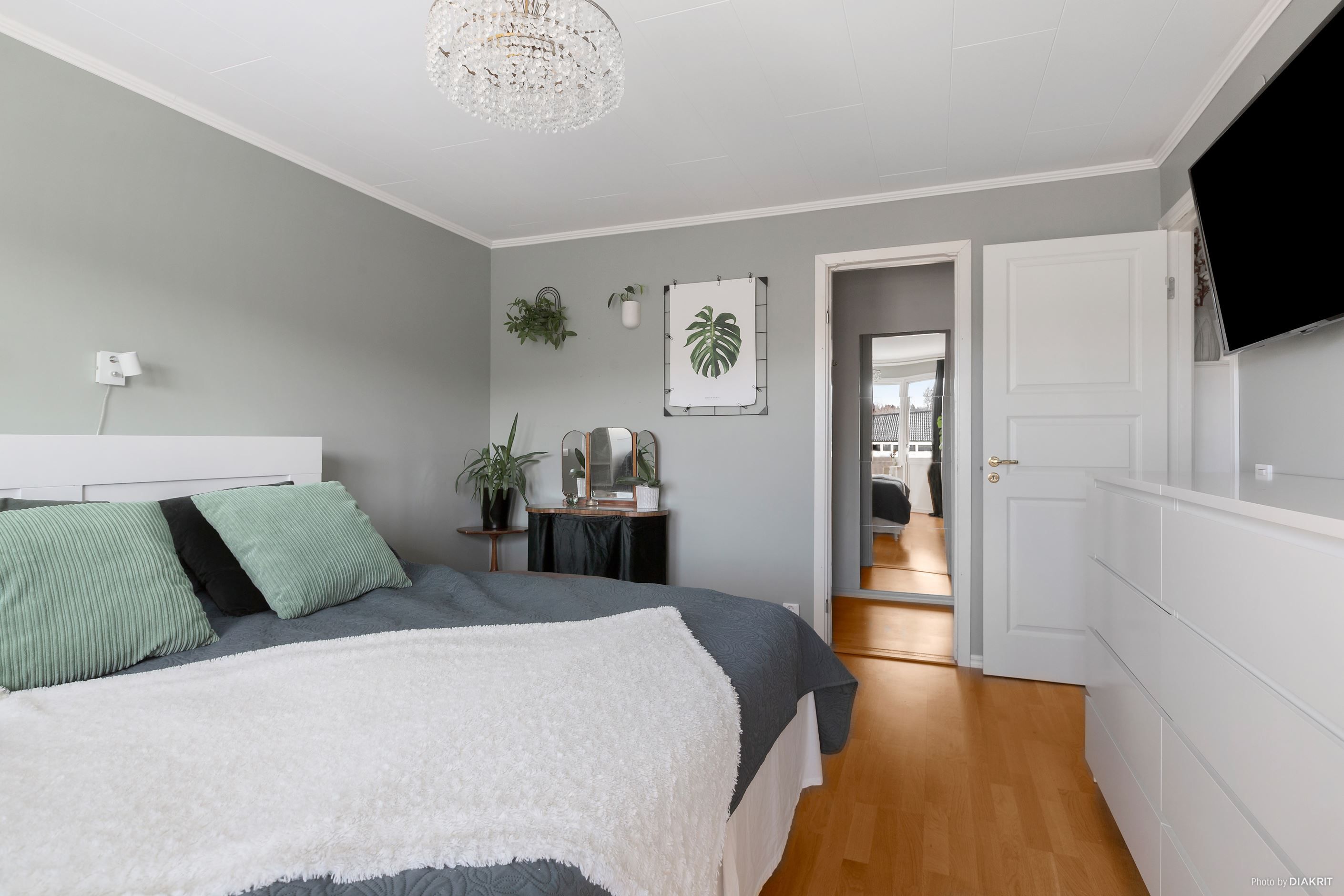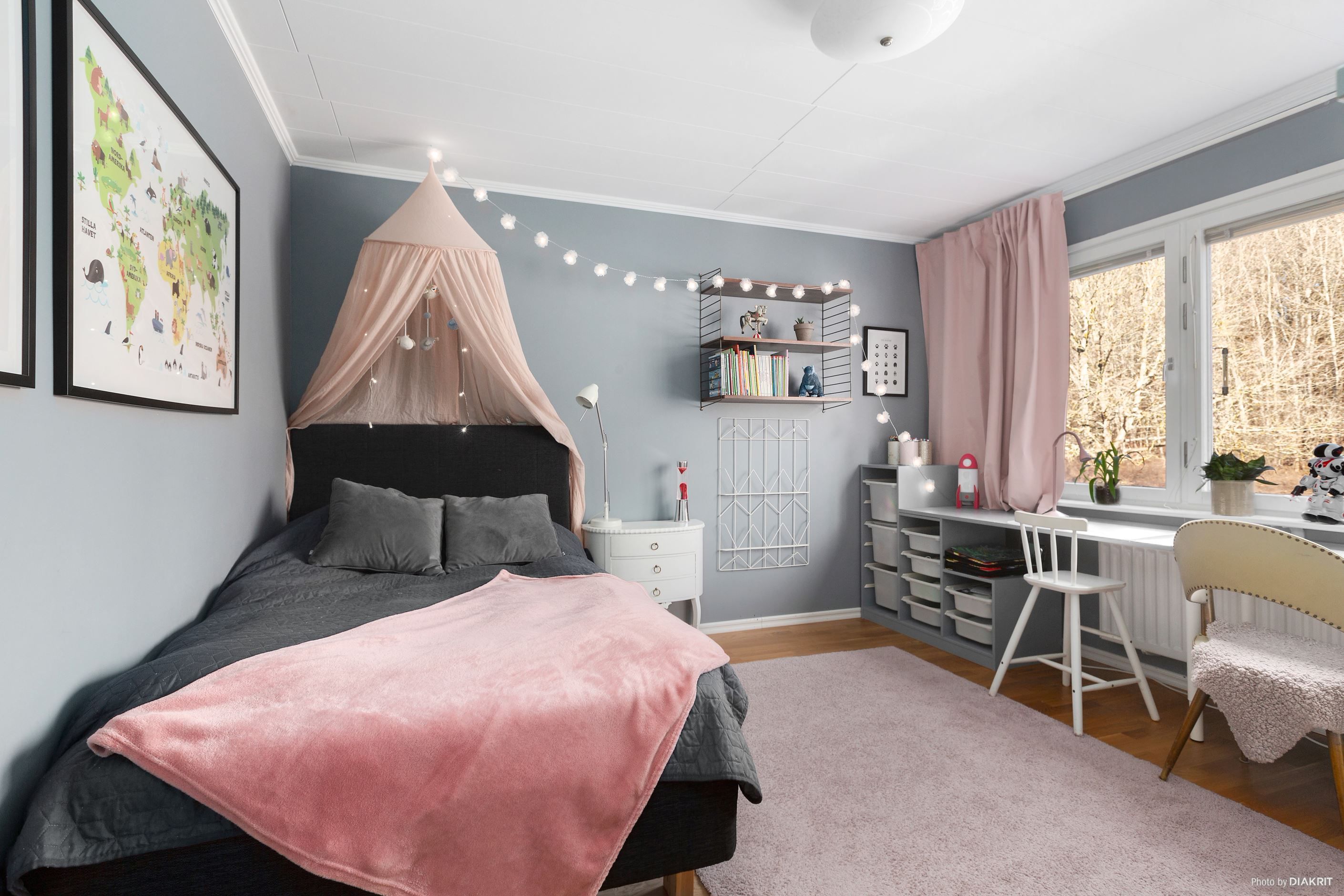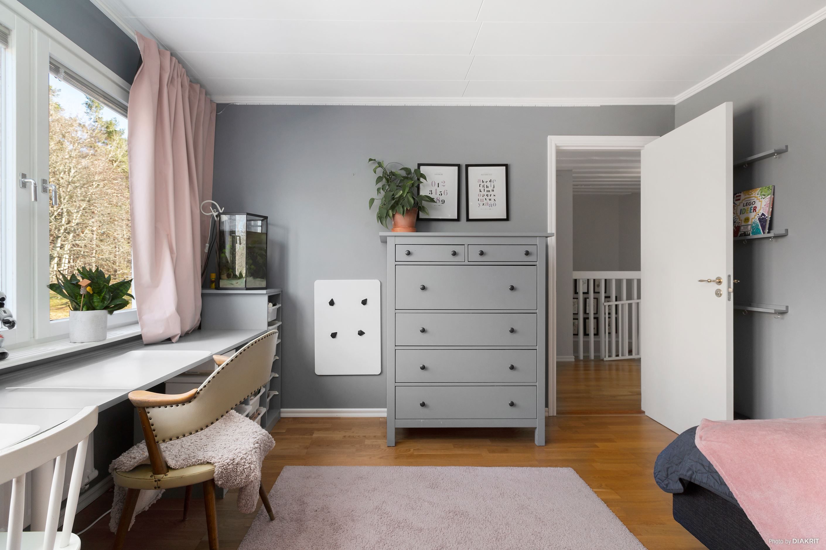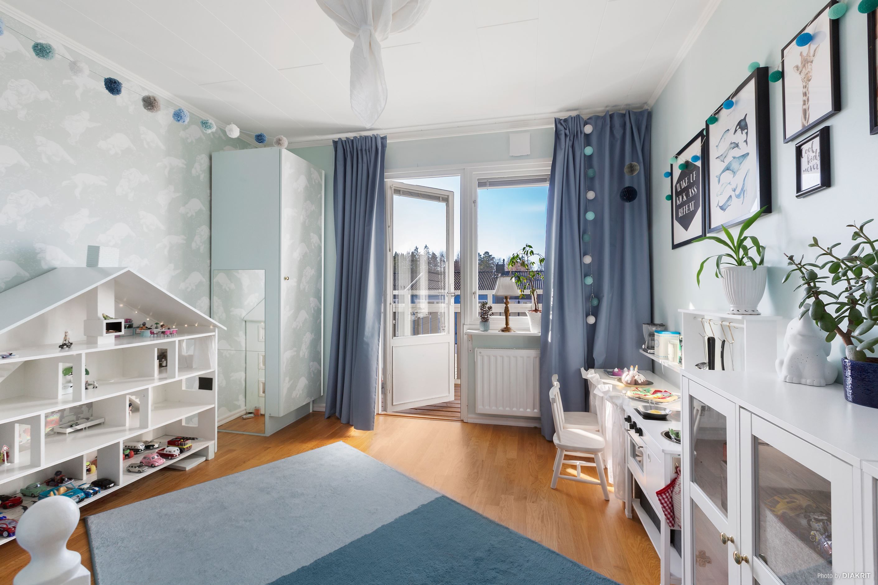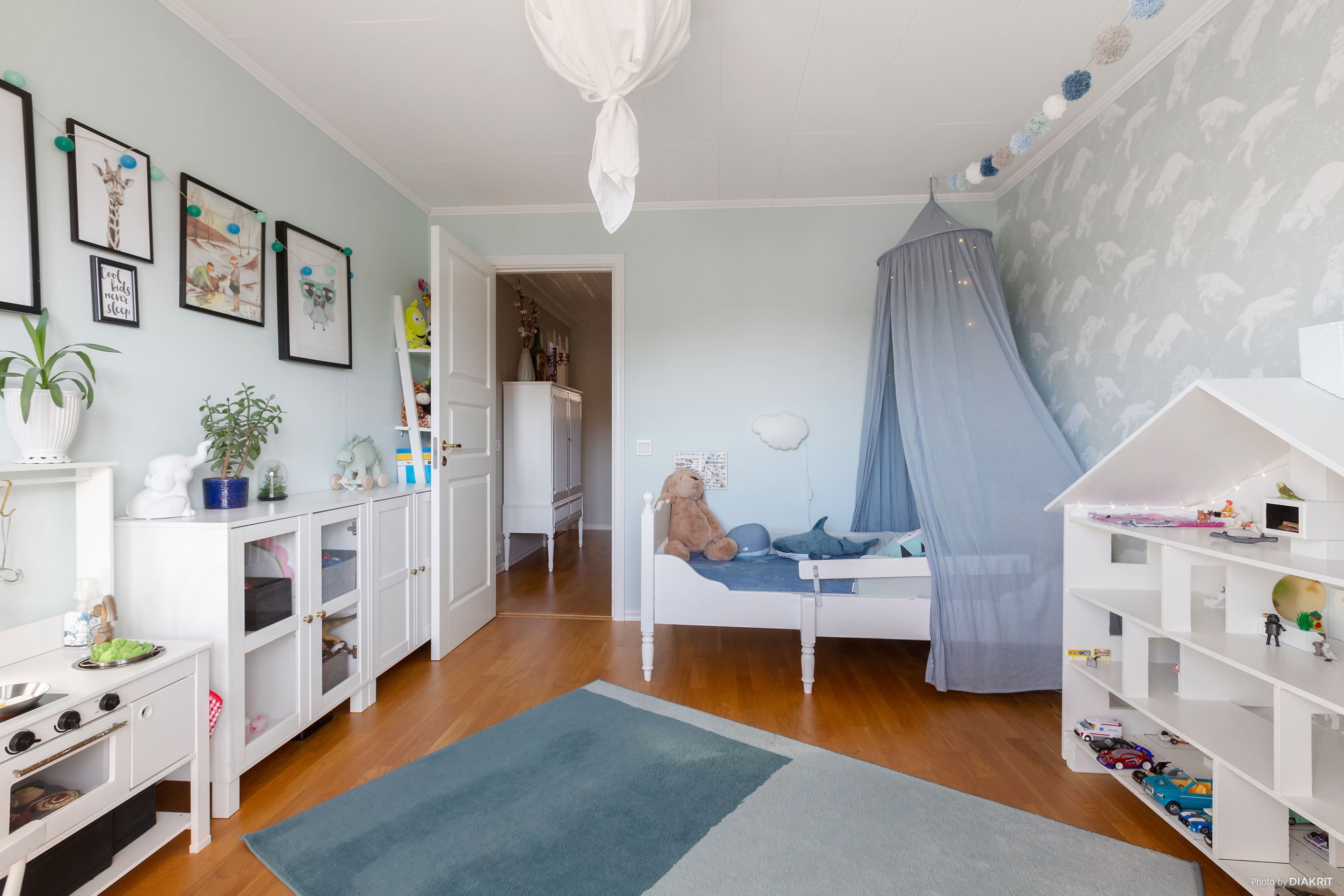 Övre plan erbjuder tre stora och lättmöblerade sovrum, klädkammare med tillgång till taklucka till vinden samt WC-/badrum. Här finns gott om plats för den växande familjen, hemmakontor eller gästrum efter behov.