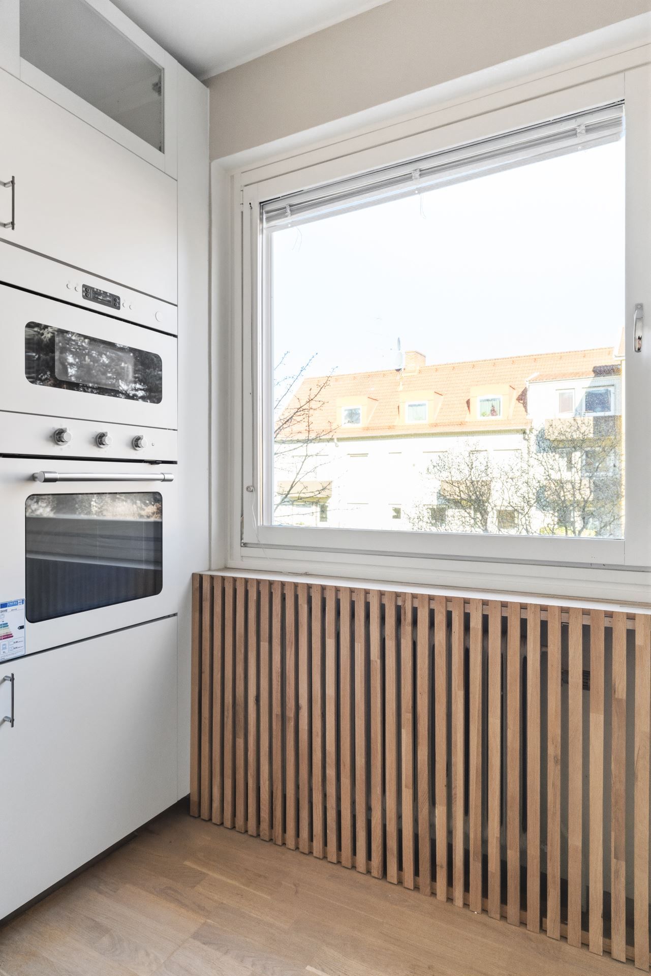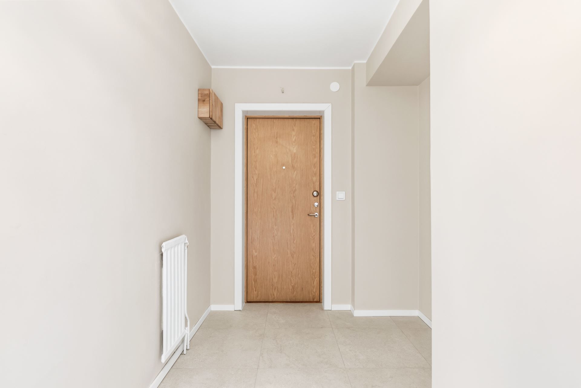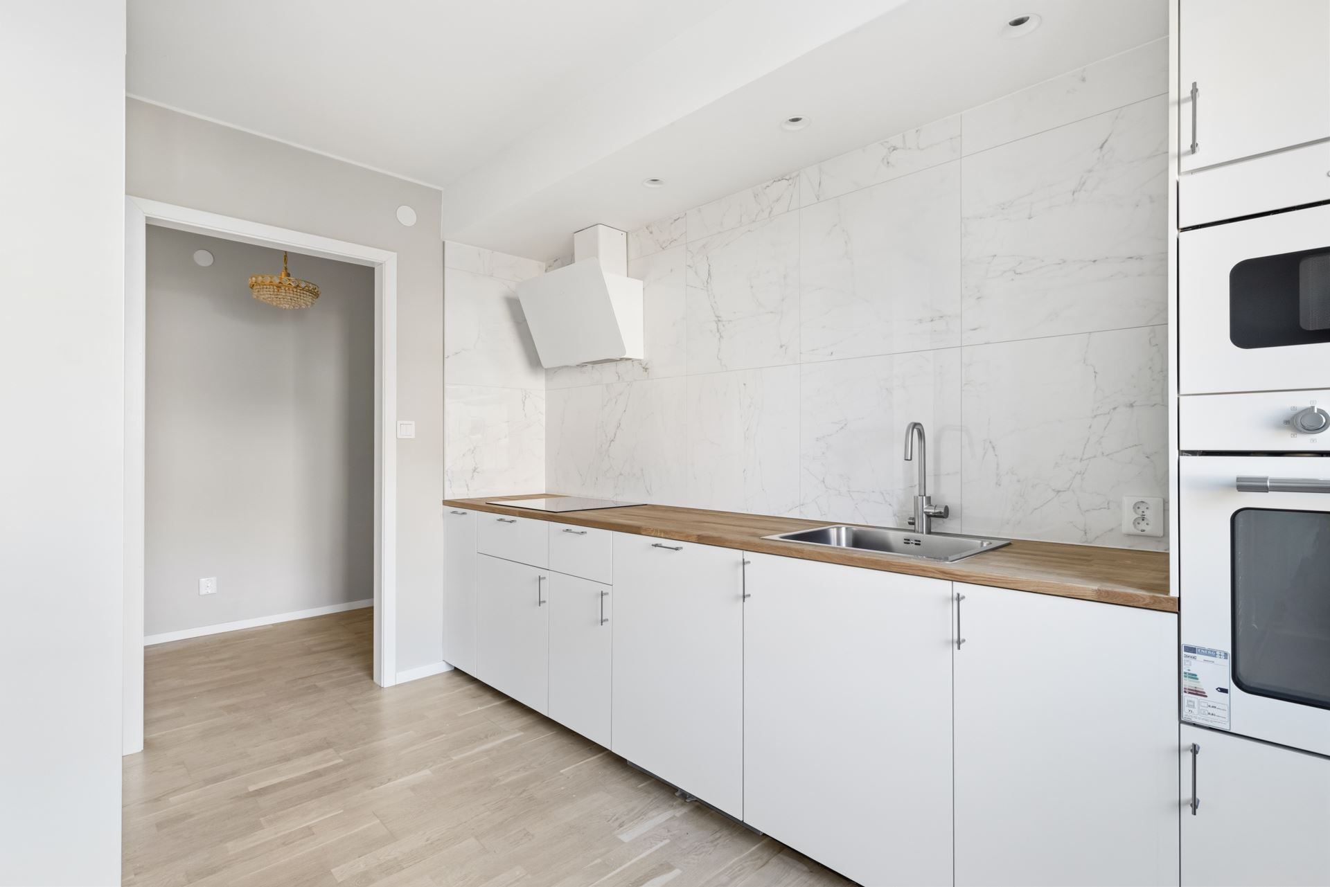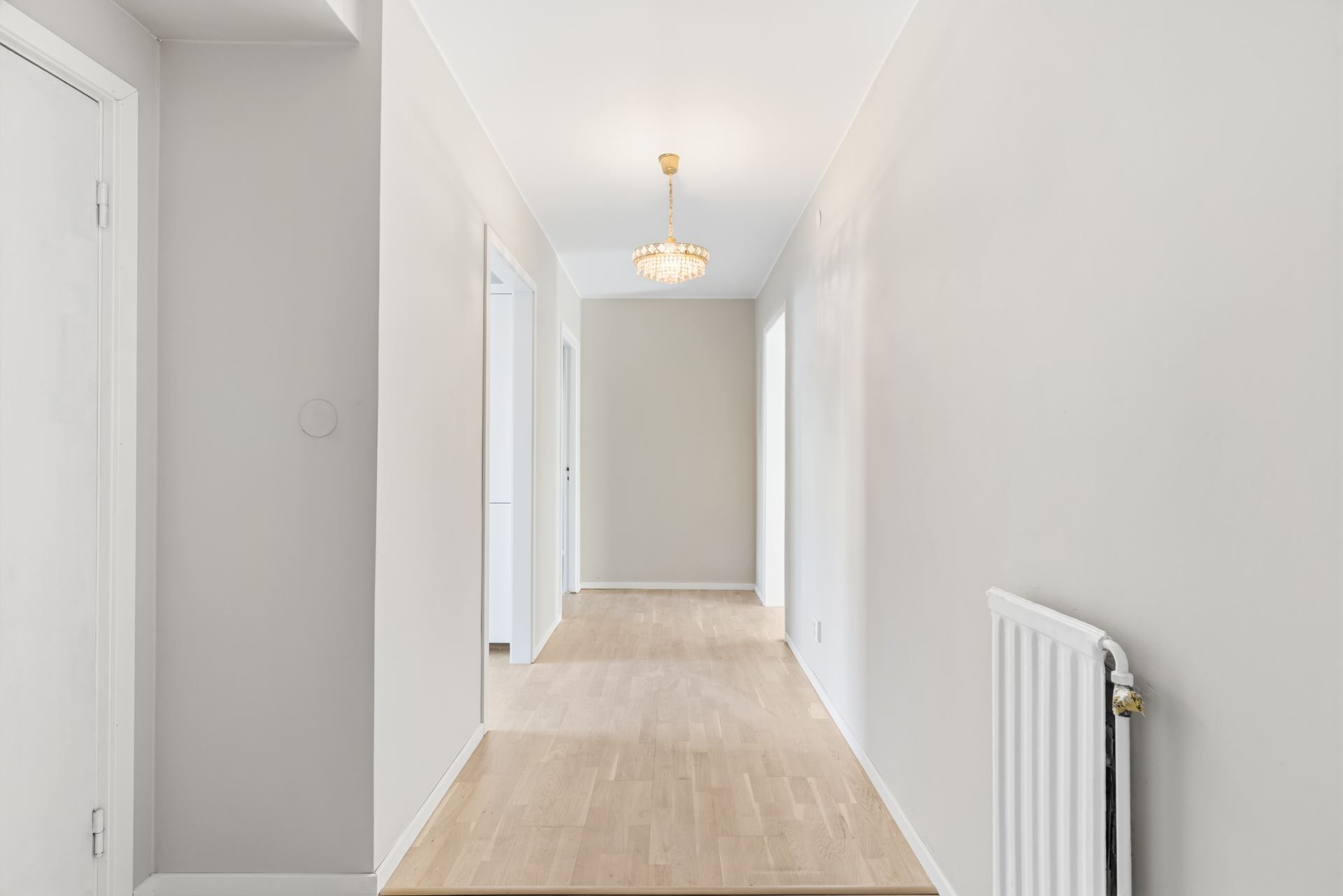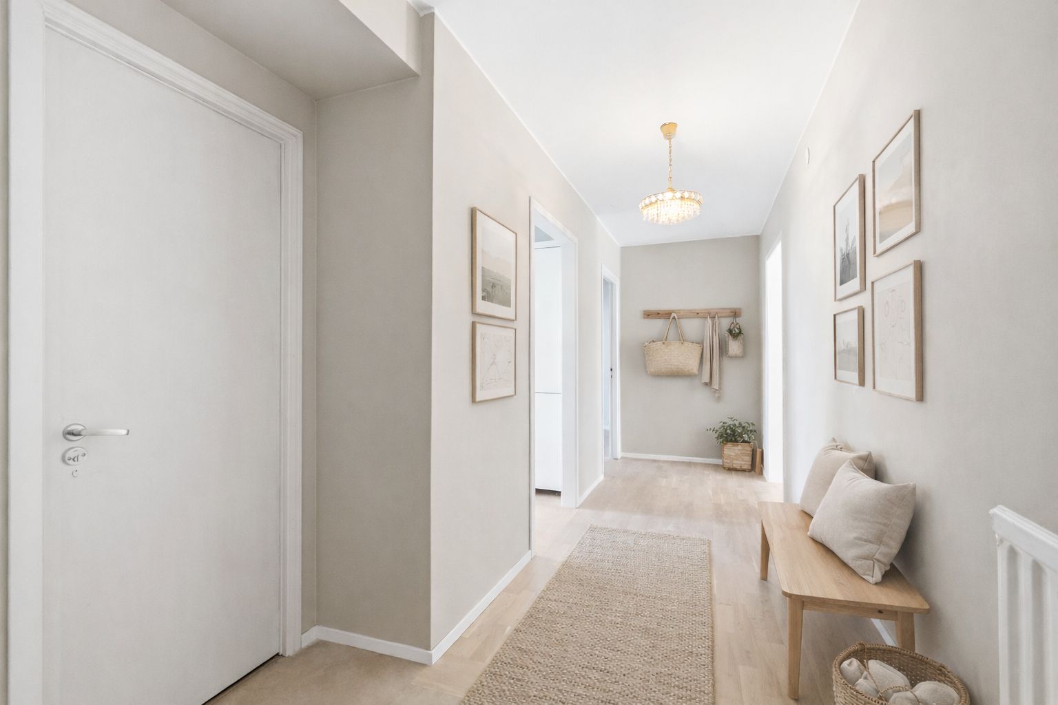 Redan i hallen möts du av det vackra ekparkettgolvet som löper vidare genom bostaden och skapar ett harmoniskt helhetsintryck. Färgskalan är neutral och tidlös, vilket ger en lugn bas att inreda efter – oavsett stil.